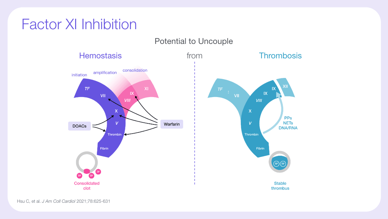 FXI inhibitors act upstream in the intrinsic pathway, offering a potential way to uncouple thrombosis from hemostasis, a new mechanistic approach to thrombosis prevention & management.