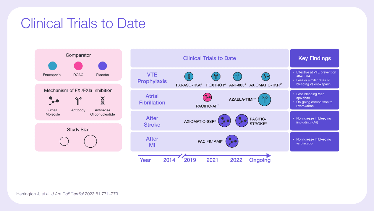 - Clinical studies of FXI inhibition to date have investigated their role in VTE, AF, stroke, and MI (e.g., PACIFIC-AF, AXIOMATIC-SSP, PACIFIC-STROKE, AZALEA-TIMI 71), with phase 3 trials ongoing in abelacimab, asundexian and milvexian.