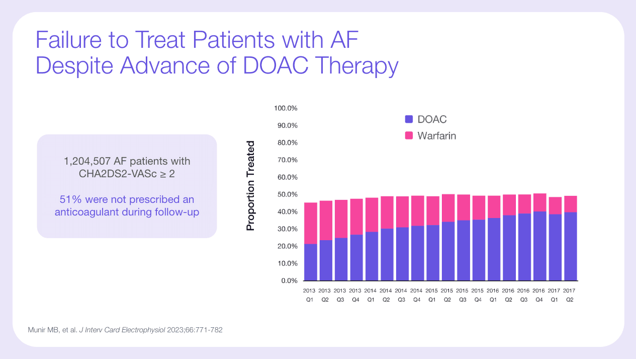 🔹51% of CHA₂DS₂-VASc≥2 never receive anticoagulants.