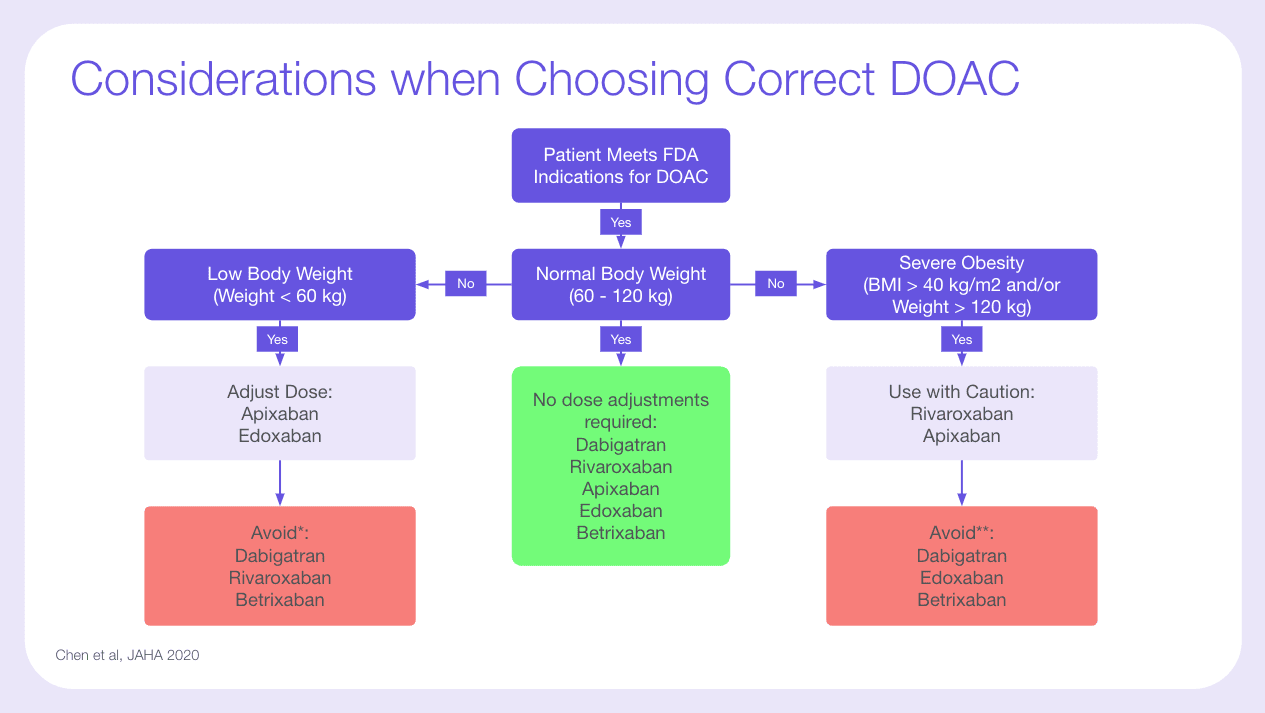 <60 kg → avoid dabigatran/rivaroxaban/betrixaban