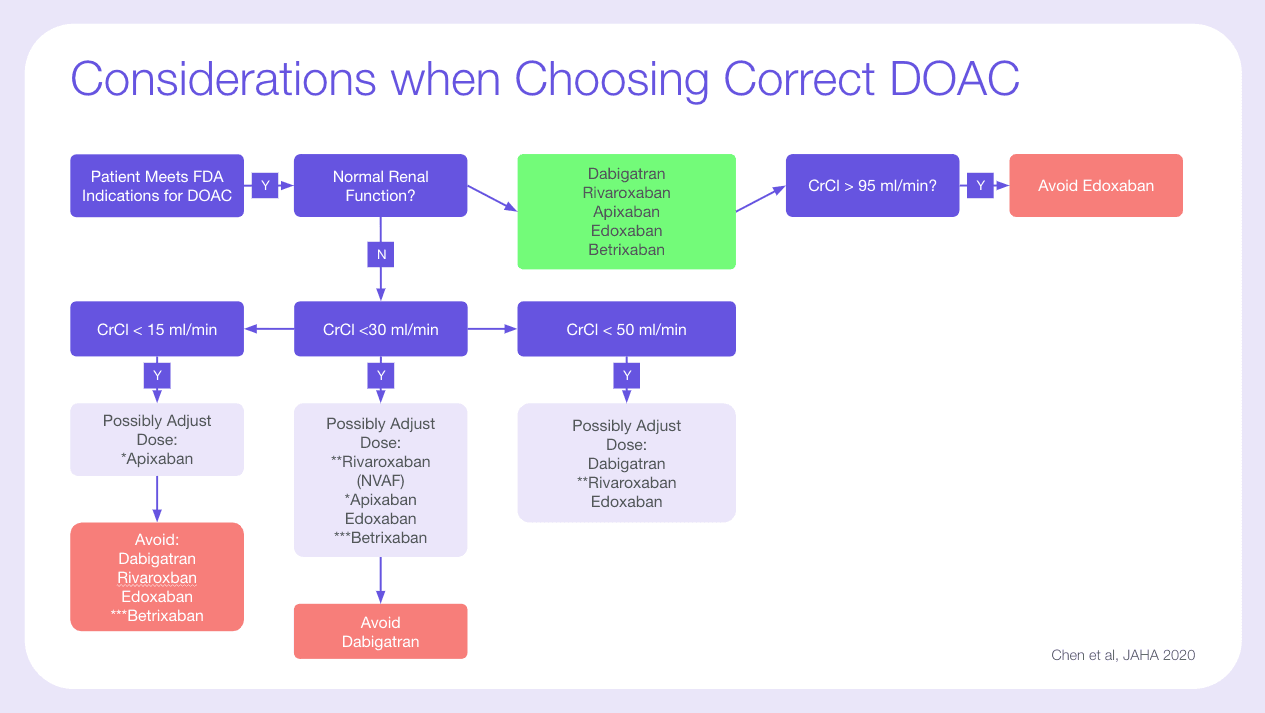 CrCl<15→only consider apixaban; <30→avoid dabigatran; >95→avoid edoxaban.