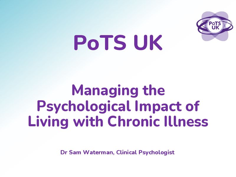 Dr Sam Waterman is a clinical psychologist who currently works in neurological rehabilitation. She completed her doctorate in clinical psychology in 2020, during which time she developed PoTS and quickly realised that although this research area is growing there was not a huge amount published about peoples lived experience, so she decided to investigate the experiences living with this condition for her thesis research project.