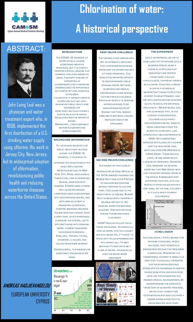 Chlorination of water: A historical perspective ABSTRACT : THE EXPERIMENT INTRODUCTION FIRST MAJOR CHALLENGE THE COVID-19 PANDEMIC OF THE TURNING POINT ARRIVED WITH LEALS EXPERIMENTS LED HIM TO 2019 INITIALLY CAUSED DR . OHN SNOW S DISCOVERY CONCLUDE THAT PATHOGENS COULD WIDESPREAD NEGATIVE THAT CONTAMINATED DRINKING BE ERADICATED BY USING A REACTIONS, BUT IT ULTIMATELY WATER WAS THE PRIMARY SOURCE CHEMICAL COMPOUND THAT IMPARTED CRITICAL LESSONS THAT HUMANITY HAD LONG NEEDED TO OF THESE PANDEMICS . HIS DISRUPTED THEIR PROTEIN LEARN . HE EMPTY SHELVES OF REVELATION PROMPTED EFFORTS STRUCTURES :CALCIUM ANTISEPTICS IN TO DECONTAMINATE PUBLIC HYPOCHLORITE ,COMMONLY KNOWN SUPERMARKETS AND PHARMACIES DRINKING WATER . UT NOW , AS CHLORINE . CHLORINE,ALREADY UNDERSCORED THE IMPORTANCE SCIENTISTS AND MEDICAL IN USE AS A HOUSEHOLD OF A SIMPLE YET VITAL INVENTION PROFESSIONALS CAME ACROSS DISINFECTANT THANKS TO SCOTTISH OF MODERN CIVILIZATIO:A HUMBLE CHEMICAL THE FIRST MAJOR CHALLENGE . CHEMIST CHARLES TENNANT ,WAS FROM WHAT EXACTLY IS DRINKING MET WITH SKEPTICISM AND CONCERN COMPOUND THAT NOT ONLY JohnLaingLeal wasa ENHANCED PUBLIC HEALTH AND WATER SUPPOSED TO BE DUE TO ITS ODOR,EYE IRRITATIO, INCREASED LIFE DECONTAMINATED FROM ? AND TOXICITY. EVERTHELESS ,L EAL EXPECTANCY BUT ALSO PLAYED A physicianand water DURING THAT TIME,NOBODY WAS CONVINCED THAT ,IN THE PIVOTAL ROLE IN THE SEXUAL KNEW ABOUT BACTERIA ,VIRUSES, CORRECT CONCENTRATION , REVOLUTION AND THE ADVENT OF treatmentexpertwho,in BIKINI. PROTOZOA AND OTHER CHLORINE COULD SAFELY PATHOGENS DECONTAMINATE WATER . DESPITE REMARKABLY , THESE SEEMINGLY 1908,implementedthe DISPARATE ELEMENTS ARE INITIAL RESISTANCE FROM THE INTERCONNECTED . SCIENTIFIC COMMUNITY,L EAL firstdisinfectionofaU.S. CONDUCTED A BOLD EXPERIMENT IN 1908. H E CLANDESTINELY drinkingwatersupply BACKROUND INFORMATION INTRODUCED GALLONS OF CHLORINE TO THOSE WHO BELIEVED THAT INTO THE MAIN WATER TANK using chlorine.Hisworkin PUBLIC HEALTH WAS IN CRISIS SUPPLYING OVER 200,000 PEOPLE DURING THE COVID-19 INN EW JERSEY. HREE MONTHS JerseyCity,NewJersey, PANDEMIC ,IT IS CRUCIAL TO SECOND MAJOR CHALLENGE LATER,HE WAS ARRESTED ON ledtowidespreadadoption CONSIDER THE CONDITIONS OF THE CHARGES OF TERRORISM .H OWEVER , EARLY20 TH CENTURY THE ADVENT OF HIGH-QUALITY LEAL DEFENDED HIS ACTIONS, ofchlorination, METROPOLISES SUCH AS NEW ASSERTING THATN EW JERSEY NOW MICROSCOPES BY ZEISS OPTICAL IN Y ORK CITY,PARIS,AND LONDON . THE 1870 S ENABLED PIONEERS LIKE HAD THE SAFEST DRINKING WATER IN revolutionizingpublic THESE CITIES,AKIN TO SPRAWLING THE WORLD . UBSEQUENT DATA R OBERT KOCH AND LOUIS PASTEUR FAVELAS,WERE RIFE WITH TO DISCOVER BACTERIA AND SUPPORTED HIS CLAIM ,AS CHILD healthandreducing DISEASES. STREETS WERE LITTERED MORTALITY RATES HALVED WITHIN A DEVELOP METHODS TO CULTURE waterbornediseases WITH HORSE EXCREMENT , THEM ,THUS GIVING RISE TO THE FEW YEARS . T THE TIM,THE DEATH CEMETERIES WERE OVERCROWDED OF A CHILD WAS A COMMON GERM THEORY OF DISEASE.R OBERT acrosstheUnitedStates. WITH DECOMPOSING BODIES ,AND KOCH SUBSEQUENTLY INVENTED A OCCURRENCE BUTCHERS SOLD MEAT IN RELIABLE METHOD TO TEST UNSANITARY CONDITIONS , DRINKING WATER FOR BACTERIAL CREATING BREEDING GROUNDS COLONIES . AND NOW WE COME FOR BACTERIA AND VIRUSES. EVEN ACROSS THE SECOND MAJOR A HEAVY RAI, WHILE TEMPORARILY CHALLENGE . CLEANSING THE STREETS,LED TO EFFLUENT MIXING WITH DRINKING HOW? H OW DO YOU GET RID OF THOSE PATHOGENS . OU BASICALLY WATER ,THEREBY TRIGGERING SUCCESSIVE PANDEMICS . HAVE AN ANIMAL THAT YOU CANNOT CONCLUSION SEE WITH NAKED EYE,IT“HUNTS ” IN SMALLPOX ,TETANUS ,TYPHUS , DYSENTERY ,CHOLERA ,AND PACKS WITH TRILLION MEMBERS AND N CONCLUSION ,IFIRMLY BELIEVE THAT YOU CANNOT KILL I’S NEST ASPIRING PHYSICIANS,MYSELF YELLOW FEVER WERE RAMPANT . BECAUSE ITS NEST MIGHT BE A INCLUDED ,MUST EXTEND OUR CONSEQUENTLY ,THE AVERAGE LIFE GLASS OF WATER,YOUR BODY OR ENGAGEMENT BEYOND THE PRESCRIBED EXPECTANCY STAGNATED AT 40 EVEN THE ENTIRE WATER CURRICULUM . MASTERING THE YEARS. TREATMENT ! FUNDAMENTAL CONTENT IS MERELY THE FIRST STE.IT IS EQUALLY IMPERATIVE THAT WE ACKNOWLEDGE AND APPRECIATE THE PIONEERING SCIENTISTS WHOSE DEDICATION AND SACRIFICES HAVE LAID THE FOUNDATION FOR MODERN MEDICAL ADVANCEMENTS . BY UNDERSTANDING THE HISTORICAL ANDREAS HADJIEVANGELOU TRAJECTORY OF SCIENTIFIC PROGRESS, WE NOT ONLY HONOR THEIR EUROPEANUNIVERSITY CONTRIBUTIONS BUT ALSO CULTIVATE A DEEPER APPRECIATION FOR THE CYPRUS KNOWLEDGE WE HAVE TODAY .