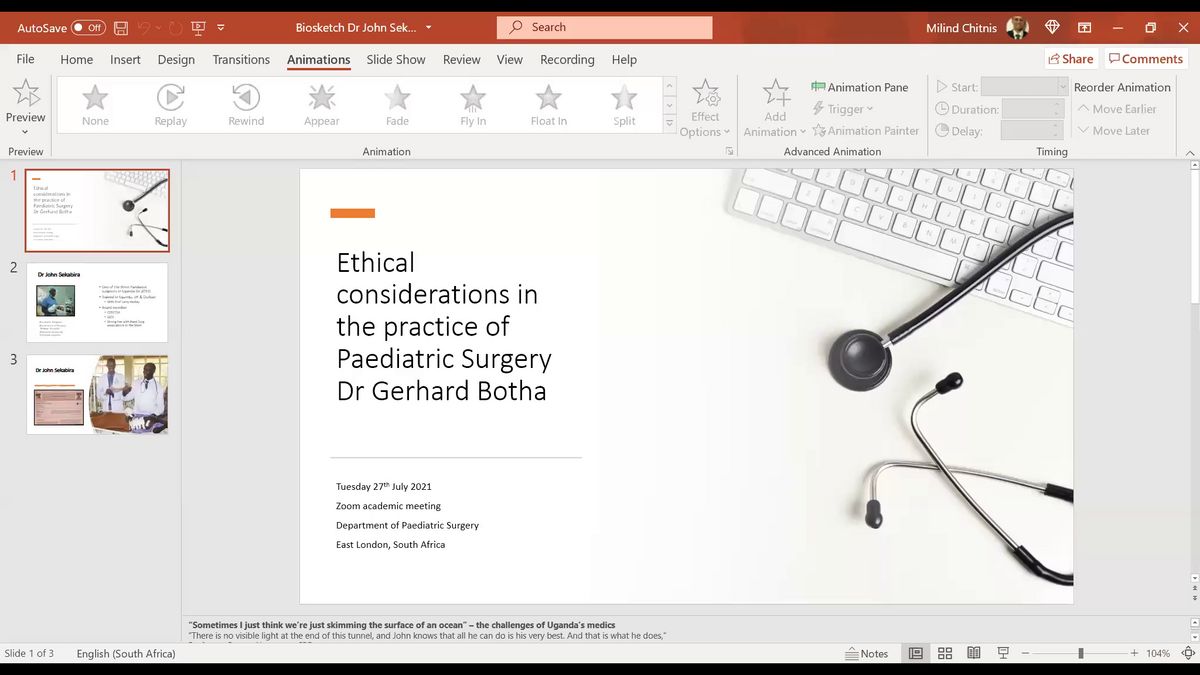 "Ethics and Paediatric Surgery" Dr Gerhard Botha, Paediatric Surgery, East London + comments and advice by Dr John Sekabira, Uganda. This is the recording of a talk as a part of the Zoom academic meetings of the Department of Paediatric Surgery in East London, South Africa.