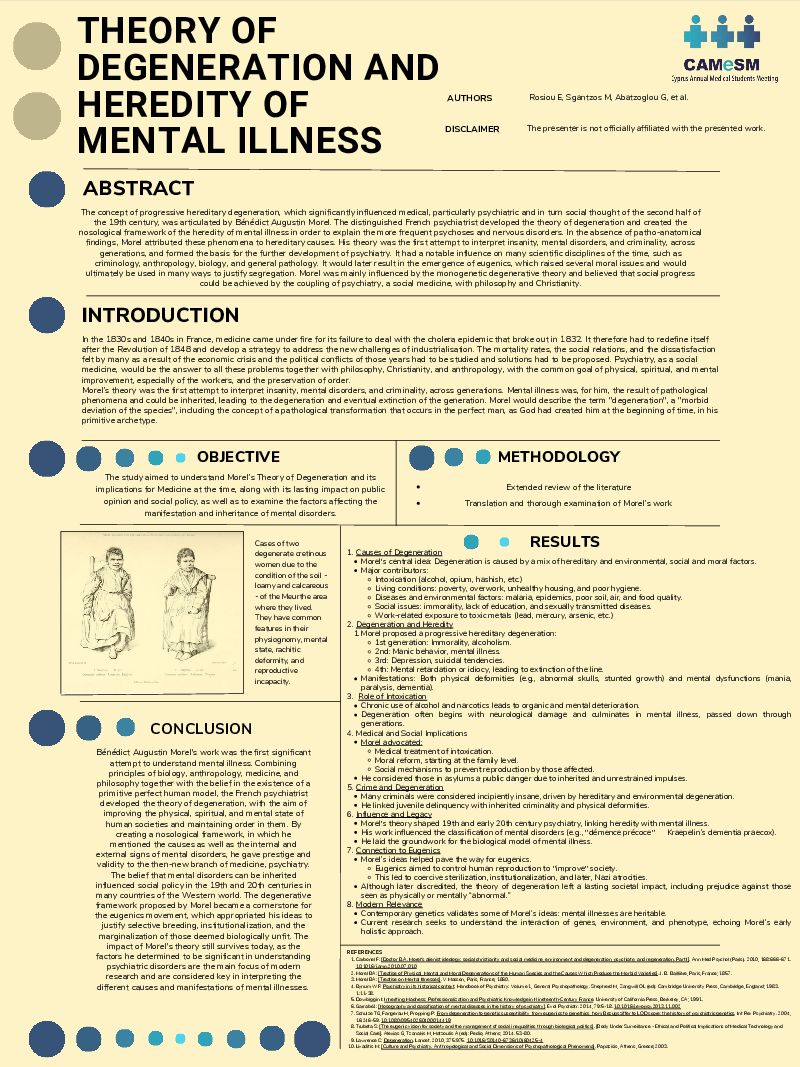 THEORY OF DEGENERATION AND AUTHORS Rosiou E, Sgantzos M, Abatzoglou G, et al. HEREDITY OF DISCLAIMER The presenter is not officially affiliated with the presented work. MENTAL ILLNESS ABSTRACT The concept of progressive hereditary degeneration, which significantly influenced medical, particularly psychiatric and in turn social thought of the second half of the 19th century, was articulated by Bénédict Augustin Morel. The distinguished French psychiatrist developed the theory of degeneration and created the nosological framework of the heredity of mental illness in order to explain the more frequent psychoses and nervous disorders. In the absence of patho-anatomical findings, Morel attributed these phenomena to hereditary causes. His theory was the first attempt to interpret insanity, mental disorders, and criminality, across generations, and formed the basis for the further development of psychiatry. It had a notable influence on many scientific disciplines of the time, such as criminology, anthropology, biology, and general pathology. It would later result in the emergence of eugenics, which raised several moral issues and would ultimately be used in many ways to justify segregation. Morel was mainly influenced by the monogenetic degenerative theory and believed that social progress could be achieved by the coupling of psychiatry, a social medicine, with philosophy and Christianity. INTRODUCTION In the 1830s and 1840s in France, medicine came under fire for its failure to deal with the cholera epidemic that broke out in 1832. It therefore had to redefine itself after the Revolution of 1848 and develop a strategy to address the new challenges of industrialisation. The mortality rates, the social relations, and the dissatisfaction felt by many as a result of the economic crisis and the political conflicts of those years had to be studied and solutions had to be proposed. Psychiatry, as a social medicine, would be the answer to all these problems together with philosophy, Christianity, and anthropology, with the common goal of physical, spiritual, and mental improvement, especially of the workers, and the preservation of order. Morel’s theory was the first attempt to interpret insanity, mental disorders, and criminality, across generations. Mental illness was, for him, the result of pathological phenomena and could be inherited, leading to the degeneration and eventual extinction of the generation. Morel would describe the term "degeneration", a "morbid deviation of the species", including the concept of a pathological transformation that occurs in the perfect man, as God had created him at the beginning of time, in his primitive archetype. OBJECTIVE METHODOLOGY The study aimed to understand Morel’s Theory of Degeneration and its implications for Medicine at the time, along with its lasting impact on public Extended review of the literature opinion and social policy, as well as to examine the factors affecting the Translation and thorough examination of Morel’s work manifestation and inheritance of mental disorders. Cases of two RESULTS degenerate cretinous 1. Causes of Degeneration women due to the Morel's central idea: Degeneration is caused by a mix of hereditary and environmental, social and moral factors. Major contributors: condition of the soil - Intoxication (alcohol, opium, hashish, etc.) loamy and calcareous Living conditions: poverty, overwork, unhealthy housing, and poor hygiene. - of the Meurthe area Diseases and environmental factors: malaria, epidemics, poor soil, air, and food quality. where they lived. Social issues: immorality, lack of education, and sexually transmitted diseases. They have common Work-related exposure to toxic metals (lead, mercury, arsenic, etc.) features in their 2. Degeneration and Heredity physiognomy, mental 1.Morel proposed a progressive hereditary degeneration: 1st generation: Immorality, alcoholism. state, rachitic 2nd: Manic behavior, mental illness. deformity, and 3rd: Depression, suicidal tendencies. reproductive 4th: Mental retardation or idiocy, leading to extinction of the line. incapacity. Manifestations: Both physical deformities (e.g., abnormal skulls, stunted growth) and mental dysfunctions (mania, paralysis, dementia). 3. Role of Intoxication Chronic use of alcohol and narcotics leads to organic and mental deterioration. Degeneration often begins with neurological damage and culminates in mental illness, passed down through generations. CONCLUSION 4. Medical and Social Implications Morel advocated: Bénédict Augustin Morel's work was the first significant Medical treatment of intoxication. attempt to understand mental illness. Combining Moral reform, starting at the family level. principles of biology, anthropology, medicine, and Social mechanisms to prevent reproduction by those affected. philosophy together with the belief in the existence of a He considered those in asylums a public danger due to inherited and unrestrained impulses. primitive perfect human model, the French psychiatrist 5. Crime and Degeneration developed the theory of degeneration, with the aim of Many criminals were considered incipiently insane, driven by hereditary and environmental degeneration. improving the physical, spiritual, and mental state of He linked juvenile delinquency with inherited criminality and physical deformities. 6. IMorel's theory shaped 19th and early 20th century psychiatry, linking heredity with mental illness. human societies and maintaining order in them. By His work influenced the classification of mental disorders (e.g., "démence précoce" → Kraepelin’s dementia praecox). creating a nosological framework, in which he He laid the groundwork for the biological model of mental illness. mentioned the causes as well as the internal and 7. Connection to Eugenics external signs of mental disorders, he gave prestige and Morel’s ideas helped pave the way for eugenics. validity to the then-new branch of medicine, psychiatry. Eug