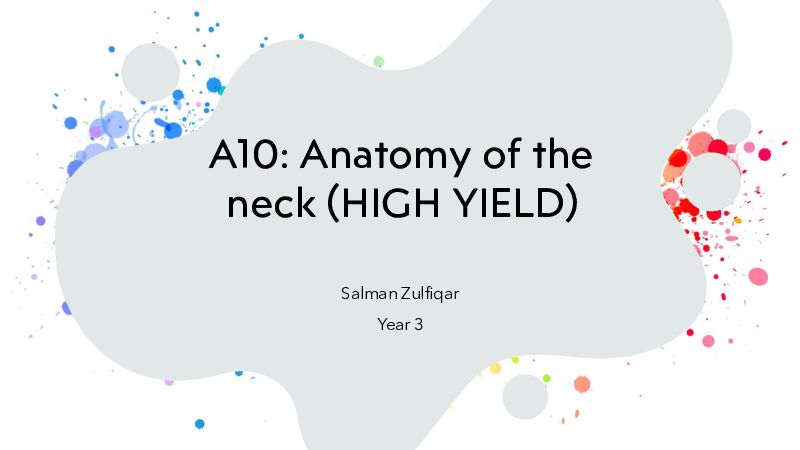 A10: Anatomy of the neck (HIGH YIELD) Salman Zulfiqar Year 3Learning Objectives At the end of todays session you should be able to: • State the boundaries of the neck. • Understand the surface anatomy of the neck • State the boundaries of the anterior and posterior triangles of the neck and their sub- triangles, and list the contents of each • Brief run through of the Branches of the External Carotid Artery Palpable Structures Hyoid Bone – C3 Thyroid Cartilage –C4 Cricoid Cartilage –C6 Thyroid Gland isthmus – C7 Suprasternal notch –T2/T3 Sternocleidomastoid The Sternocleidomastoid consists of: 1) Sternal head that arises from manubrium of Sternum 2) Clavicular head that arises from medial third of Clavicle The muscle inserts into the mastoid process of the temporal bone and the superior nuchal line of the occipital bone It can separate the neck into two triangles: Anterior and Posterior triangles What are the Anterior Triangles? 1. Submental 2. Submandibular 3. Carotid 4. Muscular Boundaries of the Anterior Triangle Anterior Boundary – Midline of the Neck Posterior Boundary – Anterior part of SCM Superior Boundary - Mandible Submental Triangle -It’s located beneath the Chin Inferior Boundary: Hyoid Bone Medial Boundary: Midline of Neck Lateral Boundary :Posterior Belly of Digastric Submandibular Triangle -Located Underneath the Mandible Superior Boundary - Inferior Border of Mandible Anterior Boundary - Anterior Belly of Digastric Posterior Boundary - Posterior Belly of Digastric Carotid Triangle - Located Lateral to the Larynx Superior – Posterior Belly of Digastric Lateral – Medial part of SCM Inferior – Superior Belly of Omohyoid Muscular Triangle - It’s situated more inferiorly than the other subdivisions Superior Boundary – Hyoid Bone Medial Boundary – Medial Boundary of Neck Superolateral Boundary – Superior Belly of Omohyoid Muscle Inferolateral Boundary - Inferior Belly of Omohyoid Muscle Boundaries of the Posterior Triangle Posterior Boundary – Trapezius Anterior Boundary – Posterior Border of SCM Inferior Boundary - Clavicle Occipital Triangle Boundaries Anterior – Posterior Border of SCM Posterior – Trapezius Inferior - Inferior Belly of Omohyoid Supraclavicular/Subclavian Triangle Boundaries Anterior Boundary – SCM Posterior Boundary – Inferior Belly of Omohyoid Inferior Boundary- Clavicle Contents of the Anterior Triangle Nerves (2) Phrenic (?) and Vagus Nerve Arteries (3) Common CCA,ICA, ECA Veins (1) Internal Jugular Vein Glands (3) Submandibular,Thyroid and Parathyroid Others (3) Trachea, Oesophagus and Infrahyroid Muscles Disclaimer: Phrenic nerve is widely regarded as being in Posterior triangle but wrap-up has it in Anterior Contents of the Posterior Triangle Muscles (2) Inferior belly of Omohyoid,Suprahyoid Muscles Arteries (1) Subclavian Artery Veins (1) External Jugular Vein Nerve (1) CN Xl Plexus’ (2) Trunks of Brachial Plexus, Branches of Cervical Plexus Vessels (2) Suprascapular and Transverse Cervical Vessels Suprahyoid muscles - The suprahyoid muscles are a group of four muscles located superior to the hyoid bone of the neck. They all act to elevate the hyoid bone – an action involved in swallowing - The four Suprahyoid muscles are: 1. Digastric (Anterior and Posterior Belly) 2. Geniohyoid 4. Stylohyoid Infrahyoid Muscles - Contraction of the infrahyoid muscles depresses the hyoid bone - It can be split into 4 Groups: 1. Omohyoid (Superior and Inferior Belly) 2. Sternohyoid 3. Sternothyroid 4. Thyrohyoid External Carotid Artery - The Common Carotid Bifurcates into ICA and ECA at level C4 at Upper border of Thyroid Gland (Adams Apple level). - - The External Carotid has various branches that can be split into the following groups: • Terminal Branches – Maxillary and Superficial Temporal • Anterior Branches – Facial,Lingual and Superior Thyroid • Medial Branch – Ascending Pharyngeal • Posterior Branches - Occipital and Posterior AuricularExternal Carotid Artery BranchesAny Questions?