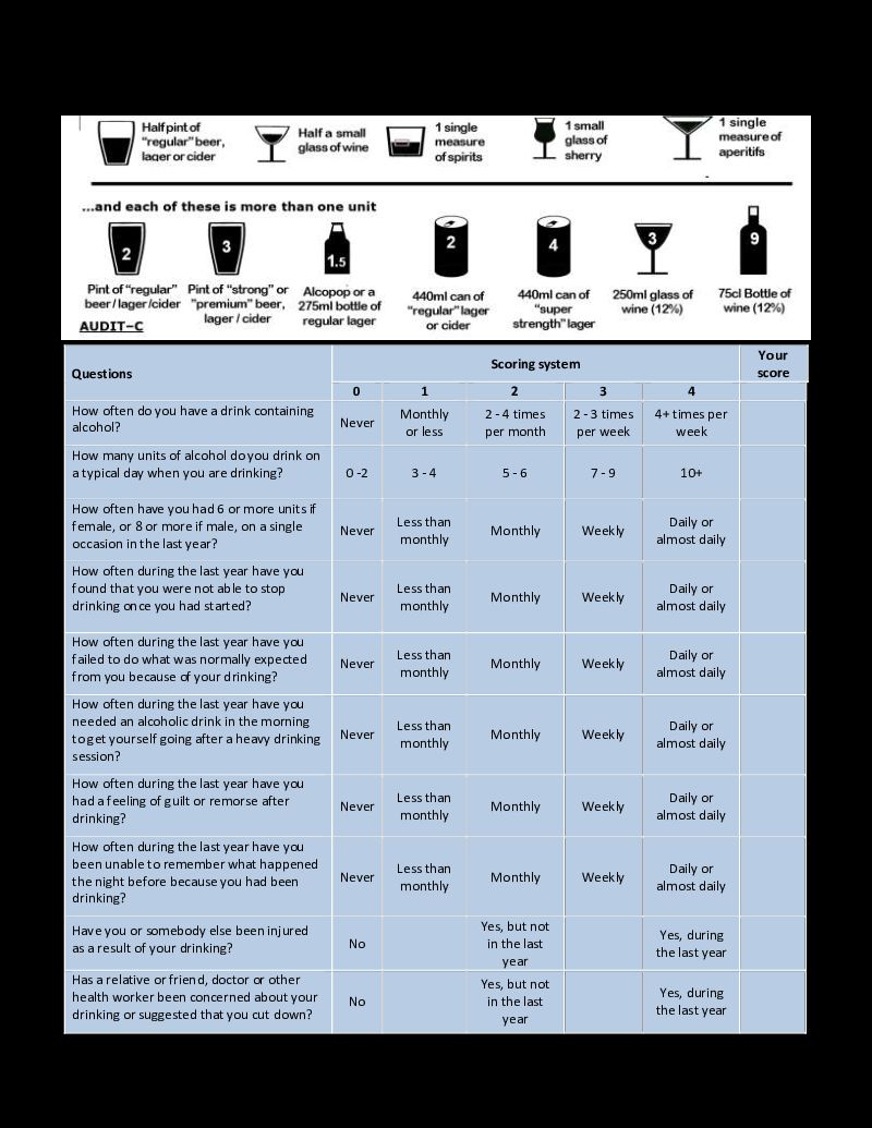 AUDIT – C This isone unit of alcohol… Scoring system Your Questions score 0 1 2 3 4 How often do youhave adrink containing alcohol? Never Monthly 2 - 4 times 2 - 3 times 4+ times per or less per month per week week How many units of alcoholdoyou drink on atypicalday when you are drinking? 0 -2 3 - 4 5 - 6 7 - 9 10+ How often have youhad 6 or more units if female, or 8 or more if male, on asingle Less than Daily or occasion in the last year? Never monthly Monthly Weekly almost daily How often during the last year have you found that you were notable to stop Less than Daily or Never Monthly Weekly drinking once you had started? monthly almost daily How often during the last year have you failed to do what was normally expected Less than Daily or Never monthly Monthly Weekly almost daily from you because of your drinking? How often during the last year have you needed an alcoholic drink in the morning Never Less than Monthly Weekly Daily or to get yourself going after aheavy drinking monthly almost daily session? How often during the last year have you had afeeling of guiltor remorse after Never Less than Monthly Weekly Daily or drinking? monthly almost daily How often during the last year have you been unable to remember whathappened the night before because you had been Never Less than Monthly Weekly Daily or monthly almost daily drinking? Have you or somebody else been injured Yes, butnot Yes, during as aresult of your drinking? No in the last the last year year Has arelative or friend, doctor or other Yes, butnot health workerbeen concerned aboutyour Yes, during No in the last the last year drinking or suggested thatyou cutdown? year