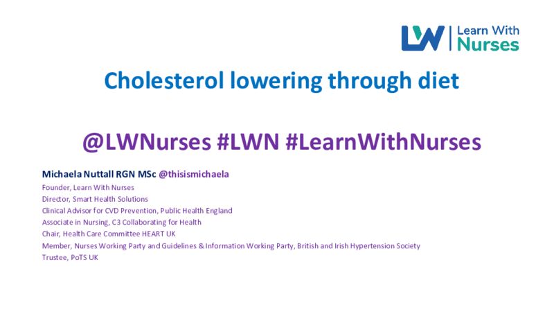 Cholesterol lowering through diet @LWNurses #LWN #LearnWithNurses Michaela Nuttall RGN MSc @thisismichaela Founder, Learn With Nurses Director, Smart Health Solutions Clinical Advisor for CVD Prevention, Public Health England Associate in Nursing, C3 Collaborating for Health Chair, Health Care Committee HEART UK Member, Nurses Working Party and Guidelines & Information Working Party, British and Irish Hypertension Society Trustee, PoTS UKCholesterol and diet What is cholesterol? substance which is mainly produced by the body itself - Vital to all cells; • building block in cell membranes • starting material for bile acids • starting material for certain hormones and vitamin D atherosclerotic cardiovascular diseaseisk ofHIGH CVD RISK BHF (2021) • It’s estimated that close to half of adults in the UK are living with cholesterol levels above national guidelines total cholesterol (greater than 5mmol/L) • People living with heart and circulatory diseases may have an even lower target cholesterol level • Around 7-8 million adults in the UK are currently taking lipid-lowering drugs such as statins We need fat in our diet • An important source of food energy (38 kJ/g, 9 Kcal/g) • Provides and enables the absorption of fat soluble vitamins (A, D, E & K) • Provides the essential fatty acids • Palatability – mouth-feel (fat globules) and carries flavours • Structural lipids (58% body weight) – important in cellular membranes (e.g. brain) • Protects and cushions delicate organs • Substrate for hormone and prostaglandin production • Subcutaneous fat reduces loss of body heat (very important in newborns) HEARTUK.org.uk 6 cholesterol busting foods! • Foods rich in unsaturated fats • Fruit and veg • Oats and barley • Nuts • Foods with added plant sterols and plant stanols • Soya foodsDifferent types of fatty acids Insoluble vs. soluble fibre Insoluble fibre Soluble fibre • This is the fibre that the body can't digest and so it passes • This fibre can be partially digested and through the gut helping other food and waste products move may help to reduce the amount of through the gut more easily. It helps keep bowels healthy cholesterol in the blood and stop constipation. Foods rich in this sort of fibre are more bulky and so help make us feel full, which means we • Particularly good sources of soluble are less likely to eat too much fibre include oats and pulses such as beans and lentils. • Wholegrain bread, brown rice, wholegrain breakfast cereals and fruit and vegetables all contain this type of fibre.24. Gylling H, Plat J, Turley S et al; European Atherosclerosis Society Consensus Panel on Phytosterols. Plant sterols and plant stanols in the management of dyslipidaemia and prevention of cardiovascular disease. Atherosclerosis 2014; 232(2): 346–360. 57. De Jong A, Plat J, Lütjohann D et al. Effects of long-term plant sterol or stanol ester consumption on lipid and lipoprotein metabolism in subjects on statin treatment. Br J Nutr 2008; 100: 937–941. 65. Blair SN, Capuzzi DM, Gottlieb SO et al. Incremental reduction of serum total cholesterol and low-density lipoprotein cholesterol with the addition of plant stanol ester-containing spread to statin therapy. Am J Cardiol 2000; 86: 46–52 A dietary portfolio effectively reduces LDL- cholesterol levels Week 0 Week 2 Week 4 0 -5 -8.5% -10 -15 Control diet Control diet + statin -20 Dietary portfolio -25 -29.6%* LDL 3holesterol (% change ) -33.3%* -35 34 adults 4 week interventions # Dietary portfolio = plant sterols, soya protein, viscous fibre, almonds * Significantly different from control (low saturated fat diet) Jenkins et al. AJCN 2005 Myth: Its good for heart health Fact: Coconut oil is solid at room temperature so there should be no surprise that it is really high in saturated fat - largely lauric and myristic acids. Both these fats increase your LDL cholesterol. Some have suggested that because lauric acid also raises HDL cholesterol it might have health benefits. However, the small increase in HDL-cholesterol is far outweighed by the negative increase in LDL cholesterol. trusted/www.heartuk.org.uk/news/latest/post/16-heart-uk-says-bbc-coconut-oil-claim-not-to-be- In summary • Cholesterol can be lowered through diet modifications • Replace saturated fats with healthier unsaturated fats • Increase the intake of dietary fibre through eating more fruit/veg/fibre/oats etc • Add plant stanols and plant sterols to your diet