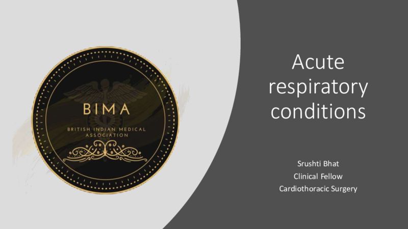 Acute respiratory conditions Srushti Bhat Clinical Fellow Cardiothoracic SurgeryAbout meT opics covered: Pulmonary embolism (PE) Pneumonia Acute asthma Pneumothorax Pleural effusion1. A 28-year old patient presents with productive cough over last 5 days. He had fever as well as breathing difficulty on exertion in the past 2 days. Observations: T 38.2, BP 100/60, HR 90, RR 20, Sats 95% on air. On examination sputum is green coloured, there is reduced air entry on left lower base associated with some crepitations. Sputum culture shows gram positive diplococci. What is the most likely organism responsible? a) Mycoplasma pneumoniae b) Streptococcus pneumoniae c) Staphylococcus aureus d) Pneumocystis jeroveci e) Mycobacterium tuberculosisAnswer: Streptococcus pneumoniae • Diagnosis: Community acquired pneumonia • Points in favour: • Differentials: • Investigations: • CXR- • Management:2. A 19-year old football player suddenly fell to the ground during a match. He was found to be short of breath and complained of right-sided chest pain. His observations: apyrexial, HR 102, BP 92/58, RR 26/min, Sats 90% on air. On auscultation, there is reduced air entry on the right. What will be the most likely next step? a) Chest Xray b) Chest drain on left side c) Chest drain on right side d) Needle thoracocentesis on right side e) Needle thoracocentesis on left sideAnswer: Needle thoracocentesis on the right side • Diagnosis: Tension pneumothorax • Points in favour: • Investigations: CXR- • Management- Emergency setting: Hospital setting:3. A young motorcyclist presents to A&E with sudden onset shortness of breath. Going through his records you realise that he was discharged 1 week ago after undergoing a surgery for fractured femur. His past history is otherwise unremarkable. He was fit and active prior to his injury. Obs: apyrexial, HR 100, BP 100/60, RR 20, Sats 92% air. You perform a chest Xray. What is the most likely diagnosis? a) Fat embolism b) Pulmonary oedema c) Chronic Obstructive Pulmonary Disease (COPD) d) Pulmonary embolism e) PneumoniaAnswer: Pulmonary embolism • Points in favour: • Investigations: • ECG- • Bloods- • CXR- • Definitive: CTPA (not for fat embolism) • Management:4. A 40 year old woman undergoes oesophageal dilatation for longstanding dysphagia secondary to benign peptic stricture. She develops sudden onset breathlessness and starts feeling unwell. Her observations are stable except for RR 26/min. What is the most likely chest x-ray appearance? a) Normal chest Xray b) Free mediastinal gas c) Pneumothorax d) Haemothorax e) PneumoniaAnswer: Free mediastinal gas (Pneumomediastinum) • Diagnosis: Oesophageal perforation • Points in favour: • CXR findings: • Management: Feeding regimen-Mediastinal contents The Middle Mediastinum - Borders - Contents - TeachMeAnatomy Superior Inferior- Inferior- Middle Inferior- Posterior Anterior Organs • Thymus Thymus • Heart • Oesophagus • Trachea (child) • Pericardium • Oesophagus Arteries • Aortic arch • Ascending aorta • Thoracic aorta • Brachiocephalic • Pulmonary trunk trunk • Pericardiophrenic • Left common carotid arteries • Left subclavian Veins & lymphatics • SVC • SVC • Azygos vein • Brachiocephalic vein • Azygos vein • Hemiazygos • Thoracic duct • Pulmonary veins • Thoracic duct • Pericardiophrenic arteries Nerves • Vagus • Phrenic • Vagus nerve • Left recurrent laryngeal • Cardiac nerves • Phrenic5. A 55 year old woman presents to A & E with severe wheeze and persistent dry cough. She says it started a few hours ago when she was hoovering the house. Past history – asthma, hypertension, hypothyroidism. She takes regular oral steroids. Her obs: apyrexial, BP 110/70, HR 98, RR 24/min, Sats 92% air. She is able to provide a history but feels very exhausted. On auscultation: widespread wheeze over all areas. What is the most appropriate immediate management? a) Nebulisation with salbutamol and ipratropium bromide b) Nebulisation with steroids c) Hydrocortisone 100 mg IV d) Oral prednisolone e) Nebulisation with adrenalineAnswer: Nebulisation with salbutamol + ipratropium bromide • Diagnosis: Acute exacerbation of asthma • Trigger: dust • Points in favour: • Diagnosis: • Management:6. A 58 year old woman presents with worsening shortness of breath over last few hours. Her past medical history reveals mitral stenosis, diabetes (diet controlled). She is not on any regular medications. Obs: apyrexial, HR 92, BP 90/65, RR 22, Sats 90% on air. There are widespread crackles bilaterally. She has a displaced apex beat and a systolic murmur. You start her on oxygen and perform a chest Xray. What will be your next management plan? a) Give IV fluids b) IV furosemide c) IV Antibiotics d) Nebulised salbutamol e) Nebulised salineAnswer: IV furosemide • Diagnosis: Mitral stenosis Left ventricular failure pulmonary oedema • Points in favour: • Investigations: ABG • Management:7. An 80 year old man was brought by his daughter due to progressively worsening shortness of breath over the past week. He was apyrexial but his mobility was greatly reduced to dyspnoea. He is an ex-smoker and worked at a cement factory. Obs: stable. On examination: right side reduced air entry mid-lower zone. You perform an ABG and a chest Xray. Which of the following do you think is correct? pH 7.48 pO2 11.2 pCO2 2.8 HCO3- 24 a) Pneumonia and metabolic acidosis b) Pulmonary embolism and respiratory alkalosis c) Pulmonary oedema and metabolic alkalosis d) Pulmonary Tuberculosis and metabolic acidosis e) Pleural effusion and respiratory alkalosisAnswer: Pleural effusion and respiratory alkalosis • Points in favour: • Causes: • Investigations: • CXR findings: • Management:Exudate vs Transudate8. A young man presents to his GP with symptoms of severe cough at night. He says he hasn’t slept in the last few days to this and he is unable to work during the day.