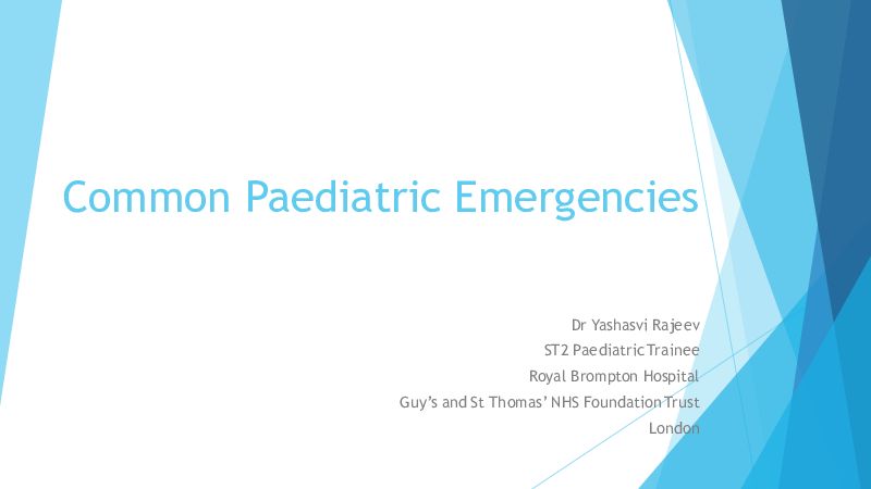 Common Paediatric Emergencies Dr Yashasvi Rajeev ST2 PaediatricTrainee Royal Brompton Hospital Guy’s and St Thomas’NHS FoundationTrust LondonDisclosures and conflicts of interest None Apart fromTopics Covered The need for rapid assessment in children How carry out a 3 min exam Traffic light system for assessing unwell children Febrile child Respiratory disorders Limping child Trauma Non-accidental InjuryWhy do children require immediate attention ? In an emergency situation , a child’s condition can deteriorate quickly due to the following factors – ▪ Anatomical differences - small airways and fatigable respiratory muscles ▪ Physiological differences – hypoglycaemia is poorly tolerated ▪ Developmental differences – neonates and small children have immature immune systems ▪ Inability to communicate the seriousness of the problem ▪ Altered illness responses – diseases like meningitis may not produce stiff neck, vomiting in UTI ▪ More recently in diseases like COVID-19 – altered immune responses leading to conditions like Paediatric Inflammatory Multisystem Syndrome (PIMS-TS)Vitals For Different Pediatric Age groups Age Normal Normal Heart Normal Optimal Respiratory Rate Systolic Blood Weight Rate Pressure At Birth 25-60 120-160 50-70 2.5 -4 kg 6 Months 20-40 110-160 65-105 7-8 kg 2 years 20-30 100-150 70-110 12 kg 5 years 20-30 80-135 80-120 18 kg 10 years 15-25 70-120 80-120 32kgHow to access the optimal Weight For estimated weight formula can be used – Forinfants< 12 months:Weight (kg) = (age in months+ 9)/2 Forchildrenolderthan1 year:Weight(kg)= (age(in years)+ 4) x23 min examinationIbuprofen Do not give ibuprofen to - ▪ Children under 3 months ▪ Children with suspected chickenpox ▪ Oncology patients ▪ Children with asthmaFebrile Child - Convulsions Febrile convulsions are common manifestation of fever (3% of children experience febrile convulsions) and is between age 6 months-3years Generalized, short duration (<15min ) seizures Occurs when temperature reaches >38.5 degrees centigrade Aborting the seizure– most FS episodes are short-lived and self-terminating and do not require long-term treatment with antiepileptic drugs. In a child who is still convulsing at presentation to the ED, indications for giving antiepileptic drugs are seizures lasting more than 5 min, febrile SE, and recurrent seizures. Follow ABCs and the initial drug of choice is Midazolam 0.3–0.5 mg/kg buccally or Lorazepam 0.1 mg/kg IV or IOPaediatric Patient in ShockRespiratory Disorders Upper Respiratory Disorders Lower Respiratory Disorders Croup Asthma Anaphylaxis Bronchiolitis Foreign Body Obstruction Pneumonia Bacterial Tracheitis ( Epiglottitis) Croup Viral tracheobronchitis caused by Influenza and parainfluenza viruses – coryza precedes the cough (Barking Cough ) Stridor at rest is an indication of severity – requires acute assessment and treatment Cyanosis is a pre-arrest state Oral dexamethasone or prednisolone reduces the risk of intubation, first line treatment If not tolerated IV/IM Dexamethasone or nebulised Budesonide can be administered In severe croup, nebulised adrenaline (0.5mL/kg of 1:1000 for maximum of 5 mL)StridorForeign Body Inhalation Can be the cause of acute distress, quite often between children aged between 6 months and 2 years Symptoms include –Choking, coughing, difficulty breathing and shortness of breath, difficulty speaking, wheezing or stridor. Encourage the child to keep coughing. If the obstruction is mild, they are usually able to cough and clear the blockage themselves. If airway is completely blocked – ▪ Conscious – Rapid back blows in an infant or the Heimlich maneuver in an older child should be performed ▪ Unconscious – Open airway, 5 rescue breaths and CPR Rigid bronchoscope can be used to visualise and remove the foreign object if in upper airway, flexible for lower Bacterial T racheitis ( Epiglottitis) Caused by H. influenzae Child presents similar to croup, however child is unimmunised. Disease rapidly progresses over hours and the child drools, is unable to phonate and assumes “sniffing air position” to maximize airway caliber. Enlarged epiglottis visible on Xray (thumb sign ) Cyanosis is pre-arrest stage Initial treatment in pre-arrest stage is transfer to operation theatre for administration of inhalational anaesthetic and intubation rd Once airway is controlled , take a swab and commence IV 3 generation cephalosporinAsthma Very common in children Signs of severity include tachypnoea, intercostal recession, use of accessory muscles, prolonged expiration, cyanosis and altered level of consciousness Classical wheeze can be heard For children under 5 with suspected asthma, treat symptoms based on observation and clinical judgement, and review the child on a regular basis Exacerbations are treated with salbutamol initially with spacers or nebulized salbutamol, ipratropium, or MgSO4 Short course of oral steroids for 3-5 days is also recommended , which can be IV for severely ill patientsWheezeBronchiolitis Viral infection of lower airways by Respiratory Syncytial Virus Common in children aged between 2-6 months Disease progression: 1-2 days of coryza, increasing respiratory distress with tachypnoea, nasal flaring, wheeze and fever . There may be apnoea or difficulty feeding in severe cases . CXR- can be normal or show hyper-inflation of lungs in 50% of cases Treatment involves –Supplemental Oxygen with humidification in severe cases. A trial of bronchodilators and steroids may be warranted in older children IV fluids should be given in patients who are not feeding well and are in distressPneumonia Auscultatory signs are subtle, and X-ray is usually needed to confirm the diagnosis Causative organisms can be ▪ Bacterial - Strep pneumoniae , Staph aureus (in those aged < 5 years) , Mycoplasma pneumonia ( <3 years) ▪ Viral – Influenza, Parainfluenza , Respiratory Syncytial Virus (RSV), Epstein- Barr Virus Treat