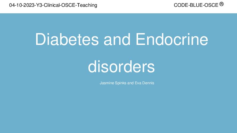 04-10-2023-Y3-Clinical-OSCE-Teaching CODE-BLUE-OSCE Diabetes and Endocrine disorders Jasmine Spinks and Eva DennisIn Partnership with Enrolled activity under the International Federation of Medical Students’ Association (IFMSA) Teaching Medical Skills programme. In Partnership with Comprehensive, accessible OSCE resources, notes, videos and OSCE stations for practice. Use CODEBLUE23 at checkout on GeekyMedics.com for 20% their paid resources **not an affiliate code** Disclaimer • Code Blue OSCE Crew is a platform created by Manchester medical students, independently of the University of Manchester and Manchester Students’ Union • This teaching should not replace any formal teaching provided by the university - Any changes to CCAs would be communicated by your university, follow their guidance • Content is generated by students with input from senior doctors Session Structure 2 4 1 3 Group Explanation stations recap practice Common Data conditions and Breakout rooms explanations interpretation for 1 hour of OSCE practiceLearning Objectives Recall common endocrine conditions and be able to suggest differentials such as: •Diabetes •Thyroid conditions •Addison's disease Understand and apply the general sharing information structure to explanation of a disease Interpret clinical data relating to the aboveExplanation - BUCES - Brief history - PMH and current condition, why are they here, what are you going to discuss - Understanding – prior disease knowledge - Concerns – any initial concerns and ICE - Explanation of the disease: - Summarise and planExplanation - BUCES - Explanation of the disease: oNormal anatomy and physiology of the bowel/affected structure oSymptoms – rectal bleeding, diarrhoea, abdo pain… oWhat the disease is (chunk and check, diagrams to aid understanding, metaphors and analogies) oCauses of the disease – genetic and environmental oComplications oManagementExplanation - Athletics Hyperthyroidism Overactive thyroid – everything speeds up Features: • Anxiety and irritability • Sweating and heat intolerance • Tachycardia • Weight loss • Fatigue • Insomnia • Loose stool Hyperthyroidism Causes – GIST ➢ G – Graves disease ➢ I – Inflammation (thyroiditis) ➢ S – Solitary thyroid nodules ➢ T – Toxic multinodular goitre Thyroiditis has an initial hyperthyroid state before becoming hypo Causes of thyroiditis can be De Quervain’s, Hashimoto’s, Postpartum and drug induced Hyperthyroidism Treatment • Propranolol for symptom control – works fast • Carbimazole (take for 12-18 months) • Radioactive iodine, followed by levothyroxine • Surgery Hypothyroidism Underactive thyroid – everything slows down Features: • Weight gain • Fatigue • Dry skin • Coarse hair and hair loss • Heavy or irregular periods • Constipation Hypothyroidism Causes of primary hypothyroidism ➢ Hashimoto’s thyroiditis – most common cause in the developed world ➢ Iodine deficiency – most common cause in the developing world ➢ Treatment of hyperthyroidism – carbimazole, propylthiouracil, radioactive iodine and thyroid surgery ➢ Other treatments – lithium Hypothyroidism Causes of secondary hypothyroidism ➢ Tumours ➢ Surgery ➢ Radiotherapy ➢ Sheehan syndrome ➢ Trauma Hypothyroidism Treatment • Oral levothyroxine – synthetic T3/4 Explain Levothyroxine A - Replaces the free thyroxine which are missing in hypothyroidism T - Once a day before breakfast H- Tablet L - Lifelong E - 3 weeks T - Test levels of thyroxine after 2 weeks and then every 3 months I - Can cause hyperthyroidism, constipation, heat intolerance, weight loss. C – Contraindicated in thyrotoxicosis S - Free on the NHS Explain Carbimazole A - Blocks the way the body processes iodine and so less thyroid hormones are made. There are 2 ways it works on its own (O), or block and replace (BR) T - BR = 1-3 times daily the reduced to 1-2 times daily (could be more than one tablet) O = 1-3 dose daily H - Tablet L - BR = 4-8 weeks on a higher dose until euthyroid and then reduced dose for 12 to 18 months O = 18 months E - effects after 4-8 weeks T - TFTs need to be done after 2 weeks? then every so often I - Nausea, headache, skin rash. C - Need to be aware of agranulocytosis, should explain to the patient rare complication that reduced the number of blood cells that fight infection and stop bleeding. So important if have any of these to see GP: sore throat, mouth ulcers, fever, bruising or bleeding, and tiredness S - Don't use if pregnant or liver problems • Check the patient details match those on the investigations • Take your time to read through the information • When your ready you can verbalise your findings • Describe the results in turn and use clinical Data Intepretation terminology where relevant e.g. Hb is low indiciating anaemia, WCC is normal, MCV is high indicating macrocytic cells etc. • When you have described all your results give your overall impression supported by evidence in the resultsHypothalamic Pituitary Thyroid axisThyroid Function Tests These tests must always be interpreted within the clinical context as things like concurrent illness can cause false results. (as is the same with a lot of test results!)Thyroid Function Tests Primary Hyperthyroidism: • Thyroid itself produces excess thyroid hormones (T3 and T4) • Results in negative feedback – causing a low TSHThyroid Function Tests Secondary Hyperthyroidism: • The pituitary produces excess TSH • This stimulates the thyroid gland to produce excess thyroid hormone • Negative feedback does not occur , so TSH stays raised • Example of this is a pituitary adenomaThyroid Function Tests Primary Hypothyroidism: • The thyroid behaves abnormally and produces inadequate thyroid hormones – low T3/4 • No negative feedback occurs so there is an increase in TSH to try and increase the T3/4Thyroid Function Tests Secondary Hypothyroidism: • The pituitary prod