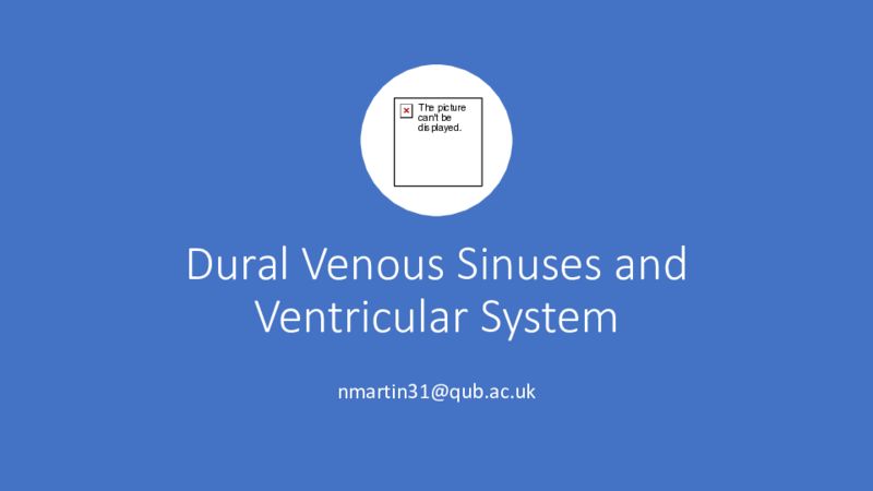 displayed.e Dural Venous Sinuses and Ventricular System nmartin31@qub.ac.ukLearning Outcomes Describe the location of and Describe the pattern of venous Identify the structures passing identify the dural venous drainage within the dural through the cavernous sinuses sinuses venous sinuses Describe the ventricular system of the brain and identify the relevant anatomy; describe the flow of CSFWhat are the DVS? • Endothelial lined spaces between the periosteal and meningeal layers of the dura. • Form where dural septa separate e.g., along the free edge of the falx cerebri. • Drain blood from the brain, scalp, and face into the IJV.DVS Location Superior sagittal Upper margin falx cerebri Occipital Attached border of falx cerebelli Inferior sagittal Lower margin of the falx cerebri Straight Postero-inferior attachment of falx cerebri, along tentorium cerebelli Transverse Posterolateral attached margins of tentorium cerebelli Sigmoid Posterior cranial fossa at the posterior aspect of the petrous temporal bones Superior petrosal Anterolateral attached margin of tentorium cerebelli Inferior petrosal Within a groove between the petrous part of the temporal bone and the basilar part of the occipital bone Cavernous Either side of the sella turcica Intercavernous Anterior and posterior (plexuses) around infundibulum of the pituitary gland Sphenoparietal Along lesser wing of the sphenoid boneDVS Direction of Drainage Superior sagittal Inferiorly into onfluence of sinuses Occipital Superiorly into confluence of sinuses Inferior sagittal Into straight sinus Straight Posteriorly into confluence of sinuses Transverse Laterally into sigmoid sinuses Sigmoid Inferiorly into internal jugular veins Superior petrosal Posterior-laterally into transverse/sigmoid sinus Inferior petrosal Posteriorly into sigmoid sinus IJV junction Cavernous Posteriorly into petrosal sinuses Intercavernous Communication between cavernous sinuses Sphenoparietal Medially into cavernous sinusesTh e pict ure can 't be dis pla yed .O TOM CATThe picture The picture can't be displayed. displayed. DVS Thrombosis • Usually the transverse, cavernous, and superior sagittal sinuses affected • Women onOCP, pregnancy, steroids, infection, trauma, vaccine (AZ) The picture can't be displayed. • Headache, nausea, vomiting, o papilloedema (optic disc swelling 2 to ↑ICP , therefore bilateral) • Unstable? Local thrombolysis • Oral anticoagulation for 3-6 monthscan't beure displayed. The picture can't be displayed. Danger T riangle • Facial vein drains blood of danger triangle to IJV • Facial vein communicates withuperior ophthalmic veins, of which are drained The picture can't be displayed. by cavernous sinus • Infection from the face can enter the cavernous sinus and therefore brain via the facial vein. eh uret The picture can't be displayed. 'tn What are the ventricles? dis yed . • Produce and circulate CSF • Choroidal epithelial cells (modified ependymal cells) line the ventricles. • ~400-500mL/day of CSF is The picture can't be displayed. secreted to bathe the surfaces of the brain and spinal cord • CSF gives cushioning against trauma, creates buoyancy, removesmetabolises Th e pict ure can The picture can't be displayed. 't be dis pla yed . Th e pict ure can 't be dis pla The picture can't be displayed. yed . Th e pict ure can 't be dis pla yed The picture can't be displayed. . Th e pict ure can The picture can't be displayed. 't be dis pla yed . eh uret can be Flow of CSF pla .ed • Beginning in the lateral ventricles, some CSF flows due to pulsation of blood through two passageways called the interventricular foramina to drain into the third ventricle • From the third ventricle it flows down a long, narrow passageway called the th aqueduct of Sylvius into the fourth ventricle. The 3rd and 4 ventricles are posterior-inferiorly as connected by this aqueduct • From the fourth ventricle it passes through three small openings (foramina) into the subarachnoid space surrounding the brain and spinal cord. CSF can pass into the paired lateral apertures before exiting to SA space or travel into the single median aperture before reaching the SA space and can collect in cisterns eg. cisterna magna • Some CSF escapes into spinal column passing via the median aperture. The subarachnoid space is continuous around the spinal cord and posterior-superiorly over the cerebellum eh pict can The picture can't be displayed. 't Absorption of CSF dis pla .ed • Arachnoid granulations (clusters of arachnoid villi) • Granulations protrude through the meningeal layer of dura mater • Open into DVS • Absorption of CSF from arachnoid granulations into the DVS occurs when the CSF > DVS pressure: • Some absorption may occur directly in the veins of the subarachnoid space or through the lymphatic system. • Some CSF may even escape through the perineural lymph vessels of the spinal and cranial nerves. Once in the bloodstream, it is carried away and filtered by our kidneys and liver in the same way as are our other body fluids. Th e The picture can't be displayed. pict ure can 't be dis pla yed .The picture The picture can't be displayed. displayed. Hydrocephalus Expansion of the cerebral ventricles caused by anexcessive accumulation of CSF ± herniation of cerebral tissue (coning) • Communicating – CSF cannot get The picture can't be displayed. reabsorbed (absent arachnoid villi) • Non-communicating– flow of CSF is blocked Ventriculoperitoneal shuntQ) Nicholas is an 18-year-old male who has recently started university. He attends a party and has many alcoholic drinks and wakes the a) L1-2 next morning with a severe headache. He puts this down to being hungover, however, b) T12-L1 by the next day the headache is worse and c) T12-L2 he has a widespread non-blanching purpuric rash. He attends the emergency department d) L3/4 who suspect meningitis and would like to e) L4/5 perform a lumbar puncture to obtain a cerebrospinal f