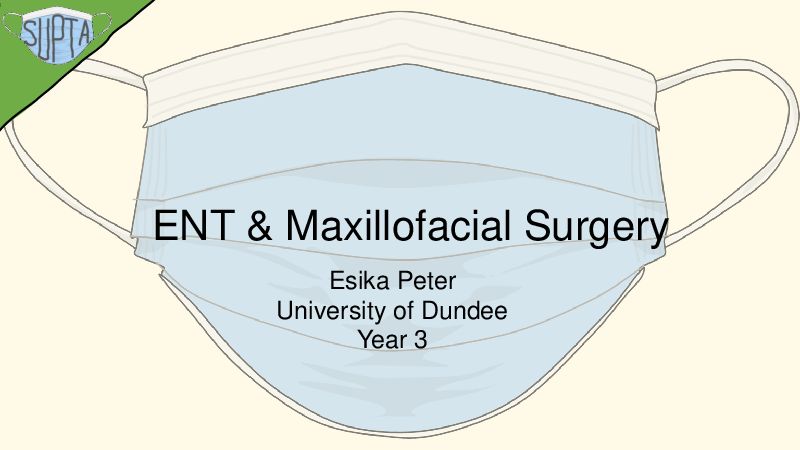 ENT & Maxillofacial Surgery Esika Peter University of Dundee Year 3Thanks to our partners!Learning Outcomes: • Outline the gross anatomy of the outer, inner and middle ear, with appreciation of the tympanic membrane • Understand the use of surgical management in patients with pathologies relating to the ear; includingbut not limited to: otitis media with effusion, auricular hematoma - “cauliflower ear”, tympanic membrane perforation • Recall the bony anatomy, function and divisions of the nasal cavity • Describe the different paranasal sinus’ as well as their importance in transsphenoidal surgery • Appreciate the anatomy and surgical relevance of Kiesselbach's plexus in managing epistaxis • Understand the mechanism of septal hematoma, as well as the surgical management and complications • Describe the anatomy and neurovascular supply of the major salivary glands in the face. • Understand the anatomy of the parotid gland, paying attention to the important anatomical relations - especially the facial nerve (CN 7) • Apply anatomical knowledge to the setting of ENT surgery; parotidectomy, salivary gland tumour resections (particularly pleomorphic adenoma)Learning Outcomes: • Outline the gross anatomy of the outer, inner and middle ear, with appreciation of the tympanic membrane • Understand the use of surgical management in patients with pathologies relating to the ear; includingbut not limited to: otitis media with effusion, auricular hematoma - “cauliflower ear”, tympanic membrane perforation • Recall the bony anatomy, function and divisions of the nasal cavity • Describe the different paranasal sinus’ as well as their importance in transsphenoidal surgery • Appreciate the anatomy and surgical relevance of Kiesselbach's plexus in managing epistaxis • Understand the mechanism of septal hematoma, as well as the surgical management and complications • Describe the anatomy and neurovascular supply of the major salivary glands in the face. • Understand the anatomy of the parotid gland, paying attention to the important anatomical relations - especially the facial nerve (CN 7) • Apply anatomical knowledge to the setting of ENT surgery; parotidectomy, salivary gland tumour resections (particularly pleomorphic adenoma)Anatomy of the Ear:Anatomy of the Tympanic Membrane : What is used to orientate if it is tympanic membrane of the right ear or left ear? • Cone of Light • Right ear – 5 o’clock • Left ear 7 o’clockOtitis Media with Effusion (aka Glue Ear): • Condition where fluid accumulates in the middle ear • More common in kids due to the anatomy of the Eustachian tube → peaks at 2 years of age • Kids have large adenoids blocking the Eustachian tube • It is the most common cause of hearing loss in kids and can predispose them to develop Acute Otitis Media • Risk Factors: • Male sex • Siblings with glue ear • Higher incidence in Winter and Spring → could be due to recurrent URTI • Bottle feeding in supine position • Day care attendance • Parental smoking • Craniofacial abnormalities → e.g. cleft palateOtitis Media with Effusion (aka Glue Ear): • Symptoms • Conductive hearing loss • This can lead to poor school performance, behavioural problems and speech delay • Ear-tugging in kids • Recurrent Acute Otitis Media Red Flags: • Signs • Unilateral glue ear • Weight loss, fever, night • Middle ear effusion → rarely may see bubbles behind the ear • Altered TM colour → dull sweats • Neck lumps • TM retraction • Unilateral epistaxis • Loss of light reflex • Unilateral nasal obstruction • Investigations • Otoscopy • Rinne + Weber → Bone conduction > Air conduction, Lateralises to the affected ear • Audiometry → Mild conductive hearing loss (20-40dB) • Tympanometry → Flat tracingOtitis Media with Effusion (aka Glue Ear): • Management • Watchful waiting for 3 months (as most cases resolve on their own) • During this period, it is essential to monitor the patient's symptoms and provide regular follow-up appointments to assess changes in hearing status • Monitoring should include two hearing tests using pure tone audiometry at least 3 months apart as well as tympanometry • Autoinflation/valsava manoeuvre • If resolution is not achieved within 3 months: • Non–surgical • Softband BAHA (bone anchored hearing aid) • Surgical • Myringotomy and grommet insertion → Grommets will fall out spontaneously within 6-12 months • NICE recommends > 3 months of bilateral OME and hearing level in better ear < 25-30dBHL • T-tubes • Adjuvant adenoidectomy is recommended for children > 4 years of agePerforated Tympanic Membrane • Causes • Infection → complication of OME • Iatrogenic • Barotrauma • Direct trauma • Signs and symptoms • Incidental • Otalgia • Otorrhoea • Conductive Hearing loss • Recurrent Otitis Media • Management • Small perforations tend to resolve spontaneously (90% of perforations heal within 6 weeks) • Advisable to avoid getting water into the ear during this time • Conservative: • Maintains strict water precautions. Consider hearing aids. • Surgical • If they have >3 infections per year, consider myringoplasty (repair of the ear drum). • The main aim of myringoplasty is to ensure the middle ear can be kept dryPinna Haematoma • Common injury caused by shearing forces applied to the auricle by trauma/direct blow to the external ear, mostly commonly seen in e.g. rugby players/ boxers • Trauma —> Shearing Forces —> Necrosis —> Fibrosis • Blood supply to the underlying cartilage can become impaired • If pinna haematomas are left untreated, due to the disrupted blood • Management supply, avascular necrosis of the pinna can occur • Need same day assessment by ENT • Incision and drainage of the • Subsequent fibrocartilage overgrowth can lead to a structural deformity - haematoma should be pe