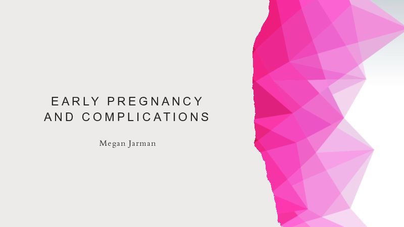 E A R LY P R E G N A N C Y A N D C O M P L I C AT I O N S Megan Jarman A RO U G H T I M E L I N E st • 1 trimester – up to 12 weeks • 2ndtrimester – 13 to 26 weeks • 3 trimester – 27 to birth • Booking clinic – before 10 weeks (general advice, booking bloods, baseline measures – height, weight ect, bp ect…) • Booking bloods – blood group, antibodies and rhesus D status, FBC, screening for thalassemia (all) and sickle cell (higher risk) • Dating scan – between 10-13+6 weeks (gestational age from crown to rump length and multiple pregnancies identified) • Antenatal appointment – 16 weeks • Whopping cough vaccine from 16 weeks • Anomaly scan – 18 to 20+6 weeks • Foetal movements should be felt from 20 weeks to birth • Frequent appointments in antenatal clinic from 25 weeks onwardsL I F E S T Y L E A DV I C E Continue moderate Take folic acid 400mcg Take vit d – 10mcg Avoid vit a – supplements, exercise but avoid eating liver for pate comntact sports Flying increasesVTE risk, ok up to 37 weeks in Place car seat belt above No alcohol and no singleton pregnancy and 32 and below bump not across smoking weeks in a twin pregnancy it as long as it is uncomplicatedM O L A R P R E G N A N C Y Hydatidiform mole – tumour that grows like a pregnancy inside the uterus Complete mole – 2 sperm cells fertilise an empty ovum Partial mole – 2 sperm cells fertilise a normal ovum Red flags – severe morning sickness,vaginal bleeding,abnormally high b-hcg,thyrotoxicosis,enlarged uterus size USS shows snowstorm appearance Management – evacuation of contents of uterus sent to lab, H Y P E R E M E S I S G R AV I DA RU M • Nausea and vomiting are normal during early pregnancy. Symptoms usually start from 4 – 7 weeks, are worst around 10 – 12 weeks and resolve by 16 – 20 weeks. Symptoms can persist throughout pregnancy. • The placenta produces human chorionic gonadotropin (hCG) during pregnancy. This hormone is thought to be responsible for nausea and vomiting. Theoretically, higher levels of hCG result in worse symptoms. • Nausea and vomiting are more severe in molar pregnancies and multiple pregnancies due to the higher hCG levels. It also tends to be worse in the first pregnancy and overweight or obese women. • More than 5% weight loss, dehydration, electrolyte imbalance and ketones • PUQE used to assess severity • Manage with antiemetics (prochlorperazine) and rehydration using IVF • Risk factors – previous ectopic, PID, previous surgery to tubes, coils, older age, smoking • Typically presents at 6-8 weeks with lower abdo pain, bleeding, cervical excitation • Possible shoulder tip pain • Tubal ring sign/bagel sign seen on uss • Pregnancy of unknown location – ectopic, miscarriage or too early to be seen • A rise of more than 66% in Bhcg after 48hrs is indicative of an intrauterine pregnancy • Management – conservative, medical or surgical • Medical – methotrexate – must come to follow up (HCG levels <5000). No children for 3 months • Expectant – need follow up and repeat HCGs • Surgical – needed if Bhcg>5000 or ectopic over 35mm • After medical bhcg – can go up on day 4 but must go down by day 7 • Salpingostomy – open tube and take out ectopic • Salpingectomy – whole tube removed E C TO P I C • Next pregnancy early scan at 7/8 weeks if asymptomatic P R E G N A N C Y • Anti D prophylaxis must be consideredM I S C A R R I AG E D I AG N O S I S Normally due to chromosomal abnormalities that would make them incompatible with life • Early = before 12 weeks • Late = 12 to 24 weeks • Anembryonic = sac but contains no embryo • Threatened miscarriage – bleeding but cervix is closed and foetus is alive • Inevitable miscarriage – bleeding,cervix is open • Crown – rump length of more than 7mm with no heartbeat, repeat 1 week later if still no heartbeat = non – viable pregnancy • Mean gestational sac diameter over 25mm without foetal pole – repeat scan in one week if no change = anembryonic pregnancy M I S C A R R I AG E M A N AG E M E N T • Less than 6 weeks = expectant management – with pregnancy test 7 to 10 days later • More than six weeks = go to EPAU, USS needed, rule out ectopic Expectant, medical or surgical management: • Expectant – pregnancy test after 3 weeks of no bleeding to confirm complete • Medical = misoprostol vaginal or oral • With surgical consider need for anti d • Surgical = manual vacuum aspiration – under local as out pt • Surgical = electric vacuum aspiration under GA • Misoprostol used before to soften cervix (prostaglandins) • Incomplete – retained products of conception = infection risk, need surgical evacuation under GA Recurrent = three or more consecutive miscarriages or one or more in second trimester Causes – idiopathic,antiphosolipid syndrome,uterine abnormalities,genetic factors,SLE,diabetes ect… R E C U R R E N T M I S C A R R A I G E and LMWHpholipid – give low dose aspirin Investigations – antiphospholipid antibodies, USS,genetic testing of products of conception,genetic testing on parents • Legal until 24 weeks • Pre abortion care – offered counselling to ensure informed decision • Medical – mifepristone (anti progesterone) and then 1-2 days later misoprostol • If gestation over 10 weeks = anti d may be needed • Surgical – medication used to soften cervix (misoprostol), anti D considered, local or general anaesthetic depending T E R M I N AT I O N • Up to 14 weeks – cervical dilation and suction • Over 14 – cervical dilation and evacuation using forceps • Post abortion – expect bleeding, pregnancy test needed in 3 weeks to confirm completed, contraception discussed, support and counselling • Complications – bleeding, pain, infection, fails