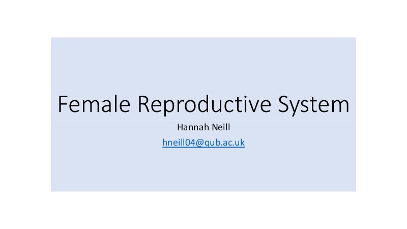 Female Reproductive System Hannah Neill hneill04@qub.ac.ukLearning Outcomes 1. Identify and describe the anatomy and relations of the female reproductive organs 2. Identify and describe the origin, course, relations and distribution of the ovarian and uterine arteries 3. Identify and describe the location of the recto-uterine pouch 4. Identify and describe the anatomy of the perineum 5. Identify and describe the anatomy of the pelvic floor in the female 6. Describe the lymphatic drainage of the pelvis in the female 7. Identify and describe the anatomy and lymphatic drainage of the female breastIdentify and describe the anatomy and relations of the female reproductive organs Ovaries Fallopian/Uterine Tubes Uterus VaginaOvaries Function - development of oocytes & secrete reproductive hormones (mainly oestrogen).Fallopian / Uterine Tubes Function – conduct oocyte which is expelled from the ovaries to the peritoneal cavity to the uterus. 4 parts: • Fimbriae • Infundibulum • Ampulla • IsthmusClinical Relevance: Fertilization & Ectopic PregnancyClinical Relevance: Female SterilizationUterus Function – muscular organ. Adapts to the growth of a fetus & provides power for expulsion during childbirth. 3 parts: • Fundus • Body • Cervix 3 layers: • Perimetrium • Myometrium • EndometriumUterus Anteverted (tipped antero- superiorly relative to the axis of the vagina) Anteflexed (flexed or bent anteriorly relative to the cervix)Clinical Relevance:Uterine ProlapseVaginal Canal • Functions • Sexual intercourse • Childbirth • MenstruationIdentify and describe the anatomy and relations of the female reproductive organs • Anterior – bladder & urethra • Posterior – rectouterine pouch, rectum & anal canal • Lateral – ureters & levator ani musclesAnterior PosteriorClinical Relevance:sterectomyClinical Relevance: Fistulas Definition: abnormal connection between two epithelial surfaces. • Types of fistulas • Vesicouterine fistula • Vesicovaginal fistula • Urethrovaginal fistula • Rectovaginal fistula • Causes: • Childbirth • Surgical complications • Inflammation (Crohn’s disease / UC) • InfectionLigamentsUterosacral Ligament pass superiorly and slightly posteriorly from the sides of the cervix to the middle of the sacrum; they are palpable during rectal examination.Clinical Relevance: Endometriosis PV exam findings: • fornix)nodular masses along a thickened uterosacral ligament (palpated in the posteriorIdentify and describe the origin, course, relations and distribution of the ovarian and uterine arteries Artery Origin Course & Relations Distribution Ovarian Abdominal Retroperitoneal. Runs anterior to psoas major, Abdominal & pelvic ureter aorta (L2/L3) above the ureter. Crosses pelvic brim and Ampulla of fallopian tube travels within the suspensory ovarian ligament Ovary towards the ovary. Uterine Internal iliac Passes inferiorly & medially across the floor of Uterus artery the pelvis above the ureter. Cervix Travels within the broad ligament towards the Vagina uterus. Ovaries Uterine tubeRemember: L ovarian vein drains into L renal vein, R ovarian Water under the bridge vein drains directly into the IVC!Identify and describe the location of the recto-uterine pouch (Pouch of Douglas) Anterior Uterus Posterior Superior & middle rectumClinical Relevance: Culdocentesis Check for abnormal fluid in the rectouterine pouch. Procedure: long thin needle inserted though the posterior vaginal wall of fluid.r fornix) to obtain a sample Causes of fluid in rectouterine pouch: • Ruptured ectopic pregnancy • Pelvic inflammatory disease • Tubo-ovarian abscess • Ascites • Pelvic abscess / haematoma • EndometriosisIdentify and describe the anatomy of the perineum Urogenital Triangle Anorectal Triangle Urogenital triangle: Superficial Perineal Pouch Content: •Clitoris & ischiocavernosus muscle •Bulbs of vestibule & bulbospongiosus muscle •Greater vestibular glands •Superficial transverse perineal membrane •Vessels & nerves Urogenital triangle: Deep Perineal Pouch Content: •Proximal urethra •External urethral sphincter •Anterior extensions of the ischioanal fat pads Identify and describe the anatomy of the pelvic floor in the female Levator Ani Function: support pelvic organs, especially with increases in intra-abdominal pressure (e.g. coughing, sneezing, laughing)Identify and describe the anatomy of the pelvic floor in the female Muscle Proximal Attachment Distal Attachment Innervation Action Coccygeus Ischial spine Inferior end of sacrum Branches of S4-S5 Pelvic diaphragm; & coccyx spinal nerves support pelvic viscera; flex coccyx Levator ani Body of pubis; tendinous arch Perineal body; coccyx; Nerve to levator ani Pelvic diaphragm; (puborectalis, of obturator fascia; ischial anococcygeal ligament; (branch of S4), support pelvic viscera; pubococcygeus, spine wall of prostate / inferior anal (rectal) resist increase in intra- vagina, rectum, anal nerve & coccygeal abdominal pressure iliococcygeus) canal plexusClinical Relevance: Stress Incontinence Loss of control over urination due to weakness of pelvic floor muscles.Clinical Relevance:Pelvic Organ ProlapseDescribe the lymphatic drainage of the pelvis in the female Organ Lymphatic Drainage Vulva Superficial inguinal lymph nodes Vagina Iliac lymph nodes & superficial inguinal lymph nodes Cervix Iliac, sacral, aortic & inguinal lymph nodes Uterus Iliac, sacral, aortic & inguinal lymph nodes Ovaries Para-aortic lymph nodes Clinical Relevance: Metastases of female reproductive cancers!Identify and describe the anatomy and lymphatic drainage of the female breast • Composed of mammary majors overlying pectoralisClinical Relevance: Breast Cancer Screening <35 years old >35 years old Ultrasound scan of breast Mammogram (x-ray) Older, fatty tissue Young, dense glandular tissueIdentify and describe the anatomy and lymphatic drainage of the female breast • Composed of mammary glands overlyin