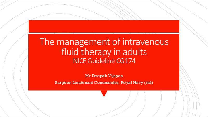 This on-demand teaching session is relevant to medical professionals and will focus on the management of intravenous fluid therapy in adults. Expert speaker Mr Deepak Vijayan (Surgeon Lieutenant Commander, Royal Navy) will provide a quick refresher on body water composition and movement before discussing the types of fluids prescribed, the effects of chloride ions, the myth buster and STOP sign related to using 0.9% NaCl, and NICE Clinical Guideline 174 (2013). He will also cover audit standards for fluid prescription, fluid resuscitation, routine maintenance, the NICE algorithm and reference important research materials. As well as this, there will be a discussion on the implications of the SALD-ED trial.