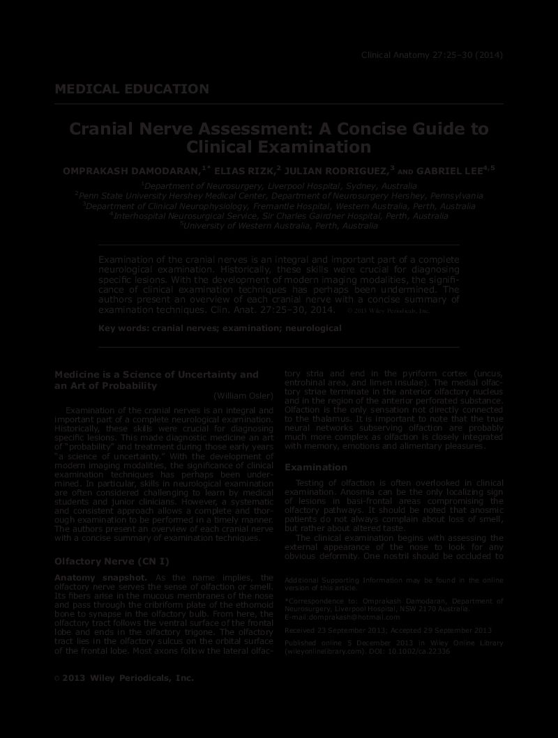 Clinical Anatomy 27:25–30 (2014) MEDICAL EDUCATION Cranial Nerve Assessment: A Concise Guide to Clinical Examination 1* 2 3 4,5 OMPRAKASH DAMODARAN, ELIAS RIZK, JULIAN RODRIGUEZ, AND GABRIEL LEE 1 2 Department of Neurosurgery, Liverpool Hospital, Sydney, Australia Penn State University Hershey Medical Center, Department of Neurosurgery Hershey, Pennsylvania 3Department of Clinical Neurophysiology, Fremantle Hospital, Western Australia, Perth, Australia 4Interhospital Neurosurgical Service, Sir Charles Gairdner Hospital, Perth, Australia 5 University of Western Australia, Perth, Australia Examination of the cranial nerves is an integral and important part of a complete neurological examination. Historically, these skills were crucial for diagnosing specific lesions. With the development of modern imaging modalities, the signifi- cance of clinical examination techniques has perhaps been undermined. The authors present an overview of each cranial nerve with a concise summary of examination techniques. Clin. Anat. 27:25–30, 2014. V 2013 Wiley Periodicals, Inc. Key words: cranial nerves; examination; neurological Medicine is a Science of Uncertainty and tory stria and end in the pyriform cortex (uncus, entrohinal area, and limen insulae). The medial olfac- an Art of Probability tory striae terminate in the anterior olfactory nucleus (William Osler) and in the region of the anterior perforated substance. Olfaction is the only sensation not directly connected Examination of the cranial nerves is an integral and important part of a complete neurological examination. to the thalamus. It is important to note that the true Historically, these skills were crucial for diagnosing neural networks subserving olfaction are probably specific lesions. This made diagnostic medicine an art much more complex as olfaction is closely integrated of “probability” and treatment during those early years with memory, emotions and alimentary pleasures. “a science of uncertainty.” With the development of modern imaging modalities, the significance of clinical examination techniques has perhaps been under- Examination mined. In particular, skills in neurological examination Testing of olfaction is often overlooked in clinical are often considered challenging to learn by medical examination. Anosmia can be the only localizing sign students and junior clinicians. However, a systematic of lesions in basi-frontal areas compromising the and consistent approach allows a complete and thor- olfactory pathways. It should be noted that anosmic ough examination to be performed in a timely manner. patients do not always complain about loss of smell, The authors present an overview of each cranial nerve but rather about altered taste. with a concise summary of examination techniques. The clinical examination begins with assessing the external appearance of the nose to look for any Olfactory Nerve (CN I) obvious deformity. One nostril should be occluded to Anatomy snapshot. As the name implies, the olfactory nerve serves the sense of olfaction or smell. Additional Supporting Information may be found in the online version of this article. Its fibers arise in the mucous membranes of the nose *Correspondence to: Omprakash Damodaran, Department of and pass through the cribriform plate of the ethomoid Neurosurgery, Liverpool Hospital, NSW 2170 Australia. bone to synapse in the olfactory bulb. From here, the E-mail:domprakash@hotmail.com olfactory tract follows the ventral surface of the frontal lobe and ends in the olfactory trigone. The olfactory Received 23 September 2013; Accepted 29 September 2013 tract lies in the olfactory sulcus on the orbital surfacePublished online 5 December 2013 in Wiley Online Library of the frontal lobe. Most axons follow the lateral olfac-(wileyonlinelibrary.com). DOI: 10.1002/ca.22336 V 2013 Wiley Periodicals, Inc. 0 2 5 2 1 , D 26 Damodaran et al. w l d facilitate separate testing of each side. While a range 20/20 (6/6) vision, the pinhole test can be performed d o of products can be used for testing, it is more practical using a piece of cardboard with a tiny (2 mm) perfora- m t to use commonly accessible items such as coffee, tion. Improved vision indicates refractory error. If a / orange peel, vanilla etc. Noxious stimuli are detected patient is unable to read the largest letters on the chart, n n by sensory fibers of the trigeminal nerve and pungent he or she should be asked to count fingers held up in i smells are best avoided. If anosmia is detected, an front of them. Failing this, recognition of hand move- a w examination of the nasal passages should be consid- ment is tested. In cases of severe visual impairment, l ered to rule out nasal polyps and mucosal thickening. light perception should be tested using a pen torch. . m Common causes of anosmia include respiratory tract Visual fields. Visual fields can be examined by con- d infection, increasing age, head injury, olfactory groove frontation using the examiner’s finger or colored pen, 1 . meningioma and following meningitis. but a red pen allows a more detailed assessment to 0 be made. Using a waggling finger can reduce the sen- c 2 sitivity of the test in the peripheral field and can fail 3 Optic Nerve (CN II) entirely to assess the central fields (Fig. 1). 6 y The examiner should ensure that his/her line of e Anatomy snapshot. This is a purely sensory nerve. c It is a unique fiber pathway and not a peripheral nerve sight is level with that of the patient. The patient is b instructed to look directly at the examiner’s eye while L and it connects the retina to the brain. The first order b neurons are activated by the rods and cones in the ret- the nontested eye remains covered with a piece of v cardboard (or the patient’s hand). The red pen should n ina, the true peripheral nerves in this instance. These ) bipolar cells synapse with ganglion cells, which con- be brought in from four directions diagonally towards W the center o