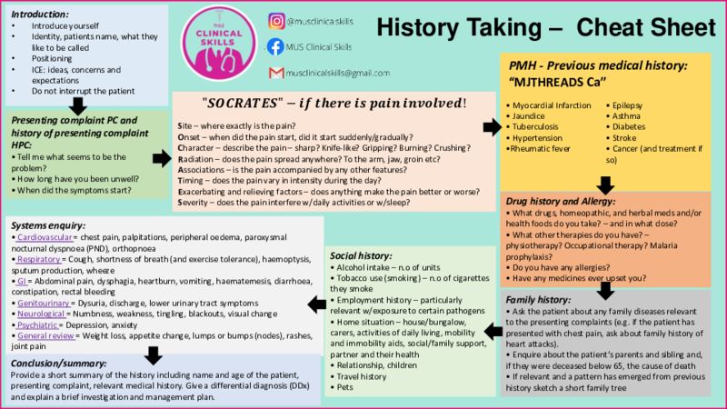 Introduction: • Introduce yourself • Identity, patients name, what they History Taking – Cheat Sheet like to be called • Positioning • ICE: ideas, concerns and PMH - Previous medical history: expectations “MJTHREADS Ca” • Do not interruptthe patient "𝑺𝑶𝑪𝑹𝑨𝑻𝑬𝑺" − 𝒊𝒇 𝒕𝒉𝒆𝒓𝒆 𝒊𝒔 𝒑𝒂𝒊𝒏 𝒊𝒏𝒗𝒐𝒍𝒗𝒆𝒅! • Myocardial Infarction • Epilepsy • Jaundice • Asthma Presenting complaintPC and Site – where exactly is the pain? • Tuberculosis • Diabetes history of presenting complaint Onset – when did the pain start, did it start suddenly/gradually? • Hypertension • Stroke HPC: Character – describe the pain – sharp? Knife-like? Gripping?Burning?Crushing? • Tell me what seems to be the •Rheumatic fever • Cancer (and treatment if Radiation – does the pain spread anywhere? To the arm, jaw, groin etc? so) problem? Associations – is the pain accompanied by any other features? • How long have you been unwell? Timing – does the pain vary in intensityduringthe day? • When did the symptoms start? Exacerbating and relievingfactors – does anythingmake the pain better or worse? Severity – does the pain interfere w/daily activities or w/sleep? Drug historyand Allergy: • What drugs, homeopathic,and herbal meds and/or health foods do you take? – and in what dose? Systems enquiry: • What other therapies do you have? – • Cardiovascular= chest pain, palpitations, peripheraloedema, paroxysmal nocturnal dyspnoea (PND), orthopnoea physiotherapy?Occupational therapy?Malaria • Respiratory = Cough, shortness of breath (and exercise tolerance), haemoptysis, Social history: prophylaxis? sputumproduction,wheeze • Alcohol intake – n.o of units • Do you have any allergies? • GI = Abdominal pain, dysphagia, heartburn,vomiting, haematemesis, diarrhoea, • Tobacco use (smoking) – n.o of cigarettes • Have any medicines ever upset you? constipation, rectal bleeding they smoke • Genitourinary = Dysuria, discharge, lower urinarytract symptoms • Employment history – particularly Family history: relevantw/exposure to certain pathogens • Ask the patient about any family diseases relevant • Neurological = Numbness, weakness, tingling, blackouts, visual change • Home situation – house/bungalow, to the presentingcomplaints (e.g. if the patient has • Psychiatric = Depression,anxiety carers, activities of daily living, mobility presentedwith chest pain, ask about family history of • General review = Weight loss, appetite change, lumps or bumps(nodes), rashes, joint pain and immobility aids, social/family support, heart attacks). partnerand their health • Enquire about the patient’s parents and sibling and, Conclusion/summary: • Relationship, children if they were deceased below 65, the cause of death Provide a short summary of the history includingname and age of the patient, • Travel history • If relevantand a patternhas emerged from previous presentingcomplaint, relevant medical history. Give a differentialdiagnosis (DDx) • Pets history sketch a short family tree and explain a brief investigation and management plan.
