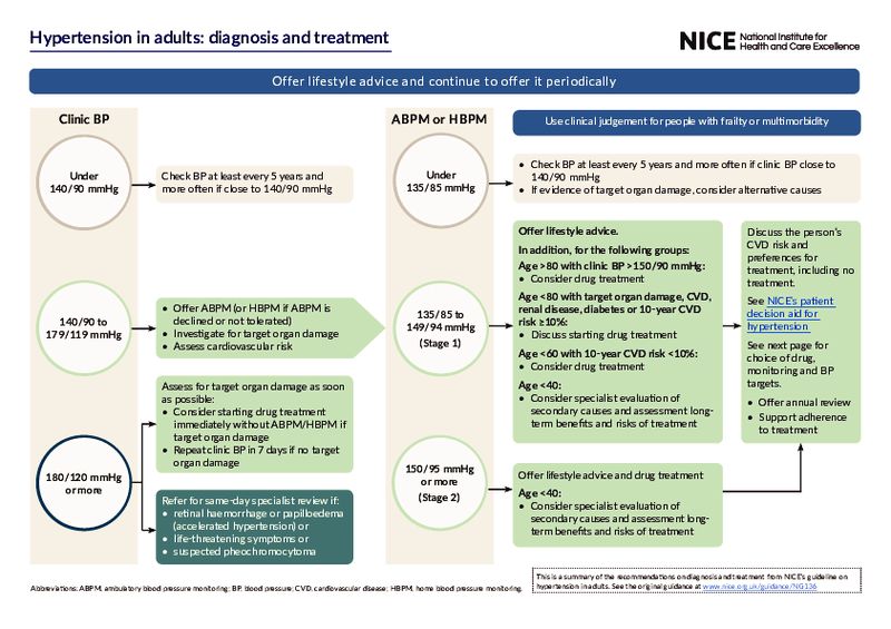 Hypertension in adults: diagnosis and treatment Offer lifestyle advice and continue to offer it periodically Clinic BP ABPM or HBPM Use clinical judgement for people with frailty or multimorbidity • Check BP at least every 5 years and more often if clinic BP close to Under Check BP at least every 5years and Under 140/90 mmHg 140/90 mmHg more often if close to 140/90 mmHg 135/85 mmHg • If evidence of target organ damage, consider alternative causes Offer lifestyle advice. Discuss the person’s CVD risk and In addition, for the following groups: preferences for Age >80 with clinic BP >150/90 mmHg: • Consider drug treatment treatment, including no treatment. Age <80 with target organ damage, CVD, • Offer ABPM (or HBPM if ABPM is renal disease, diabetes or 10-year CVD See NICE’s patient declined or not tolerated) 135/85 to decision aid for 140/90 to 149/94 mmHg risk ≥10%: hypertension 179/119 mmHg • Investigate for target organ damage • Discuss starting drug treatment • Assess cardiovascular risk (Stage 1) See next page for Age <60 with 10-year CVD risk <10%: choice of drug, • Consider drug treatment monitoring and BP Age <40: targets. Assess for target organ damage as soon as possible: • Consider specialist evaluation of • Offer annual review • Consider starting drug treatment secondary causes and assessment long- immediately without ABPM/HBPM if term benefits and risks of treatment • Support adherence target organ damage to treatment • Repeat clinic BP in 7 days if no target organ damage 150/95 mmHg 180/120 mmHg Offer lifestyle advice and drug treatment or more or more Refer for same-day specialist review if: (Stage 2) Age <40: • retinal haemorrhage or papilloedema • Consider specialist evaluation of secondary causes and assessment long- (accelerated hypertension) or term benefits and risks of treatment • life-threatening symptoms or • suspected pheochromocytoma This is a summary of the recommendations on diagnosis and treatment from NICE’s guideline on Abbreviations: ABPM, ambulatory blood pressure monitoring; BP, blood pressure; CVD, cardiovascular disease; HBPM, home blood pressure monitoring. guidance at www.nice.org.uk/guidance/NG136Choice of antihypertensive drug , monitoring treatment and BP targets Hypertension with Hypertension without type 2 diabetes Monitoring treatment type 2 diabetes Use clinic BP to monitor treatment. Age <55 and not of Age 55 or over Black African or black African orAfrican– African–Caribbean Measure standing and sitting BP in people Caribbean family origin family origin (any age) Use clinical judgement for people with frailty or multimorbidity • type 2 diabetes or Offer lifestyle advice and continue to offer it periodically • symptoms of postural hypotension or Step 1 ACEi or ARB 2,3 CCB • aged 80 and over. Advise people who want to self-monitor to use HBPM. Provide training and advice. Consider ABPM or HBPM, in addition to clinic BP, for people with white-coat effect or ACEi or ARB 2,3 CCB masked hypertension. Step 2 + + 2,3 CCB or thiazide-like diuretic ACEi or ARB or thiazide-like diuretic BP targets Reduce and maintain BP to the following targets: Step 3 ACEi or ARB 2,+ CCB + thiazide-like diuretic Age <80 years: • Clinic BP <140/90 mmHg • ABPM/HBPM <135/85 mmHg Age ≥80 years: • Clinic BP <150/90 mmHg Confirm resistant hypertension: confirm elevated BP with ABPM or HBPM, check for postural hypotension and discuss adherence • ABPM/HBPM <145/85 mmHg Step 4 Consider seeking expert advice radding a: Postural hypotension: • low-dose spironolactoneif blood potassium level is ≤4.5 mmol/l • alpha-blocker or beta-blocker if blood potassium level is >4.5 mmol/l • Base target on standing BP Seek expert advice if BP is uncontrolled on optimal tolerated doses of 4 drugs Frailty or multimorbidity: • Use clinical judgement For women considering pregnancy or who are pregnant or breastfeeding, see NICE’s guideline on hypertension in pregnancy. For people with chronic kidney disease, see NICE’s guideline on chronic kidney disease. For people with heart failure, see NICE’s guideline on chronic heart failure See MHRA drug safety updates on ACE inhibitors and angiotensin-II receptor antagonists: not for use in pregnancy, which states ‘Use in women who are planning pregnancy should be avoided unless absolutely necessary, in which case the potential risks and benefits should be discussed’, ACE inhibitors and angiotensin II receptor antagonists: use during breastfeeding and clarification: ACE inhibitors and angiotensin II receptor antagonists. See also NICE’s guideline on hypertension in pregnancy. Consider an ARB, in preference to an ACE inhibitor in adults of African and Caribbean family origin. This visual summary builds on and updates previous work on At the time of publication (August 2019), not all preparations of spironolactone have a UK marketing authorisation for this indication. treatment published by the BIHS (formerly BHS) Abbreviations: ABPM, ambulatory blood pressure monitoring; ACEi, ACE inhibitor; ARB, angiotensin-II receptor blocker; BP, blood pressure; CCB, calcium-channel blocker; HBPM, home blood pressure monitoring. © NICE 2019. All rights reserved. Subject to Notice of rights. Published: August 2019