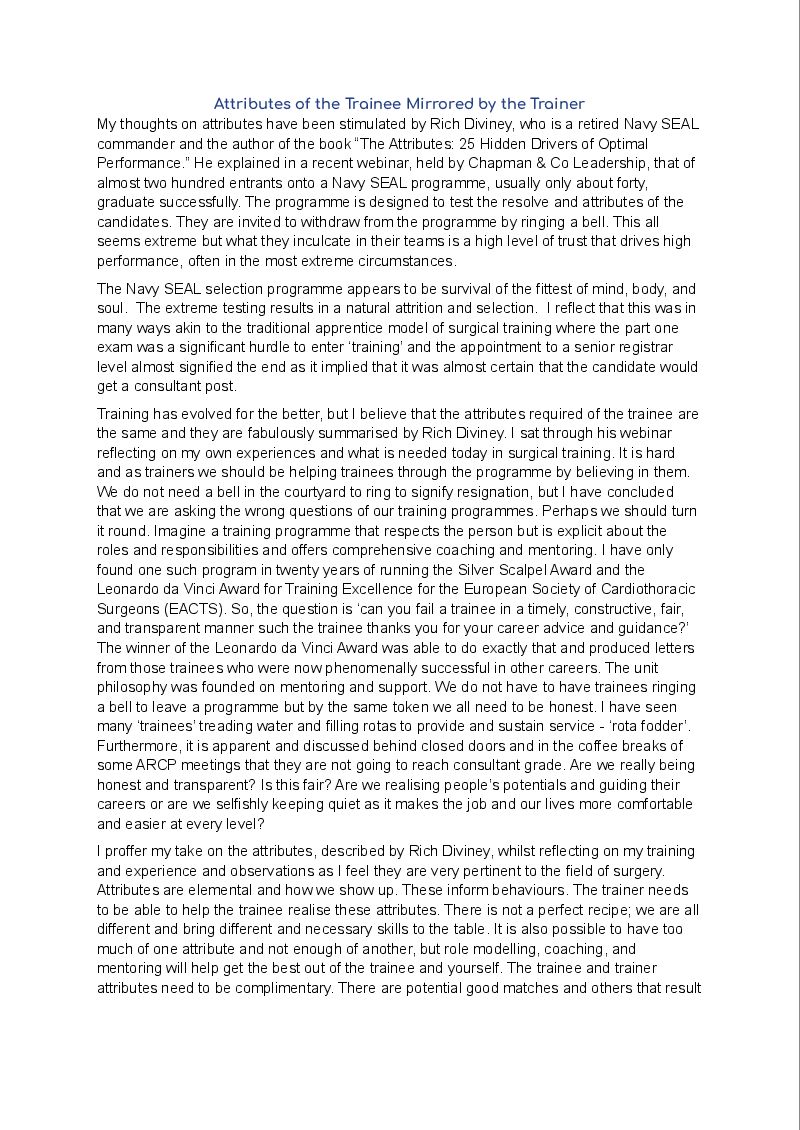 My thoughts on attributes have been stimulated by Rich Diviney, who is a retired Navy SEAL commander and the author of the book “The Attributes: 25 Hidden Drivers of Optimal Performance.” He explained in a recent webinar, held by Chapman & Co Leadership, that of almost two hundred entrants onto a Navy SEAL programme, usually only about forty, graduate successfully. The programme is designed to test the resolve and attributes of the candidates. They are invited to withdraw from the programme by ringing a bell. This all seems extreme but what they inculcate in their teams is a high level of trust that drives high performance, often in the most extreme circumstances.