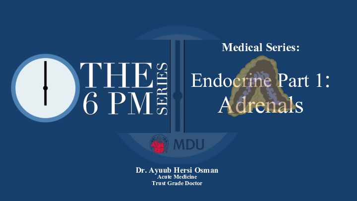 Medical Series: Endocrine Part 1 : Adrenals Dr. Acute Medicineman Trust Grade Doctor6PM Curriculum & Endocrinology • Today Part 1: Adrenals • 16/11/21 Electrolyte Abnormalities part 2 • 17/11/21 Acute Medicine 2 • 23/11/21 Part 2: Parathyroid/Thyroid • Stroke Webinar to be given new date during the series • TBD Part 3: Diabetes (Next Med Series) • TBD Part 4: Disorders of the pituitary & sexual development (Next Med Series)Social Medias Case 1 Question A 75-year-old gentleman was admitted with recurrent falls secondary to orthostatic hypotension. The consultant considers starting fludrocortisone for the which layer are mineralocorticoids released from?ure of the adrenal gland. From A. Zona Fasciculata B. Zona Reticularis C. Zona Glomerulosa D. Medulla E. Don’t know Case 1 Answer From which layer are Fasciculata = cortisol mineralocorticoids released from?Reticularis = sex hormones A. Zona Fasciculata Medulla = catecholamines (e.g. adrenaline) B. Zona Reticularis C. Zona Glomerulosa D. Medulla E. Don’t know The zona glomerulosa release mineralocorticoids mainly aldosterone improved in salt regulation. Case 1 Adrenal Cortex • The adRENAL gland is split into the cortex (outer) and the medulla (inner). • The cortex is split in three further layers, each release their own substance. Cortex Medulla adRENALS Cortex (Zona Cortex Functions- Order GFR) you’d spend the evening in.. Glomerulosa Salt- Mineralocorticoids Fasciculata Sugar- Glucocorticoids Reticularis Miray Kirollos, Sex- DHEA/Testosterone The 6PM Series Case 2 Question A 75-year-old gentleman was admitted with recurrent falls secondary to orthostatic hypotension. The consultant considers starting fludrocortisone for the patient. The consultant goes on to ask you, ‘Which catecholamine is the most abundantly produced in the adrenal medulla?’ A. Adrenaline (epinephrine) B. Dopamine C. Noradrenaline (norepinephrine) D. Acetylcholine E. Don’t know Case 2 Answer Which is most produced by the Adrenal medulla releases about 20% adrenals? noradrenaline, about 1% dopamine and A. Adrenaline (epinephrine) acetylcholine is not a catecholamines. B. Dopamine C. Noradrenaline (norepinephrine) D. Acetylcholine E. Don’t know The most abundantly produced catecholamine is adrenaline at about 80%. Remember adrenals = mostly adrenaline. Case 2 Adrenal Medulla Non-essential amino acid Tyrosine Precursor to all catecholamines. Also used by thyroid to produce T3 & T4 Miray Kirollos, The 6PM Series L-DOPA is a replica of this. Medulla = Mostly DOPA Chromaffin Cells Precursor to the catecholamines. Adrenals=Adrenaline Adrenaline Noradrenaline Dopamine Tyrosine unable to produce i80% 20% <1% Phenylketonuria because of lack of Phenylalanine Hydroxylase Case 3 Question A 70-year-old lady presents to you with palpitations and feeling generally unwell. She has a history of hypothyroidism and hypertension. She has abnormality has most likely been caused?tensive agent. What electrolyte A. Hypomagnasaemia B. Hypercalcaemia C. Hypokalaemia D. Hyperkalaemia E. Don’t know Case 3 Answer Which is most produced by the ACEi do not cause the other electrolytes adrenals? abnormalities. A. Hypomagnasaemia However, calcium and magnesium B. Hypercalcaemia derangements can be associated with C. Hypokalaemia D. Hyperkalaemia palpitations but not sodium. E. Don’t know Hypertension Second line medication for >55years = ACEi ACEi indirectly cause inhibition of aldosterone release by inhibiting production of renin. This can lead to a hyperkalaemia.Case 3 Hyptertension Guidance Calcium channel ACEi or ARB blockers <55 years old >55 years old or Afro-carribean ACEi/ARB + CCB A + C + Thiazide diuretic A + C + T + other (e.g. Alpha blocker)ARB ACEi/ARBs & Aldosterone ACEi ENaC Indirect Na+ + Aldosterone K } Case 4 Question A 70-year-old gentleman presents with a new presentation of acute CCF likely secondary to ischaemic heart disease. On discharge he has been Eplerenone, Aspirin, Ticagrelor and Atorvastatin. How does Epleneronesemide, work? A. inhibitionC synthesis B. Competitive mineralocorticoid receptor binding C. Reduces cortisol production D. NKCC inhibitor E. Don’t know Case 4 Answer How does Eplerenone work? Direct inhibition of ENaC = Amiloride A. Direct ENaC synthesis inhibitioReduce cortisol production = e.g. B. Competitive mineralocorticoid ketoconazole receptor binding NKCC inhibition = loop directs e.g. C. Reduces cortisol production D. NKCC inhibitor furosemide & bumetanide E. Don’t know Potassium Sparing Diuretics Eplerenone and Spironolactone sound like aldosterone – they therefore compete to bind to the same receptor they are aldosteroneanatagonists. K+ Diuretics Mechanism of action ENaC Na+ Aldosterone K+ } Eplerenone Amiloride Competitive mineralocorticoid receptor binding Inhibition of ENAC synthesis Case 5 Question and nauseous. Prior to this she had worsening symptoms of headache, necknwell stiffness and photophobia. O/E A-patent, B- clear air entry, RR 21, Sats 94% OA, C- BP 70/30, HR 110 sinus tachy. D- GCS 13, BM 3.4, E- Abdo SNT. You also note hyperpigmentation around the hands. What is the most likely cause? A. Steroid Withdrawal B. Waterhouse-Friederichsen Syndrome C. TB D. Autoimmune E. Don’t know Case 5 Answer What is the most likely cause? • Steroid Withdrawal- No history of taking A. Steroid Withdrawal steroids. B. Waterhouse-Friederichsen • TB- Most common cause of Addison’s Syndrome worldwide but no history to indicate it. C. TB • Autoimmune- Most common cause in the D. Autoimmune UK, but history of meningitis make this E. Don’t know cause less likely. Waterhouse-Friederichsen Syndrome Likely meningococcal septicaemia (rash not yet developed) causing B/L adrenal haemorrhage. Case 5 Adrenal Insufficiency • Waterhouse-Friederichsen - Rarer cause of adrenal insufficiency. • Usually B/L haemorrhage of the adrenal glands secondary to severe sepsis. • Commonly associated with Neisseria meningitidis (gra