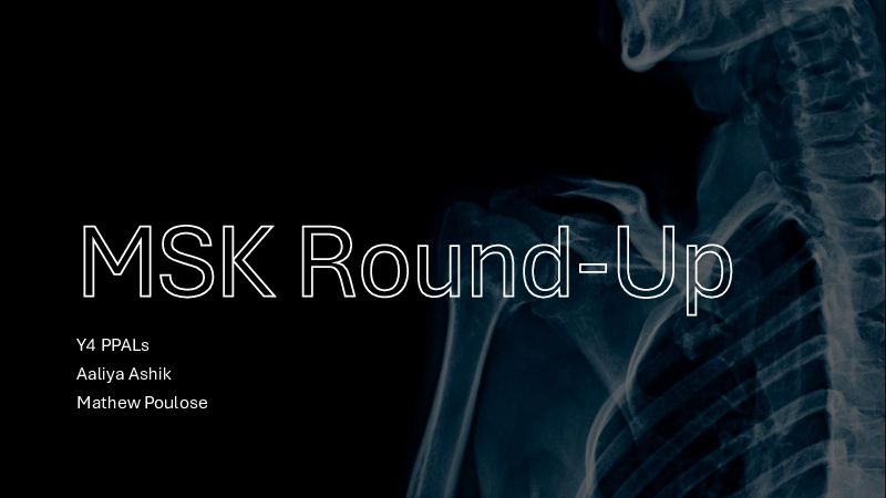 This On-Demand teaching session, MSKRound-Up, led by experts Aaliya Ashik and Mathew Poulose, covers a range of commonly presented conditions, data interpretation, examinations, and explanations with a focus on Musculoskeletal (MSK) conditions. It delves into acute joint pain, chronic joint pain/stiffness, back pain, and common rheumatoid conditions such as SLE and Vasculitides. It imparts detailed knowledge about diseases like Septic Arthritis, Gout, Pseudogout, Rheumatoid Arthritis, Osteoarthritis, and conditions brought under the umbrella of Seronegative Spondyloarthropathies like Psoriatic Arthritis, Ankylosing Spondylitis, and more. The session, directly beneficial for medical professionals, includes a comprehensive interpretation of related SBAR, prescribing and useful summary of common MSK presentations, as well as management strategies for these conditions.