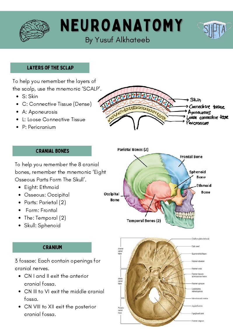 - By the end of the session, learners will be able to describe the anatomical structure of the brain and cranial nerves, as well as recall and utilize relevant mnemonics such as 'SCALP' and 'Eight Osseous Parts Form The Skull'.