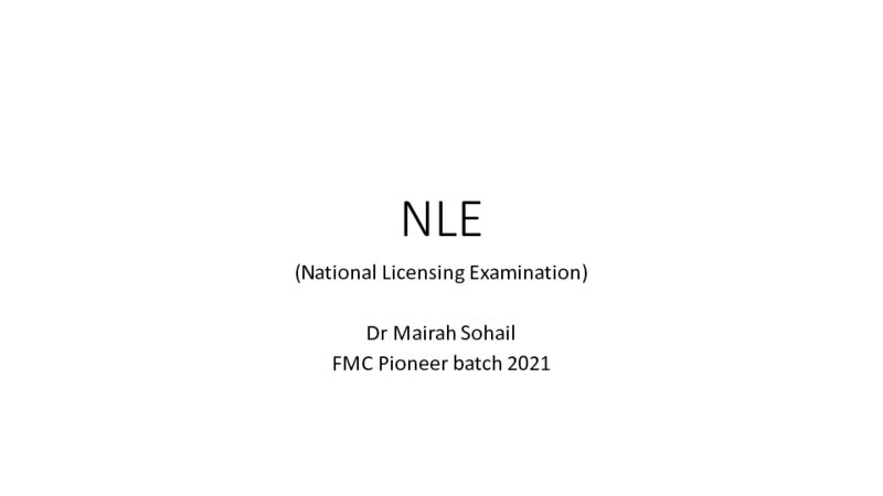 NLE (National Licensing Examination) Dr Mairah Sohail FMC Pioneer batch 2021FOR WHOM? • Both national(gov. and private)and international medical graduates • Conducted for national graduates for the 1 time on 21st27th August 2021. Local graduates only need to pass NLE step 1 for full license.WHY?HOW? • For full license PMC requires NLE Step 1 for local graduates. We get only provisional license after finishing mbbs. • Apply when registration opens on nle.pmc.gov.pk about a month before exam. Get access to teps practice papers. 1 practice test is free. Others charged at 600 Rupees per test. Select test centreand date. • Exam is computerized conducted on tablet computers. There are 200 mcqs to be done in 200 mins. No negative marking. You need 70% to pass. • Mcqsare scenario-based and mostly clinical.Tips to prepare/give le • Do final year well. • Practice tepspapers. Prepare according to mcqsin practice tests. • Revise clinical subjects before exam. • Can revise basic sciences if you get time otherwise you can wing it(I cleared nle without basic sciences revision so yes, it is doable) • Give as soon as possible after final year as your knowledge is fresh.Egs. 1. 45 yrold man has acute chest pain and is prescribed nitroglycerin tablet s/l. Why not asked to swallow? It is inactivated in: • A Blood • B Liver • C Intestines • D Stomach2. 52 yrold hypertensive has deranged LFTS: increased indirect bilirubin. Which drug can cause this? A Beta blocker B Hydralazine C Hydrochlorothiazide D Methyldopa3. A 46 yr old male has acute abdominal pain with migratory thrombophlebitis. What can be the cause? A. Acute pancreatitis B. Viral hepatitis C. Cystic fibrosis D. DM4.A young girl brought in ER with acute abdomen. Pain started in umbilicus radiating towards RIF . Tenderness increases on flexing right thigh and medially rotating it. Most likely site of appendix: A pelvic B Retro colic C Sub cecal D Paracolic5. Pt has difficulty in raising arm above head following injury in right axilla. On examination inferior angle of right scapula was more prominent. Nerve most likely injured is? A Axillary N B Long thoracic N C Thoracodorsal N D Upper and lower subscapular N6. Healthy primigravida in last trimester of pregnancy reports easy fatiguability. Most likely cause of anemia is: A Pyridoxine deficiency B Fe deficiency C Hemodilution D B12 deficiencyans 1. B 2. D 3. A 4. A 5. B 6. CBEST OF LUCK!