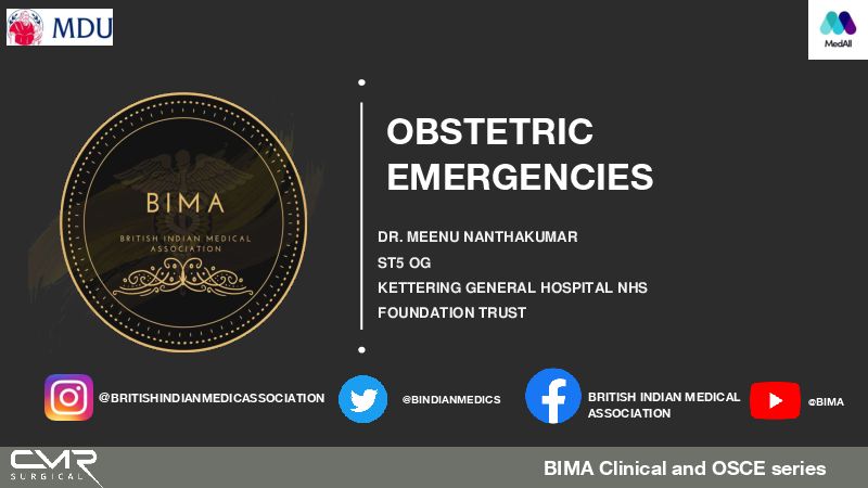 The British Indian Medical Association (BIMA) are delighted to present the next set of clinical lectures in obstetrics and gynaecology (O&G) with a session on obstetric emergenices. This session will be led by Miss Meenu Nanthakumar, ST5 trainee currently based at Kettering General Hospital, East Midlands, who has multiple years of clinical and teaching experience in O&G. We look forward to seeing you at this interesting and important session!