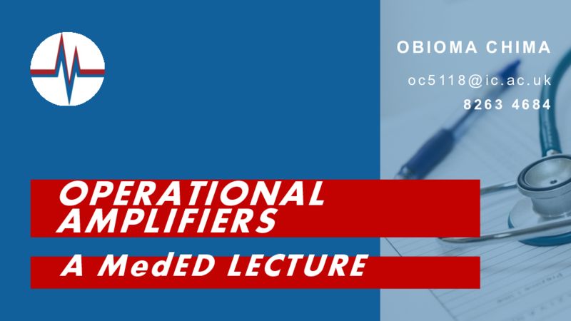 OBIOMA CHIMA oc5118@ic.ac.uk 8263 4684 OPERATIONAL AMPLIFIERS A MedED LECTURESESSION STRUCTURE Characteristics of ideal Questions opamps Different OPAMP configurations What is an OP AMP • These are devices that amplify an input vintage (V ) and produce an outputVoltagoutV ) by a scale factorA • Comprised of transistors, capacitors and resistors but represented by this simple schematic • To operate, they require connection to an external power source (Vs+ andVs-) • These are usually emitted from schematic drawings IMPORT ANT EQUA TIONS • A OLthe open loop gain (scale factor of amplification), is a ratio outV in A =V /V OL out in • V in the difference between the inverting and non-inverting terminals (V -V) + - Assumptions of an ideal OP AMP 1. The open -loop gain is very large (A => ∞), 4 6 OL often in the range of 1 10 Iin 0A 2. The input terminals have infinite resistance so no current flows into them 3. In closed-loopconfigurations, the inverting (V-) and non-inverting (V+) terminals are connected via a virtual shor -t ircui(the voltages going into both terminals is temore on this later) Characteristics of OP AMPs • The output of an OPAMP is limited by the maximum positive and negative values of the power supplys+V andVs- • For instance, if a 5V power source was used to power the opamp, the amplified output signal wousdturate at ±5V (V ≤ 5V) out • The response of an opamp has a linearand saturation region • TheVin (diff between terminals) atwhichtheopampsaturatesis usually in the order of ±100µVSESSION STRUCTURE Characteristics of ideal Questions opamps Different OPAMP configurations CONFIGURATION 1: The Comparator • An open-loopconfiguration • A simple way to compare the magnitude of the two input signals • A OLx (V+-V)-=V out • We know open-loop gain,A , OL very large, so even small changes in the input terminals can cause large voltages attheoutput,oftenleadingtosaturation • For example, IfV+= 3.00V andV -3.001V ,Voutould be: 6 A OLx (- 100μV) and for a gain of 10 and rails of-5V and +5V , the output signal out) would saturate at -5V • This indicates thatV+V - • A maximum positiveVout would indicateV >V- + CONFIGURATION 2: Voltage Follower • A closed-loopconfiguration • This is an OPAMP circuit in which the input voltage is EQUAL to the output voltage • This configuration is used to provide the same voltage to a load without drawing any current due to its high input resistance CONFIGURATION 3: Inverting Amplifier • This is used when smaller gains are required • This produces an output voltage with an inverted polarity to the input voltage • This is achieved by feeding some of the output back to the V- (inverting) terminal of the opamp and grounding the non-inverting terminal (V+) CONFIGURATION 4: Non - Inverting Amplifier • This produces an output voltage without an inverted polarity to the input voltage (polarity is the same) • This is achieved by feeding some of the output back to th- V (inverting) terminal of the opamp and grounding the inverting terminal (V-) Here, the gain is controlled by adjusting the magnitude of the 2 resistorsSESSION STRUCTURE Characteristics of ideal Questions opamps Different OPAMP configurationsQuestion Open-loop gain is 10Question What configuration is shown here?OPAMPs: Summary slide Characteristics Important OPAMP configurations 1. Voltage follower (V =V in out • Open-loop gain is very large 2. Comparator • Input terminals 3. Inverting Amplifier have infinite 4. Non-inverting Amplifier resistance • In closed-loop OPAMPs, theV+ andV- terminals are connected via a virtual shortTHANKYOU FOR COMING! PLEASE FILL IN THE FEEDBACK FORM!MedED lecture masterslide COLOURS FONTS Red banner: #C20101 Titles:AHRONI Blue background: #1D5F97 Subtitles: ARIAL Grey background: #D9D9D9 Text: ARIAL White/ black writing