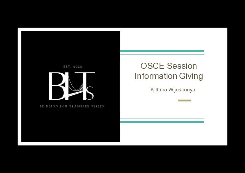 OSCE Session InformationGiving Kithma WijesooriyaPossibleInformationgivingstations 1. MedicationCounselling i. Metformin ii. Insulin iv. Warfarinexate v. Contraception 2. DiagnosisCounselling i. Diabetes ii. COPD iii. Hypertension iv. Epilepsy 3. Procedure Counselling i. Endoscopy/colonoscopy 4. Other i. Smoking cessation ii. Inhaler technique1. Introduce yourself 2. Confirm name and date of birth 3. Explain purpose of the consultation + patients expectations from the consultation 4. Prior knowledge 5. Chunk and check 6. Encourage patient to ask questions 7. Summarise 8. Give written material to take home 9. Contact information 10.Thank the patientMedicationCounselling Case 1 Mr.X is a 60 year old male patient who is being started on Warfarin for Atrial Fibrillation.Sohowdoyou wantto starttheconsultation…Sohowdoyou wantto starttheconsultation 1. Introduce yourself 2. Confirm name and date of birth 3. Explain purpose of the consultation Today we are going to talk about warfarin…. 1. Prior knowledge i. Whatdoyou alreadyknowaboutwarfarin?Explainwhatwarfarinis - Anticoagulant - Thinstheblood - Reducelikelihoodofclots formingHowto takeit - Every day at the same time - Tokeep levelssteady - Usuallyat6pm - Usuallylifelongor untilyou doctor tellsyou to stopMisseddoses - Take the missed dose as soon as you remember - Never take two doses at once - Inform the doctor/nurse about missed doses at your next appointmentSideeffects - Minor Bleeding - usually settles on its own and can carry on taking warfarin - Epistaxis - Bleedinggums - Bruising - Major bleeding - Seek medical advice - Haematuria - Haematemesis - MalenaMonitoringandfollowup INR - Blood test - Dose of warfarin based on INR level - Target INR range What to take to follow up appointment - Yellow bookletLifestyleadvice - Food high in Vit K can affect warfarin levels - Alcohol intake - Cranberry juiceOther importantinformation - Let your doctor/anticoagulation nurse know if you have been prescribed new medications since the last visit (including herbal medication) - Let other health professionals know you are on warfarin ie dentist, pharmacist, podiatrist etcAttheend Summarise Give Leaflets Safety net Thank the patient DiagnosisCounselling i. Diabetes ii. COPD iii. Hypertension iv. Epilepsy v. MultipleSclerosisCase 2 - Mrs A has come to the GP to discuss her recent blood pressure measurements. Explain the diagnosis and management plan with the patient1. Introduce yourself 2. Confirm name and date of birth 3. Explain purpose of the consultation + patients expectations from the consultation 4. Prior knowledge 5. Chunk and check 6. Encourage patient to ask questions 7. Summarise 8. Give written material to take home 9. Contact information 10.Thank the patientHypertension What is it? - Normal anatomy and physiology - Heartis a muscularstructureinour chestthatpumpsblood tothe restof our body - In Hypertension - Pressureof theblood goingaroundthebody is too high - Strainon the heart→ heartproblems(MI) - Causea blood vesseltoburstin eye/brain/kidneysWhatdo thetop andthebottomnumbersmean ?High blood pressure: STAGE1 - Between 140/90 mmHgand 160/100 mmHgin the clinic,or 135/85 mmHg to 150/95 mmHg at home. STAGE2 - Between 160/100 mmHgand 180/120 mmHgin the clinic,or over 150/95 mmHgat home. STAGE3 - Systolic over 180 mmHgor diastolic bloodpressureis over 120 mmHg in theclinic.Management Lifestyle modifications 1. Regular exercise 2. Eat a healthy diet 3. Quit smoking 4. Limit alcohol 5. Manage stressMedication If <55 or Type 2 diabetes → ACEI or ARB If >55 and No Type 2 Diabetes OR African/caribbean ethnicity → CCBAttheend Summarise Patient questions Give Leaflets/links Safety net Thank the patientAdviceforOSCEs in General 1. Be polite 2. Read the question! Only do what is asked of you 3. Always ask about red flag symptoms 4. Always safety net 5. If you don't know something it is okay to tell the patient/examiner you don't know but say you will ask a senior/look in BNF/Look in hospital guidelines etc 6. Practice, Practice,PracticeFeedbackQR code