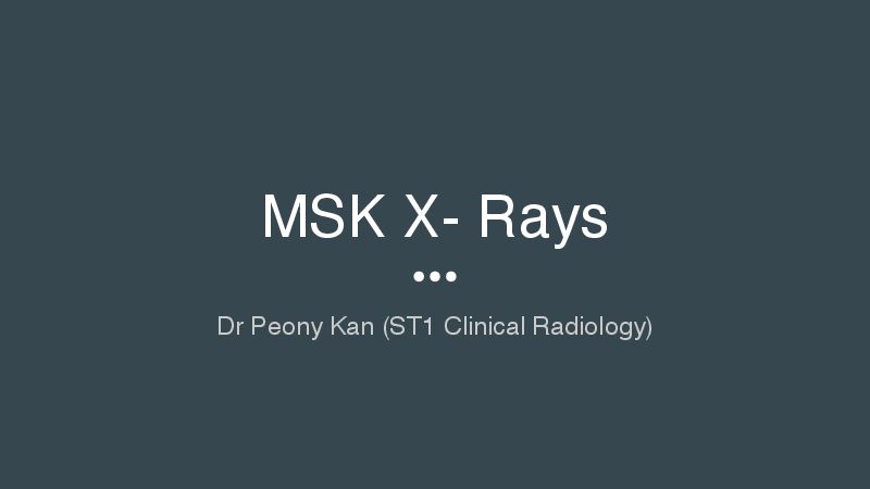 MSK X- Rays Dr Peony Kan (ST1 Clinical Radiology)Objectives ● Have general approach to presenting MSK x-rays ● Exposure to common OSCE cases ● Gain some phrases and terms to describe your findings ● Get a flavour of common questions that might come up in MSK Xray OSCE stationsTo start off… 1. Patient demographic 2. Date 3. View 4. Body part being imaged (+ laterality) 5. Quality of film ○ Joint above & below ○ Rotation ○ PenetrationInterpretation of findings (ABCS) A lignment: dislocation, subluxation B ones: trace the cortex, ? fractures C artilage: joint spaces, disruption of joint contours S oft tissues: swelling, foreign bodies, disruption, calcificationAlignment 1. Fracture/ subluxation/ dislocation? 2. How is it displaced? ○ Check other views ○ Displacement refers to the relation of the fragment distal to the fracture site ○ Angulation ○ TranslationBones- Trace the cortices! 1. Where (which bone, extra/ intra articular) 2. Complete/ Incomplete (which subtype) 3. Open/ Closed 4. Displacement (look at a different view) 5. Shortening 6. +/- comment on bone texture (trabecular pattern)Cartilage 1. Review joint spaces 2. Narrowing can be due to: ○ Cartilage loss ○ Osteophytes ○ CalcificationSoft Tissue 1. Localised swelling 2. Joint effusions 3. Fat pads 4. Foreign bodies 5. Anything else…To complete… 1. Check other views (if not already done) 2. History and examination of patientPaediatric incomplete fractures Buckle fracture Greenstick fracturePaediatric fractures- Salter Harris classification ● Growth plate/ physis ● Mnemonic: ○ Slipped/ straight ○ Above ○ Lower ○ Through ○ RuinedCases Putting it all together…Left knee AP XRLeft knee XR ● Patient demographics ● Asymmetrical reduction of femorotibial joint space ● Osteophytes (medial femur & lateral tibia) ● Subchondral sclerosis (tibial plateau) ● No fracture, no misalignment ● Soft tissue normal Diagnosis= Osteoarthritis of the left knee ● Review other views ● Complete with history and examOsteoarthritis vs Rheumatoid vs Psoriatic arthritis?Osteoarthritis vs Rheumatoid vs Psoriatic arthritis?Osteoarthritis vs Rheumatoid vs Psoriatic arthritis?GoutPseudogout / Calcium pyrophosphate dihydrate deposition disease (CPPD)Common pathologies in the joint ● Rheumatoid arthritis ● Psoriatic arthritis ● Gout ● Pseudogout / Calcium pyrophosphate dihydrate deposition disease (CPPD)Right shoulder APRight shoulder XR ● Patient demographics ● Lightbulb sign appearance of right humeral head (internal rotation of humerus) ● No dislocation of the AC joint ● No fractures Diagnosis= Posterior dislocation of right shoulder (glenohumeral) joint ● Review other views ● Complete with history and examAnterior shoulder dislocationCommon pathologies on shoulder XR ● Anterior glenohumeral joint dislocation ● Acromioclavicular joint dislocation ● Clavicle fracture ● Proximal humeral fractureLeft upper limb XR AP: Lateral:Left upper arm XR ● Patient demographics ● Complete, extra-articular, transverse fracture in the left distal radius ● Closed fracture ● Palmar/ volar angulation ● No significant joint swelling Diagnosis= Smith’s/ reverse Colles’ fracture ● Complete with history and examWhich of the following statement is false regarding Colles’ fracture? A. Distal radius fracture with palmar/volar angulation B. Associated with fall on a outstretched hand (FOOSH) C. Associated with a ‘dinner fork’ deformity D. It is common in the elderlyFracture-dislocation of the upper limb Monteggia fracture-dislocation Galeazzi fracture-dislocation ● Fracture of the proximal ULNAR shaft with ● Fracture of the distal RADIUS with dislocation of the RADIAL head (proximal) dislocation of the distal radioULNAR joint GRUesome MURder Scaphoid fracture Complication if left untreated?Common pathologies in the upper limb XR Upper limb: ● Distal radius fractures (Colles’, Smith’s) ● Fracture-dislocations (Monteggia, Galeazzi) Wrist/ carpal bones: ● Scaphoid ● Triquetral ● Distal radioulnar joint dislocation ● Perilunate dislocationRight hip XRRight hip XR ● Patient demographics ● Displaced, comminuted oblique intertrochanteric fracture of the right femur ● Extra-capsular ● No dislocation ● Hip joint space is preserved Diagnosis= Right intertrochanteric fracture ● Review other views ● Complete with history and examWhich of the following statement is false? A. Intracapsular hip fractures are at risk of avascular necrosis of the femoral head B. Garden classification is used to assess risk of osteonecrosis in subcapital hip fractures C. Disruption of the circumflex femoral arteries can lead to avascular necrosis D. Transcervical fracture is a subtype of extracapsular fracturePubic rami fracturePerthes vs SUFE?Perthes vs SUFE?Common pathologies in the pelvis and hips Pelvis: ● Pubic rami, open book, acetabular, avulsion fractures Hips: ● Neck of femur fractures ○ Hip prosthesis ○ Garden classification system ● Paediatric hip conditions ○ Perthes Disease ○ Slipped upper femoral epiphysisLeft ankle XR AP: Lateral:Left ankle XR ● Patient demographics ● Comminuted oblique fracture of the distal left fibula ● At level of the syndesmosis ● Mild dorsal displacement ● Mild soft tissue swelling Diagnosis= Left distal fibula fracture (Weber B) ● Complete with history and examWeber classificationWhich of the following is false regarding Weber’s classification? A. Widening of the tibiofibular joint can be seen in Weber’s B injury B. Weber C fractures are above the level of the syndesmosis C. Weber A fractures are above the level of the syndesmosis D. Weber’s classification is important in determining treatment of distal fibula/ lateral malleolus fracturesCommon pathologies in the ankle and foot Ankle: ● Distal tibia (medial malleolus) ● Distal fibula (lateral malleolus) Foot: ● Metatarsal ● CalcanealSummary and Exam Ti