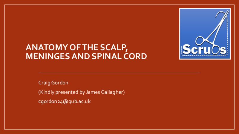 ANATOMYOFTHESCALP , MENINGESANDSPINALCORD CraigGordon (Kindly presented byJamesGallagher) cgordon24@qub.ac.ukLearningOutcomes • 1. Describe and identify the layers of the scalp • 2. Describe the arterial supply and venous drainage of the scalp and identify the principal vessels involved • 3. Describe the cutaneous innervation of the scalp and identify the principal nerves involved • 4. Describe and identify the structure and arrangement of the dura, arachnoid and pia mater • 5. Describe the anatomy of and identify the anatomical features of the spinal cord • 6. Describe the formation and location of the spinal nerves and identify the spinal nervesLayers of theScalp mnemonic Layers of skin & connective tissue overlying cranium Skin Connectivetissue(DENSE) Aponeurosis (connectingoccipitalis &frontalis) Looseconnectivetissue PeriosteumArterialSupply of theScalp The picture can't be displayed. • Within loose connective tissue layer • Fromexternalcarotidandophthalmic arterybranches • Superficial temporal • Occipital • Posterior auricular • supraorbitalandsupratrochlear (fromophthalmicaa.)Venous Drainage of the Scalp • Divided into superficial and deep drainage • Superficial veins follow arterial supply •superficial temporal, occipital, posterior auricular, supraorbital and supratrochlear veins • Deep region drained by pterygoid venous plexus •Drains into maxillary vein • Scalp veins communicate with diploic veins in the skull viaemissary veins •Infection of the loose connective tissue can therefore spread internally to the meningesCutaneous NerveSupply of theScalp • Cutaneous innervation derived from trigeminal nerve anteriorly and cervical nerves posteriorly • Trigeminal branches • Supratrochlear nerve (Va) • Supraorbital nerve (Va) • Zygomaticotemporal nerve (Vb) • Auriculotemporalnerve (Vc) • Cervical branches • Lesser occipital nerve • Greater occipitalnerve • Great auricular nerve • Third occipital nerveScalp injuries • Scalplacerations will bleedprofuselyfor severalreasons • Scalpis highlyanastomosedwithrich bloodsupply • Pulloftheoccipitofrontalismakesclosure of bleeding vessel difficult • Thebloodvesselsareadheredtodense connective tissue,preventingthe vasoconstrictionthatnormallyoccursin response todamageMeninges • Membranous layers that immediately underly cranium and surroundCNS • Functions: 1. Provides protection to the brain 2. Gives supporting network for arteries, veins and venous sinuses 3. Encloses brain inCSF-filled cavity (subarachnoid space)Meningeal layers • DURA mater •Thick, outermost layer •Dural reflections •Dural-venous sinuses •Sensitive to pain • ARACHNOID mater •Arachnoid granulations •Sub-arachnoid space • PIA mater •Delicate & closely adhered to brain •Highly vascularised, supplies brain •Follows contours of brainDural reflections Dural infoldings project into cranial cavity; they anchor the brain and divide the cranial cavity into compartments 1. Falx cerebri 2. Falx cerebelli 3. Tentorium cerebelli 4. Diaphragma sellaeMeningitis • “Inflammation of the meninges lining the brain and spinal cord” • Bacterial causes: NHS •Neisseria meningitidis •Haemophilus influenzae •Streptococcus pneumomia • Presentation: Headache, seizures, neck stiffness, photophobia, vomiting •Non-blanching rash in meningococcal meningitis •Nonspecific signs in neonates: poor feeding, hypotonia, bulging fontanelle Bacterial vs viral meningitis on lumbar punctureExtradural Haematoma •Haematomabetweendura materandskull •Commonlyfrom middle meningeal artery rupturefrom skullfractureatpterion •Biconvex shapeonCTbrainSubdural Haematoma • HaematomabetweenDuramaterand arachnoidmater • Bleedingsource:bridgingveinscrossing fromcortex toD-Vsinuses • Concave,“banana”shape onCT brain • Moreoftenelderlypeople;canbechronic The picture can't be displayed. SpinalCord • Continuation of medulla, exits foramen magnum • Conus medullaris is the enlargement at the end of the spinal cord •L1/2 in adults •L3 in infants • Discrepancyduetospinalcordgrowingearlierin development than vertebrae • Filum terminale is an extension of the pia mater; anchors spinal cord to coccyx Cauda equina syndrome •Cauda equina= bundle of nerves arising from conus medullaris and occupying lumbar cistern •Nerves L2-5,S1-5 &Cc1 (coccygeal nerve) •Cauda equina syndrome is a surgical emergency caused by compression of the cauda equina •Red flag symptoms •Severe lower back pain •Saddle anaesthesia •Bowel, bladder and sexual dysfunction •Bilateral sciatica SpinalCord cross-section •Grey matter centrally, white matter peripherally •Posterior horn= receivesnsory afferents •Posterior=pointy=sensory •Anterior horn= contains motor neuronsSpinal nerve formation • Dorsalrootcontainsafferent sensory fibres • Ventral root contains efferent motor fibres • Theseunitetoformthespinalnerve • Thespinalnervedividesintodorsal andventral rami,whicharemixedLumbar Puncture • Collection ofCSF from lumbar cistern for diagnostic or therapeutic purposes • Needle site • Usually between L3/L4 in adults • Usually between L4/L5 in children • Layers • Skin • Subcutaneous fat • Supraspinous ligament • Interspinous ligament • Ligamentum flavum • Dura mater • Subdural space • Arachnoidmater