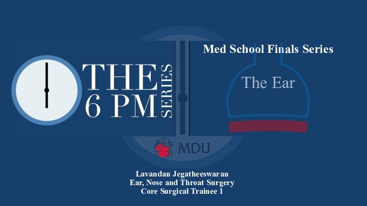 Med School Finals Series The Ear Lavandan Jegatheeswaran Ear, Nose and Throat Surgery Core Surgical Trainee 1Social Medias Case 1 Question Label the different structures of the pinna: A G B F E C DCase 1 Answer A G B F E C DStructure of the Ear Case 2 Question Label the different structures seen through the tympanic membrane:Case 2 Answer A B C D G E F Case 3 Question You are asked to see a 3 year old boy brought in by his mother. She reports that the child has had recent cold like symptoms. In the last 4 days, she reports the child being more irritable than usual and is constantly tugging on their right ear. Clinically he appears distressed and says “ear hurts mummy”. Mother reports that he has been off his food and having on and off fevers. E/ What is your primary diagnosis? A/ Patent B/ A. Acute sinusitis Sats 99% OA B. Cholesteatoma RR 22 C. Acute Otitis Media C/ HRBP 110/70larAlert but irritable D. Acute Otitis Externa CRT <2 PEARL Enlarged E. Don’t know seconds Temp 38.0 lymphadenopathy on HS I + II + 0 R side Case 3 Answer What is the most likely cause? The acute presentation of the child’s A. Otitis Media with Effusion symptoms, alongside the recent viral illness B. Cholesteatoma and clinical features of ear pain and C. Acute Otitis Media erythematous tympanic membrane points D. Acute Otitis Externa towards an infective cause of the middle E. Don’t know ear. • The acute nature of the child’s presentation rules out otitis media with effusion and cholesteatoma, both of which usually are chronic in nature and painless. • Acute Otitis Externa involves the ear canal +/- the pinna and tends to be associated with ear discharge and pain. Case 3 Explanation • 2nd most common paeds ENT presentation • Acute inflammation of middle ear and may be caused by bacteria or viruses • Haemophilus influenza • Strep pneumoniae • Moraxella catarrhalis • Strep pyogenes • RSV • Rhinovirus • Complication of URTI Case 4 Question You have diagnosed the 3 year old child with acute otitis media. They are currently in Paediatric A+E. After being given some analgesia in ED, they have been able to eat and drink. You have been asked by your senior for a management plan. How would you manage this patient? A/ Patent E/ A. Analgesia and home with no antibiotics B/ B. Analgesia and admit for pain relief Sats 99% OA RR 22 C. Analgesia and antibiotics and C/ admit HR 95 Regular D/ BP 110/70 Alert D. Analgesia and antibiotics and CRT <2 PEARL Enlarged home seconds Temp 37.5 lymphadenopathy on HS I + II + 0 R side E. Don’t know Case 4 Answer How would you manage this patient? Given the fact that the child is now able to eat A. Analgesia and home with no and drink, with normal observations and the antibiotics pain is controlled with simple analgesia, the B. Analgesia and admit for pain reliefhild can be deemed safe for discharge. C. Analgesia and antibiotics and admit D. Analgesia and antibiotics and homeAntibiotic usage is controversial but in this case E. Don’t know as there has been no resolution within 3 days, it is worth thinking about. Most patients with acute otitis media do not need admitting, unless they are very young, unable to tolerate anything orally or have complications of acute otitis media. Case 4 Explanation • Acute Otitis Media tends to resolve within 3 days, but can take up to 1 week to resolve • Antibiotics guided by clinical picture of patient • Complications • Mastoiditis • Sepsis • Meningitis • Brain Abscesses • Chronic perforations Case 5 Question You are asked to see a 35 year old man who presented with 3 day history of left ear pain. He states the pain to be unbearable. He reports persistent yellow discharge – trying to stem discharge by using cotton wool buds. Reports hearing being slightly muffled in his left ear. He also reports that he was at the seaside few days prior on holiday. A/ Patent E/ A. Perichondritis B/ B. Acute Otitis Externa Sats 99% OA RR 17 C. Acute Otitis Media D. Cholesteatoma C/ D/ HRBP 120/70lar GCS 15 E. Don’t know CRT <2 BM 8.0 seconds PEARL HS I + II + 0 Temp 37.0 Case 5 Answer What is the most likely cause? The acute nature of the presentation, A. Perichondritis alongside risk factors such as cotton wool B. Acute Otitis Externa bud usage and recent history of swimming C. Acute Otitis Media in untreated water points towards Acute D. Cholesteatoma Otitis Externa. E. Don’t know Severe otitis externa can affect the pinna and cause perichondritis in severe cases however this is not evident from the patient’s current condition. Acute Otitis Media can cause otorrhoea but that is usually after the tympanic membrane perforates – the pain also reduces once this happens. Cholesteatoma causes painless otorrhoea. Case 5 Explanation • Also known as swimmers ear, affects the ear canal and pinna • Affects middle aged people • Symptoms: • Otalgia • Otorrhoea • Itchiness in the ear canal • Temporary hearing loss • Diabetics or immunosuppressed people at high risk of developing malignant otitis externa – causes facial nerve palsy after invasion of the temporal bone Case 5 Management • Usually a course of topical ear drops – otomize, sofradex, ciladex, gentisone • If persistent otorrhoea +/- ear canal stenosis – will need referral to ENT emergency clinic for microsuctioning +/- pope wick removal • Good analgesia required • Ear swab also useful • Prevention is cure – avoid exposure to water Case 6 Question You are asked to see a 4 year old who has presented with hearing loss. An audiogram is performed. What type of hearing loss is present? A. Bilateral conductive hearing loss B. Left conductive hearing loss C. Right sensorineural hearing loss D. Normal hearing E. Don’t know Case 6 Answer What is the most likely cause? There is an upsloping bilateral conductive A. Bilateral conductive hearing loshearing loss (air bone gap >10dB). Hearing is B. Left conductive hearing loss worse than 20dB hear