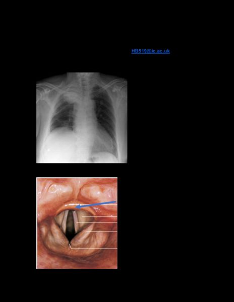ICSM Surgical Society- Junior Anatomy Series - Thorax and Heart Mock Author: Harroop Singh Bola (HB519@ic.ac.uk) 1). What can cause this pathological condition? Answer: Right phrenic nerve palsy In phrenic nerve palsy, the hemidiaphragm supplied by the affected portion is elevated. 2). Identify the labelled structure Answer: Epiglottis3). Describe the function of the labelled structure Answer: Humidification and warming of inspired air. 4). Answer: Chordae tendineae The labelled structure is the tricuspid valve, contraction of the papillary muscles causes the chordae tendineae to close the valve, and prevent from being inverted into the right atrium. Which structure prevents the labelled valve from being inverted into the right atrium?5). Answer: Internal intercostal muscle Deep to the external intercostal muscles, the direction of the fibres latero-inferiorly. What muscle is indicated by the arrow? 6). Answer: C5 Structure 10 is the oesophagus Structure 10 begins at which vertebral level? 7). What surface landmark is associated with Answer: Sternal Angle (Angle of Louis) structure 3? The arch of the aorta is found at the T4 vertebral level.8). Stiffening of this structure can cause what Answer: Ejection systolic murmur pathological heart sound? Labelled structure is an Aortic valve. Remember that the pulmonary valve lies on top of the aortic valve. Aortic stenosis causes ejection systolic murmur and can be auscultated at the carotid artery. This sound happens between the normal S1 (lub) and S2 (dub) sounds. 9). Label the following structure Answer: Oblique Fissure Separates the superior from the inferior and middle right lung lobes.10). Which specific cardiac chamber does the Answer: Right Ventricle labelled vessel arise from? The mediastinal surface of the right lung is illustrated, as determined by the absence of a cardiac impression, in addition to the presence of three lung lobes - Upper, middle and lower. Pulmonary arteries transport blood out of the right ventricle into pulmonary circulation for oxygenation. 11). Which structure is more prone to inhalation of Answer: Right Main Bronchus a foreign object? The right main bronchus is steeper and wider comparatively to the left main bronchus, therefore is more susceptible to the aspiration of foreign objects. 12). Label the following the structure Answer: Carina A cartilage situated at the point where the trachea divides into the two bronchi. 13). Which structure resides most inferiorly to the Answer: Intercostal Nerve label? Labelled is the costal groove, to which the neurovascular bundle resides (VAN), from superior to inferior: Vein, Artery, Nerve.14). At which vertebral level does the labelled Answer: T8 structure penetrate the diaphragm at? Superior vena cava is labelled. Vena Cava = 8 letters, therefore T8. 15). What is the specific labelled vessel? Answer: Left Common Carotid Artery16). What is the anatomical surface landmark of the Answer: Midclavicular line, left 5th intercostal space. labelled structure? Labelled: Apex of the heart17). Which vessel supplies this structure? Answer: Right coronary artery Labelled: Right atrium 18). Where does the labelled vessel originate from? Answer: Left Aortic Sinus of the ascending aorta Labelled: Left coronary artery19). Which specific cardiac structure does the Answer: Sinoatrial node labelled artery supply? Labelled: Sino-atrial nodal branch of the right coronary artery. 20). What is the origin of the labelled artery? Answer: Right Coronary Artery Labelled: Posterior interventricular artery21). What is the labelled structure? Answer: Coronary Sinus 22). Where do the labelled vessels drain into? Answer: Coronary Sinus Labelled: Middle cardiac veins23). Inflammation of the following structure Answer: Myocarditis manifests as what pathology? Labelled: Myocardium 24). What is the precursor of the labelled structure? Answer: Foramen Ovale Labelled: Fossa Ovalis25). What is the following labelled structure? Answer: Pectinate muscle 26). Which heart sound is auscultated upon the Answer: S2 closure of the labelled valve? Labelled: Pulmonary valve27). What is the specific structure labelled below? Answer: Posterior aortic sinus Non-coronary, there is no coronary artery arising from this sinus. 28). What is the specific structure labelled? Answer: Thoracic ganglia29). Label the following structure Answer: Left Oblique Fissure Coronal CT, IV contrast using lung windows 30). Label the following structure Answer: Ascending Aorta31). Label the following structure Answer: Sternal Angle 32). What lung pathology is demonstrated by the Answer: Right-sided tension pneumothorax chest radiograph?33). Name the following structure Answer: Jugular (Suprasternal) Notch 34). Which rib is shown below? Answer: First rib Presence of scalene tubercle, and subclavian grooves.35). Which category of ribs is shown below? Answer: False ribs Unification of cartilage, and thus do not have a direct articulation with the sternum. 36). Which pericardial layer is shown below? Answer: Fibrous pericardium37). What is the foetal derivation of the following Answer: Ductus arteriosus structure? Labelled: Ligamentum arteriosum 38). The two vessels unite to form what vessel? Answer: Left Brachiocephalic vein Labelled: Subclavian and internal jugular vein 39). Which nerve is labelled below? Answer: Left Vagus Nerve 40). Label the following muscle Answer: External intercostal muscle41). What is the primary function of the labelled Answer: Forced Expiration muscle? Labelled: Internal Intercostal Muscles 42). What is the labelled structure? Answer: Internal Thoracic Artery 43). What is the labelled structure? Answer: Serous pericardium44). What is the specific part of the lung labelled? Answer: Left Apex 45). Name the specific structure of the lung Answer: Lingula of left lung
