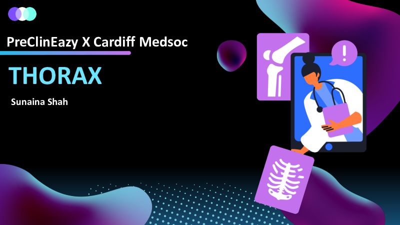 PreClinEazy X Cardiff Medsoc THORAX Sunaina ShahThorax Anatomy Anatomy of the ribs Thorax muscles Lungs and Heart anatomy Pleura and Pericardium Mediastinum A) True rib and typical A 43-year-old woman presents to the emergency department with chest pain that hurts more when she B) False rib and typical presses on it. She is diagnosed with costochondritis (inflammation of the ribs). The doctor sees you and C) False rib and atypical decides to question you about the ribs. He asks you, D) True rib and atypical What are the features of the second rib? E) Floating rib and typical A) True rib and typical A 43-year-old woman presents to the emergency department with chest pain that hurts more when she B) False rib and typical presses on it. She is diagnosed with costochondritis (inflammation of the ribs). The doctor sees you and C) False rib and atypical decides to question you about the ribs. He asks you, D) True rib and atypical What are the features of the second rib? E) Floating rib and typical Classification Examples Based on their True Ribs 1-7 relationship to False Ribs 8-10 the sternum Floating Ribs 11-12 Based on their Atypical Ribs 1, 2, 10, 11 CLASSIFICATION OF features and 12 RIBS AND PARTS OF Typical Ribs 3-9 Jugular notch STERNUM Manubrium Sternal angle Body of sternum Xiphoid processnumber-typical-atypical-ribs-ossification-and- clinical-value/ A) 4 and 5 ribs There are different types of vertebrae that make up the spine. The ribs attach to the thoracic vertebrae and rd th B) 3 and 4 ribs each of them articulate with two ribs at the superior and inferior demi-facets. The neurologist asks you, C) 3 and 5 ribs th Which ribs would articulate with the 4 thoracic D) 5 and 6 ribs vertebrae? A) 4 and 5 ribs There are different types of vertebrae that make up the spine. The ribs attach to the thoracic vertebrae and rd th B) 3 and 4 ribs each of them articulate with two ribs at the superior and inferior demi-facets. The neurologist asks you, C) 3 and 5 ribs th Which ribs would articulate with the 4 thoracic D) 5 and 6 ribs vertebrae? VERTEBRAE Facet that articulates with rib head Body Body Cervical vertebra Foramen Pedicle Foramen Pedicle Superior articular facet Transverse process Lamina Transverse process Lamina Facet that Body Superior articular facet rib tuberculeith Spinous process Transverse foramen Spinous process Superior articular facet Lamina Thoracic vertebra Foramen Lumbar vertebra Bifid spinous process A 56-year-old man had a coronary artery bypass graft (CABG) A Aorta procedure performed a few days ago. The surgeons used an Subclavian artery artery instead of the saphenous vein to perform the graft. B This artery is located and supplies the anterior chest. C Mammary artery What is the origin of this artery? D Thoracodorsal artery Axillary artery E A 56-year-old man had a coronary artery bypass graft (CABG) A Aorta procedure performed a few days ago. The surgeons used an Subclavian artery artery instead of the saphenous vein to perform the graft. B This artery is located and supplies the anterior chest. C Mammary artery What is the origin of this artery? D Thoracodorsal artery Axillary artery E ANTERIOR CHEST https://teachmeanatomy.info/thorax/muscles/thoracic-cage/ https://www.youtube.com/watch?app=desktop&v=Wr5PBpk8sfo A first-year med student is in the biochem building looking at pro-sections of the thorax. They become disoriented and Left atrium A forget what part of the heart they are looking at. However, they recognize a few features they can see such as pectinate B Left ventricle muscles and are able to see 3 different openings into this chamber. C Right atrium What chamber is the student looking at? D Right ventricle A first-year med student is in the biochem building looking at pro-sections of the thorax. They become disoriented and A Left atrium forget what part of the heart they are looking at. However, they recognize a few features they can see such as pectinate B Left ventricle muscles and are able to see 3 different openings into this chamber. C Right atrium What chamber is the student looking at? D Right ventricle Contents of the right atrium Contents of the ventricles ü Crista terminalis ü Papillary muscles ü Pectinate muscles ü Chordae tendinea ü Sinoatrial node ü Trabeculae carnae ü Opening of superior vena cava ü Opening of inferior vena cava ü Opening of the coronary sinus ü Fossa ovalis ü Right atrial appendage Left lung Right lung Lobes 2 3 Fissures 1 2 Oblique Oblique and horizontal Cardiac notch Yes No Lingula Yes No ANATOMY OF Groove for Groove for vesselsian vesselsian THE LUNGS First rib aortaof First rib Pulmonary artery descending aorta Bronchii impression Groove for Pulmonary vein azygos vein Aorta Pulmon Pulmonary veins Superior vena cava ANATOMY OF Bi Right atrium m THE HEART Tricuspid valve Right ventricle Inferior vena cava S Pulmonary valve Aortic valve CORONARY VESSELS Right coronary Left coronary artery AORTA artery Right marginal Posterior Left anterior Circumflex descending/ descending branch artery interventricular artery Small artery Great cardiac vein cardiac vein Middle cardiac vein Left Sinoatrial marginal branch Diagonal branch branch AUSCULTATION SITES OF THE HEART Right 2 intercoastal space sternal edge – Aortic valve Left 2 intercoastal space sternal edge – Pulmonary valve Left 4 intercoastal space sternal edge – Tricuspid valve Left 5 intercoastal space mid- clavicular line – mitral valveA 40-year-old male presents to A&E with a dry cough, A Pneumothorax shortness of breath and a feeling of heaviness in the chest. Pericarditis They are sent for a chest x-ray; the results are shown below. B C Pleural effusion D Pleuritis Lung cancer E What is the most likely diagnosis of this patient ?A 40-year-old male presents to A&E with a dry cough, A Pneumothorax shortness of breath and a feeling of heaviness in the chest. Pericarditis They are sent for a chest x-ray; the results are shown below. B C Pleural effusion D Pl