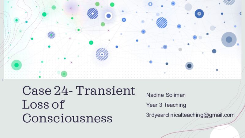 Case24-Transient Nadine Soliman Lossof Year 3 Teaching Consciousness 3rdyearclinicalteaching@gmail.comWhatwe’recoveringtoda y +History LOC (what to ask) +Differentials +Syncope +Seizures +Progress Questions +OSCE Tips + Forum PC/HPC Before During After • Situation • Video? • Do they remember falling • Post-ictal (LOC before/after) • Head injury? • Drowsy, • Pre-syncopal symptoms • How long were you out • Tired, • aura, for? • Chest pain/Palpitations, • Did your complexion • Forgetful, • exercise, change? • Groggy, • ringing ears, • Did you seize? • light head, • Was your whole body • Confused • flashing lights/static, shaking? • Aching through • emotional • Tongue bitten? your whole body • Pre-seizure symptoms after • Crying out, • Come back incontient? • Weird smells, • Weird memories, • Lip smacking Systems Review Cardiovascular Gastrointestinal (CVS): Neurological (NS): and Genitourinary Red flags: (GIT/GUM): • Chest pain, • Focal weakness, • Abdominal pain, • Recent infections, • SOB, • Loss of • Bowel or urinary • Palpitations, sensation, changes • Weight loss, • Cough • Balance • Night sweats, changes, • Fevers, • Visual or • Bleeding, Auditory • Dark stools. changesPMHx: has this ever happened before? Previous diagnosis of epilepsy? MHx: anti-hypertensives, levothyroxine? Etc. FHx: Epilepsy, sudden deaths, arrhythmias SHx: smoke, drink alcohol, illicit drugs, What’s life like at home? How’s work? Stress?Differentials +Syncope = LOC due to lack of cerebral blood supply Characteristics Premonitory During Afterwards Previous Ix Treatment symptoms hx Vasovagal • Provoking event • Flaccid fall • Lightheaded • No LOC ECG to rule None • Flashing • Loss of tone • Vomiting before out Syncope lights • ± moaning or • Brief • FHx of cardiogenic • Dehydration growling with hips confusion vasovagal • Emotional and knees • Well oriented Stress extended immediately • Dizzy • ± tonic clonic • Blurring of Vision movements but • Ringing in the not rhythmic ears • ± Tongue biting and incontinence • Lasts seconds Cardiogenic Collapse while Twitching of limbs Might not ± recent LOC ECG Treat exercising Lasts 1-2 mins recognize underlying Syncope people around cause e.g antiarrymthics /pacemakers Provoked: Prodrome: Vasovagal Pain, Dizzy, has clear pre- Position: syncopal Upright Dehydration, Blurring symptoms – Emotional vision, PPP shock Ringing ears Seizures Seizure = abnormal/excessive discharge of electricity to the brain causes a break in activity + takes time to recover Epilepsy Provoked seizures Non-epileptic attack disorder (NEAD) • Alcohol excess Tendency for repeated, • A lcohol withdrawal, Subconscious, involuntary unprovoked seizures jerking Cocaine/amphetamine • Other drugs (i.e tramadol) • Trauma ortumour Characteristics Premonitory During Afterwards Previous Ix Treatment symptoms hx Epileptic • Crying out • Altered awareness • Confusion At least 1 Bedside: Anti- Seizure before • Abnormal lasts 20- 30 other ECG epileptics falling sensations mins episode • May begin • Focal involuntary • Post-Ictal >24hrs Bloods: FBC, DVLA - not movements or with focal convulsions phase: Can prior U&Es, LFTs, allowed to features (widespread) last Glucose, drive (until (right/left • Signs: cyanosis, days/weeks Calcium 1yr seizure- arm tongue biting, ± free) movement) incontinence Imaging: • Lasts 2-3mins MRI/brain imaging NEAD Warning : • Twitching of limbs • Feeling LOC EEG for Psychiatry feeling of • May start jerking horrible before electrophysiolog 'bleeding while still • Strong y to rule out conscious physical cause inside their emotions head' afterHowto Generalized-onset seizures • Origin = both hemispheres classify • Awareness usually impaired, LOC Nonmotor onset seizures Motor onset ▪ Absence • Bilateral from ▪ ± minor motor activity the onset ▪ Defined by earliest prominent feature • Tonic-clonic/grand-mal – stiffening and rhythmic jerking • Clonic – sustained rhythmic jerking • Typical absence • Tonic– stiffening only • Atypical absence (less abrupt • Atonic- loss of tone onset/termination) • Myoclonic – rhythmic jerking not preceded by • Myoclonic stiffening • Eyelid myoclonia • Myloclonic-tonic-clonic – myoclonic jerking + tonic- clonic movement • Myoclonic-atonic – myoclonic jerking + atoniaFocalOnset Focal-onset seizures • Origin = one hemisphere, sometimes one subcortical structure Seizure • Discretely localized or widely distributed Level of awareness • Autonomic dysfunction – GI sensation, heat/cold, flushing, • Focal aware: simple Focal- sexual arousal, palpitations partial onset • Behavioral arrest – main feature nonmotor is cessation of movement and • Focal impaired- Focal-onset motor unresponsiveness awareness: complex • Cognitive dysfunction = partial if awareness is impaired in any part of impaired language or other the seizure cognitive domains, positive signs(déjà vu, hallucinations, illusions, perceptual distortions) • Automatisms – coordinated, purposeless, repetitive motor activity • Emotional dysfunction – emotional changes (anxiety, fear, • Atonic joy), affective signs w/out subject • Clonic –focal rhythmic jerking emotions • Epileptic spasm – focal flexion or extension of arms + flexion of trunk • Sensory dysfunction – • Hyperkinetic – pedaling or thrashing somatosensory, olfactory, visual, • Myoclonic – irregular, brief focal jerking auditory, gustatory, or vestibular sensations • Tonic – sustained focal stiffeningEpilepsyDiagnosis First steps Epilepsy • Call for help Management: • Note and keep track of time • Check for epilepsy ID/jewelry Steps • Protect from injury • Cushion head • Remove harmful objects • DO NOT restrain/put anything in their mouth <5 mins Next steps • Observe them u