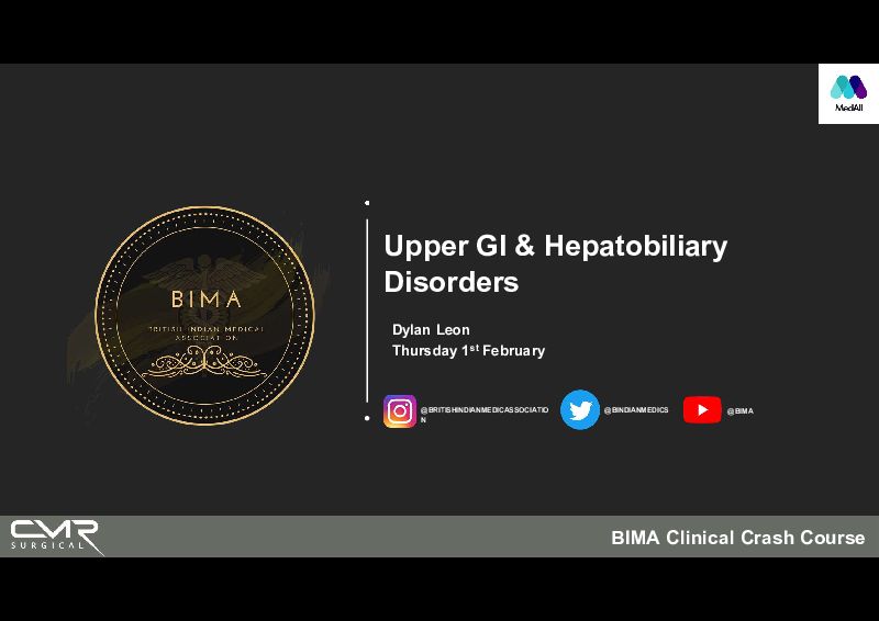 Upper GI & Hepatobiliary Disorders Dylan Leon Thursday 1 February @BRITISHINDIANMEDICASSOC@BINDIANMEDICS @BIMA N BIMA Clinical Crash CourseTOPICS TO BE COVERED • Hepatitis - Viraland Autoimmune • FattyLiverdisease: • Alcoholic liver disease • Non AlcoholicFatty liver disease • Liver Cirrhosis • LFT interpretation • Primary biliary cholangitis • Gilbert's syndromeCase1 A 45-year-old woman presents with insidiousonset of fatigue,malaise,lethargy,anorexia,nausea,abdominal discomfort, mildpruritus,andarthralgiainvolving the smalljoints. Her pastmedicalhistory includes coeliac disease.Physicalexaminationrevealshepatomegalyand spider angiomata.Case1 A 45-year-old woman presents with insidious onset of fatigue,malaise,lethargy,anorexia,nausea,abdominal discomfort, mildpruritus,andarthralgiainvolvingthe smalljoints. Her pastmedicalhistory includes coeliac disease.Physicalexaminationrevealshepatomegalyand spider angiomata.Autoimmune Hepatitis Definition: Chronicinflammatorydiseaseof the liverof unknownaetiology,whichif left untreatedoften leadsto cirrhosis,liverfailure,anddeath Epidemiology: F > M 3-4x Associations: Otherautoimmunediseases, Hypergammaglobulinaemia,HLAB8,DR3 Commonly: Thyroiditis, T1DM, Coeliac Disease, UC, RA, HaemolyticAnaemia, or ITP ClinicalFeatures • Maypresentwithsignsof chronicliverdisease • Acute hepatitis:fever, jaundice(~ 25%) • Amenorrhoea (common) Autoimmune Hepatitis Investigations Bloods Type I Type II Type III • ↑ serum ALTand AST activity ANA LKM1 Soluble liver- • ↑ serum IgG kidneyantigen • ↑ titres of circulatingautoantibodies (titres of >1:40) SMA • ANA/SMA/LKM1 antibodies Management: Liver Biopsy • Typicalfeature: Interface hepatitis(inflammation of Immunosuppression hepatocytes at thejunctionof the portal tract and • Steroids+/- hepatic parenchyma) • Azathioprine • 'piecemeal necrosis', bridgingnecrosis Liver Transplant Acute:symptomatic Hepatitis Chronic:> 6 months, asymptomatic AcuteHepatitis ChronicHepatitis • AcuteViralHepatitis • ChronicViral Hepatitis - HBV,HCV HAV,HBV,HCV,HDV,HEV,CMV, • AutoimmuneLiver Disease EBV - AI Hepatitis: ANA/ ASMA/ LKM • AutoimmuneLiverDisease - Primary Biliary Cholangitis: AMA - ANA/ ASMA/ LKM • MetabolicLiverDisease • Drug induced - Ferritin(Haemochromatosis) - Ceruloplasmin(Wilson’sDisease) - Paracetamol - α1 antitrypsindeficiency Non Specific Symptoms: RUQ pain, dark urine, jaundice,malaise, fever,headache, anorexia, N&V Viral Lab Results • ↑ ALT/AST/Bilirubin Hepatitis • ClottingDerangement • IgM (acute) or IgG (chronic) • Viral nucleicaciddetection (DNA/RNA) • AntigenDetection(HBV/HCV) Transmission ViralHepatitis • FoecalOral:HepA/E • BloodBorne:Hep B/C/D Hepatitis A • RNA picornavirus • Transmission: Foeco-Oral • Incubation Period = 2 – 4 weeks • Clinical Features: fever,anorexia, n/v/j, RUQ pain • Severitydependenton age • < 5 yrs:mostly asymptomatic • > 50yr: mortality rate 1.5% • Diagnosis: • Acute infection: HAV-IgM in serum by EIA • Chronic infection: HAV-IgG in serum by EIA • Treatment:UsuallySelf Limiting. Maintain hydration, avoid alcohol • Asymptomatic in children < 5 • Mortality 1.5% if age > 50 • No Chronic Hepatitis/ No predisposition toHCC • Vaccine Hepatitis B • DNAVirus • Common • VaccinePreventable • Transmission:Transfusion, Fluids (Blood/Semen), Organs/Tissue transplantation, Vertical transmission, Contaminated needles/syringes • Incubation: 6 – 20 weeks • Features: fever,jaundice, elevated transaminases • Age determines severity &risk ofchronicHBV • Birth/youngchild: asymptomatic+ chronic infection • Adult:symptomatic but clear • 25%develop chronicHBVwhichcarryariskof • Cirrhosis • Decompensationwithascites • HepatocellularCarcinoma(HCC) Hepatitis B HBV isdiagnosed if sAg andDNA are detectable Treatment • Acute: None Markerofinfection • Chronic:only if there is evidence of liver inflammation or fibrosis Suggestshighinfectivity • SuppressViral Replication + Prevent further damage • Pegylated Interferon-alpha cAb– marker of current/prev infection • Tenofovir + Entecavir Measure treatment response Prevention • Education • Vaccination • Preventionof Motherto Child TransmissionHepatitis B Hepatitis C • RNAFlavivirus, affects 170million people worldwide • Transmission: IVDU, Blood Transfusion/Transplant,Sexual/Vertical Transmission, Needle stick • Novaccine, no immunity, no protective antibody response identified • Incubation period: ~ 6 – 7 weeks • High rate ofprogression chronicdisease (70%), eventual cirrhosis(25%) &HCC (1 – 5%) • Rate of progression related to: Male, age > 40, alcohol > 50g/week • Clinical features: mostly asymptomatic, only 30% pt will develop jaundice, transient rise in serumaminotransferases, fatigue, arthralgia • Investigations • HCV RNA(PCR) orAntigen positive: currentinfection • Anti HCVIgG positive: chronicinfection/ cleared infection • Aim oftreatment: Treatinfection • Direct Acting Antiviral (DAA)for8 –12 weeks, depending onthe viral genotype • Cure rates of > 95%Hepatitis D • ssRNA virus • Transmittedparentally-entersvia • Superinfection of chronic HBVcarriers skin/mucosa/bloodstream liver • UsuallydevelopchronicHDV infection • Defective virus: Replicates onlyin • High riskof severechronic liver disease, presenceof HBV fulminant hepatitis, andcirrhosis • Maypresentasan acute hepatitis • Co-infection withHBV • Severeacute disese • Low riskof chronic infection • Treatment: Interferon HepatitisE • Virus replicates in GI tract --> blood streamliver • RNA Virus • Clinical course : 2-4 weeks • Mostinfections are • Transmission:Faeco-oral, Undercooked meat(pork), asymptomatic/mild associated withlarge water-borne outbreaks • Infectionclearedcompletely • No chronic infection, no carrier • Incubation = 3 – 8 weeks • Treatment: Supportive (Maintain hydration, IV fl