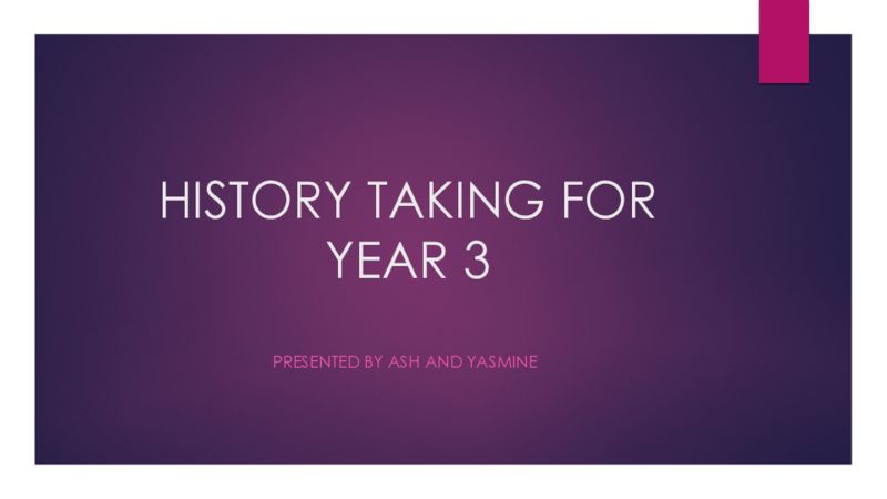 HISTORY TAKING FOR YEAR 3 PRESENTED BY ASH AND YASMINEWhat will we cover? 1. History taking BASIC structure 2. ICE 3. SOCRATES 4. Roleplay ;) 5. Top tips for history taking 6. QuestionsHistory Taking Basic Structure: Introduction 1. #hellomynameis 2. Confirm patient identity 3. “what would like to be called?” 4. Gain consent of history taking 5. Ask if they need or want a chaperone 6. Clean hands (this is mainly for OSCEs)History Taking Basic Structure 1. PRESENTING COMPLAINT 2. History of presenting complaint – SOCRATES and ICE (next slides) 3. RED FLAG SYMPTOMS? (not red flags that give you the ick lol) 4. PMH 5. Drug history 6. Family history 7. Social historySOCRATES What does SOCRATES stand for? S – site O – onset C – character R – radiation A – associated symptoms T – timeline E – exacerbating factors/relieving factors S – severity (out of 10) – 10 being the worst pain imaginableICE IF YOU DO NOT ICE, YOU WILL FAIL YOUR OSCE STATION!!!!! What is ICE? Ideas, concerns, and expectationsHow would YOU phrase ICE to a patient? You will now be put into breakout rooms where one of you will be asked to take a history from one of us. This will take 10 minutes. Roleplay ;) Don’t worry, this is a great chance to practise and gain feedback. You will be doing this all the time in third year and onwards!Top Tips for History Taking 1. BE CONFIDENT – FAKE IT ‘TIL YOU MAKE IT 2. SMILE! Politeness goes a long way and it makes the patient feel at ease with you 3. Show interest in the patient’s life – they’re not just for machines that churn out histories 4. Make sure to ask open and closed questions 5. EMPATHY!!! This shows that you actually care about what they are saying 6. Watch your body language (even on Zoom) 7. Take as many opportunities to present or practise taking histories on the ward – this is literally OSCE/CCA practice!Any questions about third year in general or history taking?Thank you for coming JJJ