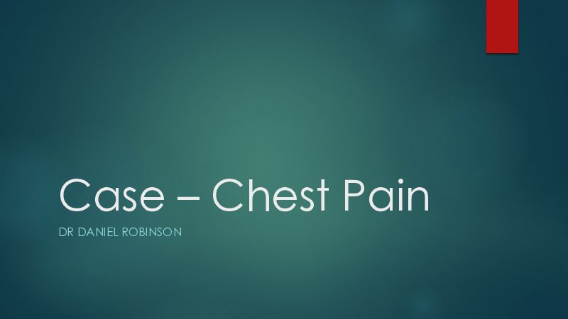 Case – Chest Pain DR DANIEL ROBINSONObjectives u To discuss the wide list of differentials that can fall under the wide umbrella of “chest pain” u To approach these patients in a systematic and safe way u To manage these patients with appropriate interventionsThe Patient u Mr N.E. One, a 53 year old chap coming in with chest pain and shortness of breath u From the end of the bed he looks dyspnoeic, but comfortable u What could be going on? u What do you want to know from the patient?Examination u Talk me through the exam u What are you looking for and why – how does this change your thinking?What do we think is going on?Investigations u What investigations can we do for chest pain u What are we looking for u If you get stuck think about Blind Surgeons Retiring Early u Also think practicallyBloods u FBC - WCC 3.32, Hb 143, Plt 201, MCV 80.7, Neuts 2.79 u CRP 156, Trop 40, D-Dimer 2.68 u U+E - Na 130, K 4.5, Ur 6.8, Cr 89, eGFR 77 u LFTs - BR 23, ALP 58, GGT 21, Prot 59, Alb 40Any new Differential Diagnoses?OK… What next? u What is your plan from here? u What we did and whyPoints for Reflection u Wide differential for Chest pain u CXR is a vital investigation u Not only to rule in, but to rule out u Urgent escalation upwards is key u Develop basic skills in interpretationObjectives u To discuss the wide list of differentials that can fall under the wide umbrella of “chest pain” u To approach these patients in a systematic and safe way u To manage these patients with appropriate interventions THANK YOU FEEDBACK LINK