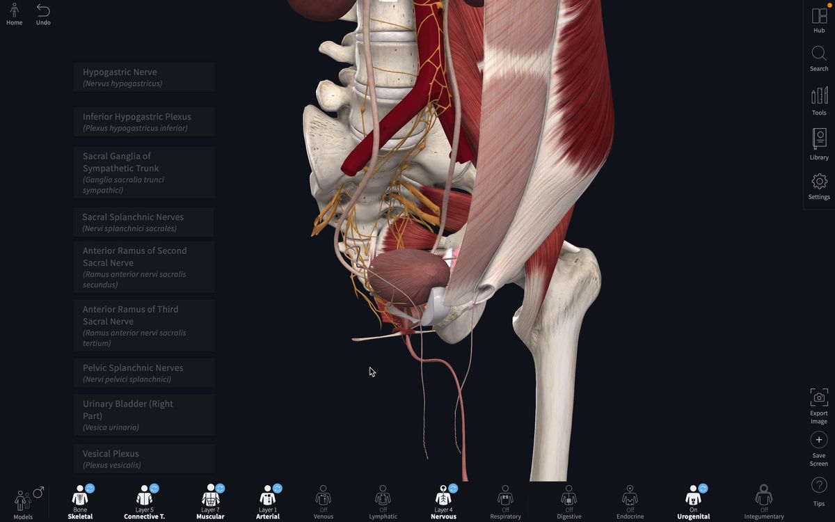 back to another video a lot clearer here. It has the same control in both genders, and it's skeletal muscle, and it's under a voluntary control. Um, yeah. So the vasculature off the bladder if we go on to another model here, so we'll start with the arterial supply. Okay, so the arterial supply is by the superior of these visible branch off the internal iliac artery. So this is the internal iliac artery, and as you follow it through, you can see that this supplies the bladder and in terms of the venous drainage again, we'll have to switch. So venous drainage is via the vehicle. Venous plexus, which is located here on this, drains into the internal iliac veins. So once again, if you follow the
