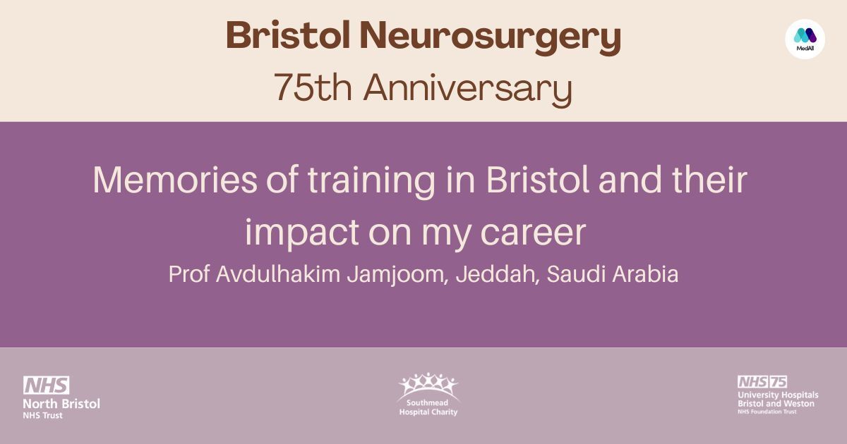 And we now have prof Jamjoon who's come from Saudi Arabia and I'm sorry, I'm going to have to rush you as well. Thank you. I would like to thank the organizers for inviting me such a great honor and pleasure to take part of this wonderful occasion. I didn't sign up to be followed by uh to follow uh the excellent presentation by improper. This is extremely unfair. Uh First, like please, I worked as a necessary show uh in Bristol for six months long time ago. In 1980 for 18 85. I returned back in 93.5 years later to do the two years. So next likely to do the uh two year registrar job. And from 1990 onward, I've been practicing in Saudi Arabia initially in Riyadh and then uh in the last 20 years. And so in Jeddah, next time, please. So my memories of my time, as I said, show, I was a young guy uh placed on war two friendship Hospital, um sister in charge Ellie Jackson. I'm glad she's here to see her here. She was extremely kind to me. She never complained about me. That's meant I was okay. Um The highlight of the week was the Wednesday uh morning grand round. Um Hugh Griffith always had something intelligent to say, Brian Cummins always had something funny to say. The whole round was a combination of good experience and good fun. A memorable case would be uh an elderly lady with a primary leptomeningeal uh hematosis presented with papilledema. Uh she was diagnosed with a brain CT myelogram, open biopsy One level laminectomy done by Griffith. No MRI because there was no MRI in friendship. In 1984 I think it came in 1985. The patient died 222 months later, I arranged with the relatives, the GP the ambulance service for the body to be transferred to French for an autopsy which was done. And I remember the case because for a while I was known amongst my colleagues as the guy you talk to. If you want a body transferred. Next slide, please. My memory is as a, as a registrar, I had already done two years in Wales when I came. So it was uh good experience. I was exposed to uh huge operative load and uh increased. My operative experience was exponential. Also I passed the uh Fressn uh in September 1989. That was a time when the test was done by the Edinburgh College before it became intercollegiate. At the time, eight candidates took the exam. Three past two of them were Bristol trainees and that's a reflection of the quality of training in Bristol. The highlight of this period of course would be doing the stepping up to do Mike Torrance's locum consultant for three months. Uh That was a wonderful experience. Um uh It boosted my confidence tremendously and, and prepared me for being a consultancy in Saudi Arabia, being a locum consultant at French at age 31 was a high point in my career that I was grateful to have uh to get the opportunity. I don't remember any disasters, but it could be that memory is selective. Um Also the period coincided with an increase in my academic productivity of the projects I was involved with. I ultimately uh in the two year period, ultimately published 30 papers. Some of them were actually published 34 years after leaving French, eh and uh the help in my promotion from assistant to associate professor in Riyadh. Next flight please. My link to Bristol was revived through my son Nayman who was born in South Meat when I was a necessary show in Bristol in 1985. And after completing his training in Scotland, he returned to uh Bristol to do a year of Neuro Oncology Fellowship, which is about to complete. Also during the nineties, three of our colleagues from Riyadh, uh more shit. Sherrif YTD Osama Jamel, they all came to French ended two years of training, they all did very well afterwards became consultants and full professors in Riyadh. Again, reflection of the quality of training I should also add uh Mr Amber Mohammed. He I just met him just now. He also was registrar was with this in Riyadh. And ultimately the training in friendship. Now he's a consultant in Cardiff next side, please. So next year, so that one before, sorry, long before. So my time and and Bristol is remembered by the uh painting of the suspension bridge, which was actually the uh leaving gift that was given to me uh from the French had Staph in 1990 which is still hanging on a wall in my house in Jedda. It moved with me a couple of times in the last 30 years. Next, please. Um This uh this photo was taken in towards the end of 1989. Uh when Thaddeus Mooney right there in the middle, his who sponsored trainee, he was leaving to uh to go back home to Ethiopia and as part of Aids to Africa, the consultants, all of them, the lead by Hugh Griffith and also some contribution from National Rawlinson who was registered at the time, arranged with the surgical equipment, companies to donate full sets of basic neurosurgical instruments and to ship them all the way to Ethiopia. And that was something so nice. And no, that was the spirit of Bristol neurosurgery at the time. Next side, please. I think this is another group photo from early 1989. I think it's already posted outside, but I'm sitting there in the front and on my left, Richard Ash Ball. Uh next slide, please. And this is the last, next one, please. This is the last group photo from summer of 2019 90. Uh When after Rick Nelson joined. Uh next please, I just have a couple of sides about neurosurgery in Saudi Arabia. So when I joined in 1990 there were 40 new research in Saudi Arabia. Four of them were Saudis. Uh And last year, we had 238 and just that half of them are Saudis. So during this period, population has increased from 16 million to 34 million population. So despite having our own training program in 1995 and despite producing as uh full capacity of trainees, the country is still reliant on, on neurosurgeons coming from abroad and also on training opportunities abroad. I think as British trainees, we, we always hate to say this, but one of the good things that happened two medicine in Saudi Arabia is what we call the Canadian connection. And that ov