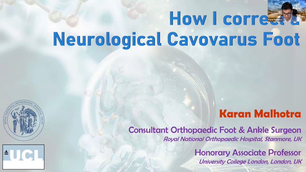 Hello, everyone. Um Tonight's um program has been slightly changed uh due to some last minute issues, but we are still going to have a fantastic cracking session. So the plan is the session tonight is on cable virus foot. I will start the session by sharing a couple of cases uh which have CAVO virus element and hopefully by the time I finish those case based discussions, um our, our, our guest speaker tonight, Karan Malura from Stanmore, um who has a wealth of experience will, will join us and then he'll uh give his perspect perspective on vis foot and time permitting. We'll get one of our fellows to share a cracking case on Cavo virus. Ok. So hopefully it will all work out well. So let me start with my case number one. Can you see me and uh everything clear? Yes. Yeah, clear. Excellent. So, ok, this one, this one is a 52 year old male uh who has no medical issues uh and presented to me uh with these radiographs. Now, can I ask one of you to tell me or show me what are the radiological parameters which are important? What, what do we see are the x-rays normal. If not, then what can we see what is abnormal, any one of you? Well, if you want? Well, I see. Uh yes. Uh Well, first of all, in the AP view, you can uh see that. Um, well, you have to, to see the, the line with the, the tibiofibular joint, you have to see that I, if it's parallel, the joint is parallel, also you have to check how it's rotated or not rotated the fibula in respect to the talus and the tibia. And the gentle line there, I can see some kind of rotation but well, the the joint is parallel also, then I see the, the foot, it is a bit displaced but the talus is fine and then it, and I can see also that it's uh well, no, it can be, you know, it's OK. And then in the, in the lateral view, I see you have to see if you see the syta, see, you see uh the c the fifth, the right that in this case, we are, we are we you can watch it. Also, the fibrillar is a bit posterior kind of posterior. And well, if you if you from a lateral size from a lateral view, sorry, you, you can see the, the fifth, the fourth metatarsal uh probably that, that, that uh foot is in, in virus. No is super, so absolutely supinated. So yeah, so lateral view uh II agree Um we, we, we have issues on both s both ap and lateral but lateral is quite typical of uh chemo virus foot. And the radiological parameters are we see these toes, we can see the clawing of the toes. Yeah. Yeah. Then we see the Mary's angle, the talar first metatarsal angle that's altered, that's not in a straight line. Uh um Then we see some hypertrophy of the fifth metatarsal and in cava virus foot that you know, it's a subtle finding because they are putting a lot of pressure on the outer border of the foot uh due to supination. And one thing which I always find which you see is if you see nice opening of the uh secular joint, then it's indicative of virus whereas valgus you see overlap. OK. Uh The other thing which has also been described is the talar calcaneal angle in both the AP and the lateral views. So, in, in a virus case, because of the uh talar declination, uh the Halo Calcaneal angle is lowered is less. Um This patient also has uh narrowing of the anti ankle joint space, which means there is some arthritis and osteophyte. Ok. So, these are the radiological changes which we see on the x-rays. Um This is the MRI scan and the MRI scan again demonstrates to what I was alluding to earlier that he has some arthritis of the ankle. You see here, you see there, that is what is happening with this guy. So 52 years old, he does not have any spinal problem. No neurological problem. Uh no sensory deficit, not diabetic presents to us with a chemo virus for deformity with some arthritis of the ankle joint. How should we treat him? And they can be lots of options. Not one is the right answer. There can be, you know, whatever, I'll show you what I did, but I want to prick your brain as to how you would like to treat and each of you might have an individual strategy. So we start, you have to be quick because we don't have much time. We have to share two cases. So you have to be quick to the point. How would you treat it? Mohammed? Well, here when the first uh management is conservatory, conservatory with orthotics is uh fails, then it will be surgi surgical. And in, in this case, is it flexible? I mean, you have to check if it's flexible or not, you can go through osteotomies if it's flexible. I don't know, was it flexible? So I asked you, Pilar, I put the question back to you. So what do you think in a 52 year old man if you or, or woman, if you see these deformities with some established arthritis, what are the chances of it being flexible or fixed? What do you think it will likely to be? Well, it can be a bit rigid. II think the chances are it was rigid. So, at, at that age, with some degree of arthritis with such a long history. So I should have told you it's been there for some time. Yeah. It's a rigid deformity. Not, not completely correctable. Yeah. So then when I was saying in the ap view, if the, uh, joint was, uh, parallel, uh, it was parallel, so I will start, um, uh, operating in the foot and, I mean, I wouldn't do anything uh above. No. So I will operate on the foot. And then uh I don't know here in the, when basically I will start in the heme foot. Uh I don't know if you perform a, a Subtalar arthrodesis versus a doer osteotomy if you are saying that it was rigid and the subtalar was a bit as probably you choose for uh for an uh arthrodesis. And then uh probably I saw that um those II didn't see one in the Sagittal plane. This one was, was a bit um uh Plantar flex. So probably if you want to, to correct more, see there, maybe you can do um osteotomy to elevate the, the, the M one, the, the, the, the first metatarsal. Brilliant. OK. In, in sake of time. Yes. Anything else? No. And it depends, I mean, about what you were saying of the disc, close to, close to toes and all that. II, II do