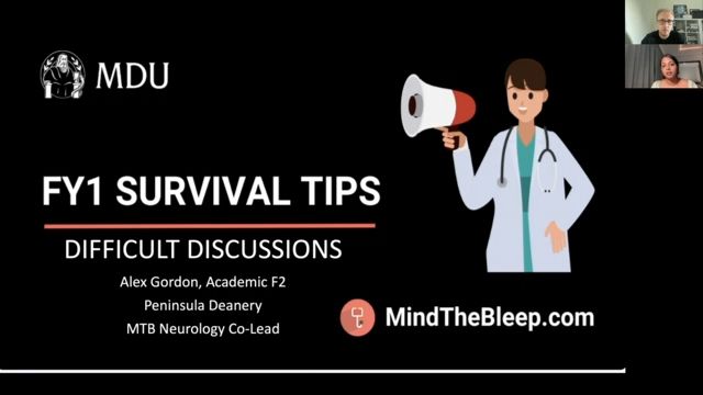 Hello, everyone. Um, my name is Ruth. I am one of the co-lead for the fo one branch of mind, the believe. And thank you everyone for joining us so far. I know as the webinar goes on, you'll be having more viewers. Um, but currently today's webinar is being, um, will be presented by, um, Alex and who will be discussing who's actually the neurology, co-lead of mind, the bleep. And today's topic of discussion is difficult discussions. So here we're looking at some communication, tips and tricks that will be very useful to your fy one. So over to you Alex and thank you very much for taking your time to present today. Brilliant. Uh, yeah, thanks very much. Um, so, hello everyone. Uh, thanks, thanks very much for giving up your, er, Thursday evenings to come and listen to me. Hopefully you can pick up a few, um, hot tips on what is a fairly, er, important bit of the job. So let's crack on with it. Um, so what we're going to cover today is, um, breaking bad news situations of self discharge, dealing with angry, angry patients and angry relatives and then a little bit as well on managing complaints. Um, so first thing we're going to do is, um, if this works is so there is a uh system called men that if people have their phones available or you can go to it online, um, if you can keep the app open, um, there's a QR code here. Hopefully this is working is, um, go to mental. I just want to see what everyone's sort of perceptions are of, um, their confidence in these sort of domains. So if you could log in that would be fabulous. There we go. It's working. This is, uh, good. We've had one response, three responses. That's very good. Yeah. So I will give it about a minute. We've also got the average I'm presuming since we're all at a webinar on, um, difficult combs that I would assume that if you felt like you knew everything you probably wouldn't be here. Um, we'll use this throughout as well. So just keep the tab open. Yeah, those you have just joined. If you go to me dot com, just wanna have a look and we'll do the same thing at the end and hopefully it'll have gone up or stayed the same if it's gone down this whole sessions gone really wrong. Ok. I'm gonna give it 20 more seconds. I think 25% of people putting it in is generally pretty, pretty good. Ok? If you can't log in, don't worry, just have to think about it, but it's just helpful for me to know where everyone's at. Ok. Right. So I can just about see that there's a, sort of people are sort of at best just under 50% of the way there with the sort of confidence on breaking bad news. It's pretty, pretty well taught at med school and hopefully I, I've tried to be a bit more pragmatic with it than just deliver standard stuff. Self diss again, it's sort of, it's one of these big scary things, but actually it's if you, there's a pragmatic way of dealing with it and we'll talk about that as well and then dealing with angry patients and relatives, I will go into it and then managing complaints. I will talk about this sort of process that you can go through. But I've mainly put in a link to another video that was done by the MD U for mine, the bleep who are very much more in the right position to talk about it than me. Um So firstly, what I can and can't do today is the irony of delivering a talk on communication via a one way webinar where I can't see any of you or actually engage with anyone is not lost on me. But what I can hopefully do is provide a starting point or approach to common but difficult scenarios, give you some practical tips from two years of experience on the foundation program and a basic overview of what to do based on real life scenarios that I've experienced that have been changed slightly just to preserve anonymity. Obviously, through this, I can't improve your communication skills. And I'm not going to be able to provide comprehensive medical legal or local systems advice for your hospital on what's going to happen for complaints. But I will sign post you to a really good webinar that was done by M the bleep on the same topic that goes into a bit more depth on the ins and outs of the NHS complaints process from a medica legal point of view. So I think it just going off that how, how to actually work on your communication. I think this webinar basically serves as a sort of a, a springboard really for processes for how to communicate in these scenarios. But the way to actually improve your communication is is to do it and it's a skill like everything else. You just have to learn it in different ways to say biochemistry or physiology um or practical skills like cannulation. The, the, the thing that I would recommend you do straight straight from the off in your f one job is try and observe seniors having challenging discussions um with patients, you're looking after um be proactive and speaking to relatives after ward drowns just um as I said, it's a skill like everything else. So the more practice you get and um the more you proactively engage with people the better you're likely to be in this domain. And then also a key for communicating as a doctor is obviously being knowledgeable and understanding the conditions and prognoses that you're looking at. And so just read around the cases that you see on the war and if you do that, you'll very quickly pick up what to do. So let's start, let's start with breaking bad news. So it was, it was the domain that most people felt confident ish in. It was an average of sort of 2.6 when it's taught in medical schools and then certainly in the UK perspective, it's very often taught in decontextualize. So you're not on the wards, you're not, um you're not having to deal with multiple other jobs. You're just sort of sent into a session with an actor and you can stop and start and the actor will tell you how they feel afterwards. Um And you maybe get one or two hours of that at medical school. Um Certainly I went to a ra communication, heavy medical school. Um And that's, we sort of did get quit