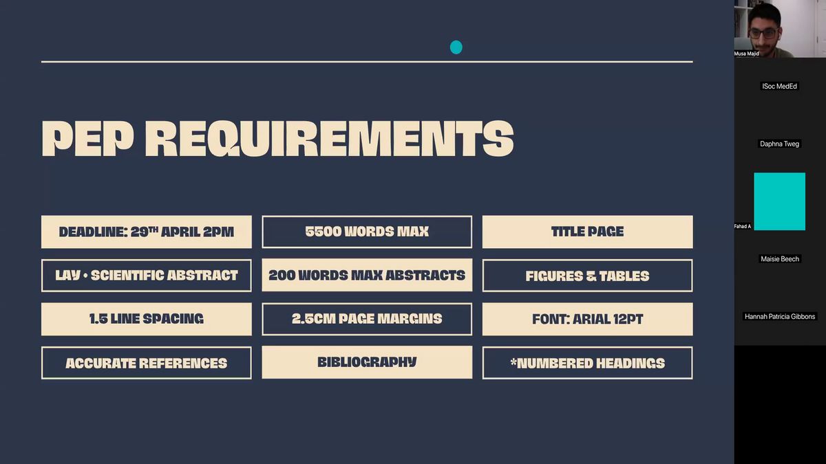 Oh yeah. So the main requirement. So you guys will probably all know this already. Your p is due, the essay is due at the 29th of April at 2 p.m. If you've got a da plan, it's a week later. Um 5500 words max. So the uni ideally want you to write about 5000 words, you can go up to 5000, 500 anything above that, you get a 10% penalty and you don't want, you ideally want to be as close to 5000 as you can. You don't want to be sort of below 4900. Um You need a title page that just basically says your name, your essay title and your tutor and the word count, you need to have a, a and scientific abstract and they both have to be 200 words maximum, unlike in year one, but it was 300 words and you had a bit of leeway. This is 200 words of maximum, ideally sort of between the 100 and 60 to 100 and 70 mark and then figures and tables. You need to have at least one figure or table, it doesn't matter the, the more the better. But to pass if you don't have one, they can fail you for it. I've seen people fail for just not including a table which is crazy. Um, but it's a very simple thing to add and then there's these three, the, the lines f on your page margins on the front, just basic things. Um And if you don't do them correctly, you can do it on. I think just doing those three properly gets you about 10 20%. So why not? Um And I can walk you through how to do that on word properly as well, referencing, making sure you have references that actually link to the proper pages, that makes sense of what you're doing and they're in the right format and then a bibliography, which if you use a reference manager does it automatically for you and then numbered headings. Now, this isn't a proper requirement. You can have your headings in an order um of however you want, but having them numbered to the university likes to see that a bit more and it boosts you up into the sort of higher excellent categories. But those are the very basic requirements. If you have all of that, you, you'll be in a good sort of standing point. Um So moving on forward and sorry, I forgot to mention before. If anyone's got any questions, I'll try and keep my eye on the Zoom Chat. Um But just let me know or you can uh message these Chinese people to let me know hopefully. Um So moving on to the outline. So the very first thing I remember to anyone starting off their pet is get your title. So this is my title. This is an example. Um and either by yourself or what, you know that topic already or if you know nothing on that topic already, you can go into chat GBT or whatever A I you want to use and just put it in and ask it to make you a very basic outline of what you'd need to cover for an essay with 5000 words. Um, you're completely out that by university, university, sort of let you use A I to help you grammar, correct. Um, you know, help you plan things, it's just generating the content they don't like, but generally just get that. And so you can get a very good idea of what your essay will be about because some people, you'll get an essay title that, you know, loads about and you can plan it out nicely. But some people get quite unlucky. You get a title, um, that you've got no idea about. You might have done a bit of research and if your tutors hold you a bit, but generally do that and once you've got sort of a rough outline, then you can start going into your researching. Um, and so what you can do is this is a very basic outline, but you can sort of get it to do a word count, breakout. Um So if you tell, tell t that you've got a 5000 word essay and sort of give me a rough word count for each section. So, so you've got an even split and then once you've done that you can start Googling and researching, which you go on to the next slide a bit more about what to go into. Um And yeah, a lot of people when starting off with the pe you know, you've got your abstract, which I'd recommend doing at the end of your essay because it's a nice summary. So once you've done all the content, you'll know, but start off with a section that you're most confident on just so you can get past that initial starting off hurdle because you think, oh, I've got a month, I've got plenty of time. Then you've got two weeks, then you've got one week and you're sort of cramming. So if you start, if you just start a bit more, 203 100 words in a section that you know, a lot about makes that a little bit easier um to then start off and go ahead with your essay. Yeah, definitely, definitely start off with an outline. Some people like to do it after they've done the research, I say just start off, get a rough outline in place and then you can, it makes your research a bit more, uh, guided and then moving on. Um, oops, sorry, it's gonna, had two, um, researching. So, very, some people put, you're researching, you can just start off by Googling and you can get a few sites through that. But the four best sites that I found and what I, and a lot of other people in my year used were Google Scholar, which I'm hoping a lot of you already know about elicit this site right here. This site is very, very good. So they just released it when we started our pe and it's basically an uh an A I site that you put in a question or sort of a specific uh paper that you found and you wanna find similar papers to it and it will find you as many as you can and you can specify sort of, what side do you want it? If you want it from PUBBED, if you want it from like a science director or if you want it from a general Google search that help me find a lot of the content and it, to give you a little summary as well. So you can instantly see um what if that paper is relevant to you? These sites do the same thing um elicits um Some of them are free, some of them have paid trials and things used to be free for. They've got a bit of a limit. Um But yeah, definitely, definitely recommend so start off by just putting a title in and getting as many papers from there. And then once you've got the papers f