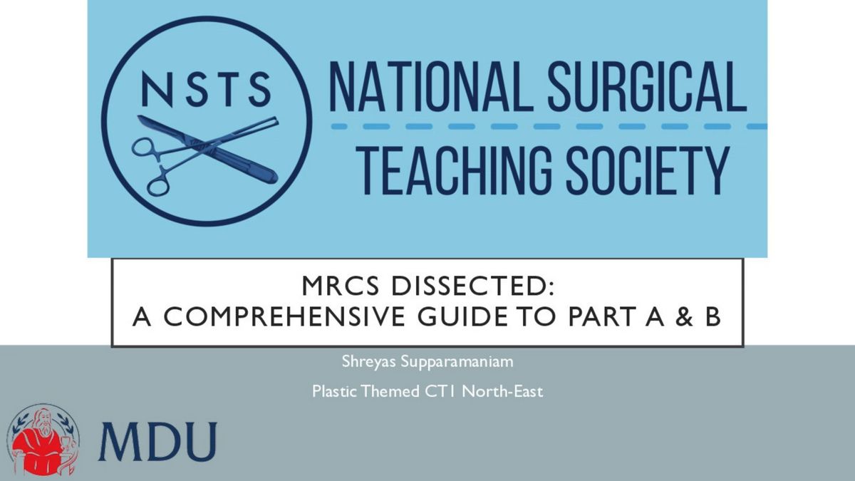 Hi, good evening everyone. Um Before I start, can I just get a couple of thumbs up just to make sure that everyone can hear me? All right, it popping on the chat? Yes. No, a one. Perfect. Thank you very much. So, welcome to the NST S MRC S Dissected Series. Uh I'm S, I'm one of the uh CT one co trainees currently based in the Northeast. Uh and, and I'm Plastic Esteed. So, the webinar series that we have organized is purely to focus on part A and part B exams. And thank you so much for joining us today uh for our first session. So what we'll be trying to aim to cover this evening is to focus on a couple of uh broad aspects of both parts of the exam. So for part A, you know, I'm just giving an insight and overview of how the exam uh examination is structured. Uh breakdown of the formats, a couple of high yield topics and revision strategies that I use for the exam. And same thing for part B sort of giving you an overview of the format, the types of stations that you might come across um and also a couple of, you know, recommended textbooks from the Royal College as well as a couple of uh colleagues that have already for the exam. And between these two sort of, you know, trying how uh we manage to balance clinical duties exam prep and towards the end, uh we can also have a bit of AQ and a uh that's a really good question, Khan. Um Jen, do you mind just recording as well? Uh Anyone in the chat who's not comfortable with recording with us, uh, recording this, just let us know and we'll try to sort of, uh, you know, act accordingly. So s before we sort of crack on, I just wanna get an insight as to, you know, the, um, the majority of you, which, uh which stage of training you're in. Are you a really enthusiastic medical student that's coming in just to get an idea as to how the MRC S exams are or if you are sort of, you know, uh foundation post CT. So thank you so much for your responses. Uh So, yeah, majority of your, uh, foundation training, uh which is perfect because that's when I decided to sit for the, uh part A as well. But nonetheless, everyone else, it's really good to sort of, you know, gain an idea as to how other people pass the exam. How do people normally tend to sort of revise and there's so many other resources out there and sometimes it can be slightly overwhelming. So what I decided to do is just try to, you know, cram it all in this one hour lecture. So I hope you find it useful. So, next question uh in terms of the uh journey itself, um I just wanna get an idea as to if you sat for part A already. Uh are you sitting for part B uh or you've not sat for any of them as of yet? So, so yeah, majority of you uh have not sat for part A. So that's perfect. Um Most of the talk is gonna be focused on part A with a bit of part B towards the end as well. So, excellent. So what's MRC S uh membership of the Royal College of Surgeons? Uh It's an examination to assess whether, you know, we have the knowledge, skills, claim of confidence and experience expected towards the end of course surgical training. Although it says at the end of course, surgical training, that doesn't mean you can't start early, which is, you know, uh a perfect time. Uh you know, now is the best time to sit for any exam. Uh as one of my consultants always says, so the exam MRC S in whole is split into two parts. You've got part A which is the theoretical aspect, which is your, you know, MC Qs and part B is the Os Ky similar to how we sit for our medical school. Exam where, you know, for one week you've got a couple of uh theory, theoretical papers and then the next week you've got your OS Cy uh so similar uh in that vein, to be honest. So this is uh really uh useful you can attempt as soon as you graduate from medical school for MRC S. And that's different to M RCP where you need at least one year of clinical experience. So that's something to keep in mind. But nonetheless, you can only attempt part B after you've passed part A. So it's a linear progression. Um So recommendation, um something that I did was I sat for part A during my foundation training. And right now in CST, I'm sitting for my part B exam. Um Again, a lot of people uh would suggest other um you know, some people say foundation is better. Some people say C SDI think in the end, it really, what really matters is finding a time where you are most comfortable and you have the most uh leeway to sort of dictate your time uh for revision. So there are four Royal Colleges of surgeons. Um So when I first, you know, decided to sit for Mr CSI, didn't know which college to you sit with, you know, whether one was better than the other. Um I couldn't really find any resources on, you know, uh on most of that. But in the end, it doesn't really matter which college you sit for, um, the whole idea of the four colleges is just for geo geographical sort of, uh, purposes if you are, you know, around Scotland or north of England, uh, it's easier to sit for Ed Edinburgh, Glasgow if you're more down south, you know, England and of course, Ireland on its own. So, the most important thing is it's an intercollegiate exam where any sort of with whi whichever college is set for the exam is gonna stay the same. So it doesn't really matter uh in terms of the uh content of the exam itself. So coming to the specialties um that require MRC S, uh there's a fair few uh as you can see on the board, I think a couple of things, a couple of caveats to this is the Ent uh MRC S exam uh previously used to be DAS part A and part B. Whereas now, recently it's become MRC S part A and DAS part B. So the part B for Ent is a separate exam uh which obviously has, you know, different requirements, more specialized in ent um speciality itself for emergency medicine. This is not something I realized until I was putting up this uh this lecture where for, if you're applying for emergency medicine, sitting for the MRC S gives you a couple of points. Uh But it's, I think one point compared to you actuall