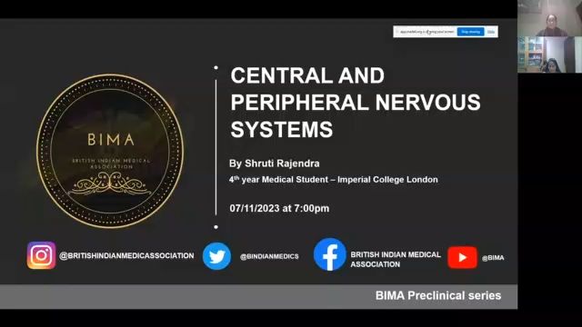 Hi, everyone. I hope that you can see us and hear us all good now, sorry about the delay earlier, but we're now up and running and ready to go. Um Thank you for joining today's lecture. Um We'll be talking about central and peripheral nervous systems and today's lecture will be given by should be, so I will hand over to you now. Should be um take it away. Sure, thank you. Um Hi guys, I'm tr I'm currently indicating um in Imperial. So I'm 1/4 year medical student and I'm doing my cardiology PSE. So um I'm gonna be running your lecture today, sorry about the delay earlier. Um So before we start, obviously, today is gonna be quite interactive. So please do get your answers into the chat. Um So that we can kind of keep going forward. We're gonna do questions as we go along. So hopefully you should feel a bit more confident about um picking up um what we're learning as we go along and I have got most of the information all in the slides um or in the notes which will be released to you afterwards. And I've also got a summary table. So um you don't need to spend too much time, sort of taking notes and things like that. Um Cool. So let's get started. So, as I said, this is just a little bit by me. If you've got any other questions like specifically um you know, about imperial or anything like that, um um or like BSE options and things like that, then you can ask me later on as well and that's fine. So um the topics that we're going to cover today, firstly, obviously central nervous system and then peripheral nervous system. And at the end, we're going to focus on some SBA questions. So to begin with um kind of the central nervous system. Um but these are the topics we're going to cover. So this is gonna make up the bulk of our lecture and then towards the end, we will move on to the peripheral nervous system. So to begin with, let's start off with the divisions of the nervous system. So this is some basic recap for you. So the nervous system, we can divide that into um the central nervous system and the peripheral nervous system. So the central nervous system consists of the brain and spinal cord, um and the peripheral nervous system consists of our cranial nerves and our spinal cord nerves. So that comes under the nerves group and then we have Gamia as well. Um And these are found outside of the brain and spinal cord So um that's just a quick introduction. Let's move on to the brain now. So if we have a look here, these are the main parts of the brain. So we've got the cerebral hemisphere up here. Let me just grab my um pointer. So we've got the cerebral hemispheres up here which are divided into our lobes, which we'll come on to in a moment. Er, we've got our midbrain pons and Medlar which together makes up the brain stem and then that continues down to form the spinal cord at the back here, we have the cerebellum and then we've got a structure here which is the thalamus and the hypothalamus here together, they can be called aci diencephalon. So it just means the thalamus and hypothalamus put together. So the brain, we can divide into the forebrain, midbrain and hindbrain. Um And each part consists of various subparts. So the forebrain consists of our cerebral hemispheres and the diencephalon. So remember the diencephalon is what is um the thalamus and the hypothalamus put together and then in the hindbrain, we have the pons medulla cerebellum. Um So you might remember from the diagram here. So, Pons Medullar and then the cerebellum put together um gives us the hindbrain. So there's different ways of classifying different parts of the brain. So, moving on um we have our different lobes of the brain. Um Do we wanna get some ideas in the chart? So which what is the blue part, green part, yellow part and the pink part. Could we put some ideas in the chat? Think about the position of the cerebellum. Um I can't see the chat, please. So showing me, would you be able to help with that, please? Nothing's come through. Oh, we've got blue being occipital. Ok. That's the only response so far. Ok. No worries. Ok, we'll go through this uh together in that case. So, um this big blue bit here, that's the front of the brain. So let's orientate ourselves. So this is the front part and this is the back because we've got the cerebellum here at the bottom. So the occipital lobe is found at the back. Um So this pink area here is actually the occipital lobe. The big one part is um what makes up the majority of the hemisphere, which is um the frontal lobe. We have the yellow part here, which is called the parietal lobe. So that's found at the tops and then the temporal lobe, which is, it's sort of in the middle, but it's on the lower half. So it's kind of found um if you're going sort of from front to back of the brain, it's found sort of midway. But unlike the parietal parietal lobe, which is kind of found at the top of the brain, the temporal lobes are found closer to the bottom. Now, they each have very different functions which you will need to learn. Unfortunately, this is a kind of a little bit of rote learning. So the frontal lobe, it's kind of like you can think of them as like higher function. So things like language. So the ability to speak cognitive function, attention, memory, and all of those kind of like um higher level functions are all done by the frontal lobe. The parietal lobe is kind of like your sensory lobe. So um things like touch pain temperature, your sensory limb position. So that's called proprioception. Um Those are all sort of conducted by the parietal lobe, temporal lobe, you can think of it as like the hearing. So it processes auditory information and the occipital lobe is visual information. So these are the main functions and um it is something that can sort of be easily tested through an SBA as well. Now, we do have some other lobes. So these are the lobes that you tend to commonly come across, but there are some extra lobes um which sometimes get examined as well. So, one of them is