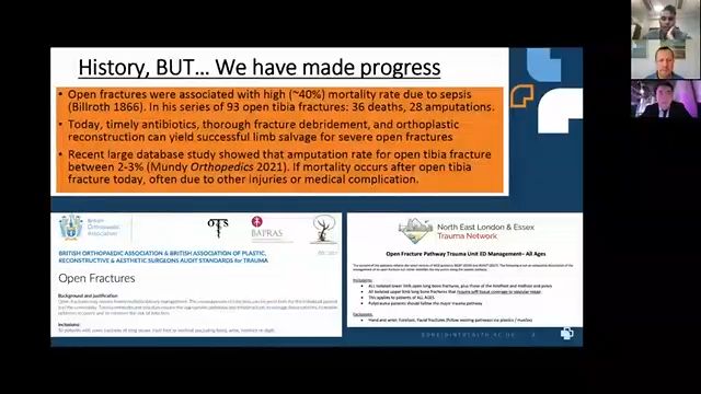 OK. So traditionally, we've um looked at pretty high infection rates with open fractures and previous results of about 40% infection rates um have been published in the past. This is now much better with type one. Gusti fractures almost almost the same as a closed fracture, maybe 1 to 2% higher. Uh Obviously type threes are still carrying a significantly higher rate. Um And I think this is all due to the fact that we've recognized that they need special treatment and I think everyone knows about the boast four guidelines introduced in 2017. I'm not going to particularly go through the entire dose because I'm assuming everyone is, is with it. Um And then the introduction of the trauma network where um open fractures are sort of streamlined into centers which are used to dealing with these types of injuries has improved outcomes for patients and each trauma network has a slightly different pathway, but they all pretty much mirror boast for and I've just put a screenshot up of our one which covers quite a large population of Northeast London and Essex. Um There is a still um an a, a risk of amputation with open fractures. Um But now, um quite a large study fairly recently and it's about 2 to 3% which is pretty low. Ok. Next slide. Yup. When I think of open fractures, I generally think of high energy ones and low energy ones to try and keep this simple. Um So this is um so the X rays I've put up here are of real patients um that I've treated at the Royal London. Um So with low energy fractures and we see them from time to time. So most of our geriatric fractures go to a different hospital, but if they're open, uh they come to the Royal London. Um So there are special considerations with these patients. Obviously, they've got other comorbidities. Their bone quality is not as good because they've got or they tend to have a background of osteoporosis and their skin tends to be of poor quality. So that makes your soft tissue reconstruction options a little bit more challenging. So, with these geriatric open fractures, you tend to see a typical pattern um often of the distal tibia. Um And I don't know if you guys have seen this in your own hospitals. Um You tend to have sort of a, a transverse intramedial wound where the, the, the medial, so it's a valgus deforming force and the, and the distal tibia has, has popped out immediately uh creating a tear in the skin. So it's a in out type injury um, so there's different ways of treating these and I don't know if anyone wants to hazard a guess as to what we've done here with the x rays that I've put up. So if you debride and you've docked the proximal segment into the and looks like you've flattened the distal. Yeah, exactly. So, with some of these, again, you have to tailor this to the patient you can treat these with and, you know, depends on their comorbidities and their mobility before, but you can shorten them. Er so you can shave off some of the bone ends. And if you shorten um to allow er soft tissue coverage, then they don't often need er significant soft tissue reconstructions which may, they may not be fit for. Um you know, that's not always possible, but that's something that, that you can consider. And when you shorten them, er there are different ways of holding that fixation. So here I've used a frame. Um so shaved off the bone ends allowed the medial wound to close and then held it in a frame and then that and you know, you leave the frame on until those bone ends heal, which can be up to sort of six months. Or sometimes we use hi foot nails, um dedicated hind foot nails or sometimes we use a retrograde femoral nail. Uh The problem with that is it um violates the subtalar joint. Uh So patients don't really like it. They, you know, they are in pain post o but in some patients that, that's the only way. Um So next slide, yeah, and then you've got your obvious where you, you know, sort of what you tend to think of open fractures is um, road traffic accidents. Um We get a lot of probably the most, most of our patients are RTC S or cyclists, motorbikes. Um We get quite a few construction site um, injuries. Um So that's a different type of injury where you've got significant um soft tissue injury, um affecting um a a lot of the limb. You can get segmental bone loss, um and you can get associated injuries with that, which you will go through. Um Next one, I think there has to be a special consideration for um contaminated injuries and a lawn mower injury is one but it could be anything really. So we have patients sometimes who have fallen in the Thames. Um And that's obviously a contaminant and, and had an open fracture, which is obviously a contaminated wound. There's a picture there of an open ankle fracture dislocation with um mud. Those are not ones that you can traditionally just hold onto to the next day. So just put a little um screenshot of part of the boast. So you have to kind of decide is this high energy is as low energy and if it's um contaminated or not, cos if they're grossly contaminated, ideally, that patient should go to theater on the same day. Um, if they're high energy, 12 hours, if they're low energy 24 hours, now, this is all well and good, but I don't know how it is and, you know, II worked in various trauma centers as part of fellowship and as a consultant. Um, there are limitations as to what your service can offer. So sometimes here at the Royal London, even high energy open fractures will wait 23 days, er because we physically don't have theater space to get some of these done, which is not ideal and I'm sure that's the same at Adam Brooks and, and elsewhere. Um next load. Um We don't tend to see um that many gunshot wounds in the UK um at the Royal on, we see them every now and again and they tend to be low energy. Um So you have to differentiate whether there's a low energy gunshot wound or high energy. Uh This is a patient I had a few months ago. Um low velocity gunshot wound um with these, they get treated diffe
