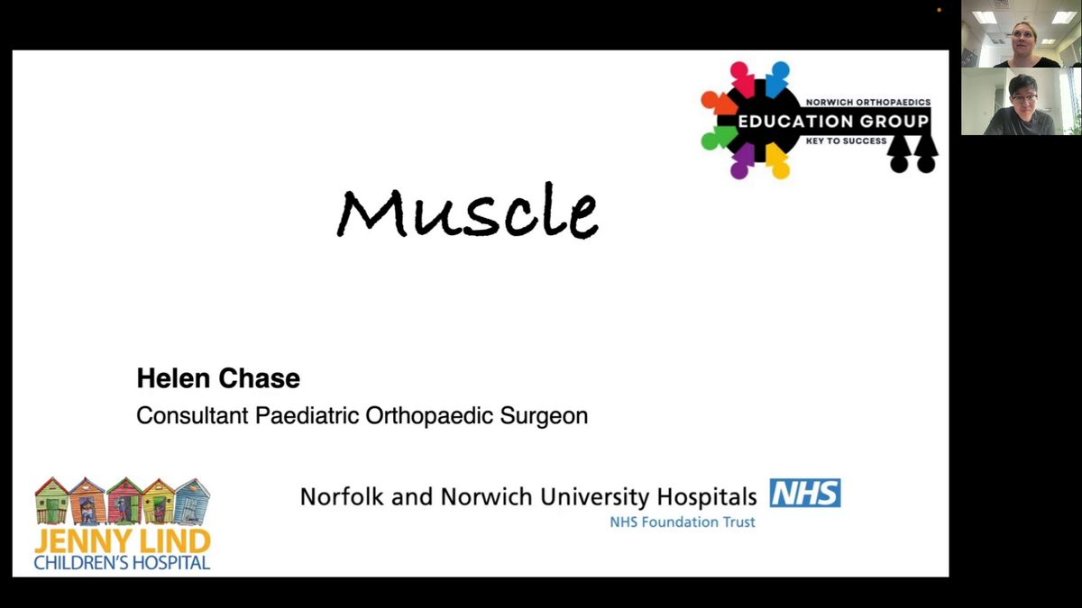 Recording started. Fantastic. Right. So I'm going to be talking about muscle today. I'm trying with, because I don't get on that. Well, with Medal, I've got two screens so I can see you on there, so I can pick on, on the, all your people to ask questions on. So that's why I keep looking up and down is because I've got 22 screens in front of me. Right. So I'm going to talk about muscle. I'm gonna be talking about the anatomy, muscle. I'm gonna be talking about some actions and then I'm going to talk about a couple of disorders which are relevant to pediatrics which affect muscle. Um So, and actually a muscle. So you were all very aware, we spent the last time cutting through them. So we've got a muscle tenderness junction and that's kind of the weak link between where the muscle is, um, is attaching onto, onto your tendon and that's, that's your sort of functional point. Um And that's much more prone to um, uh tears, especially when you're looking at sort of eccentric contractions. Um, and we'll talk about the different types of vacancy you get muscle. Um And So when we look at, um when we look at muscle, we look at this, there's a noncontractile um elements which we talked about and then there's a contractual elements. Um And so we've got a f my seminar f my SIM, it's surrounding the muscle bundles. So that's our sort of uh thick layer around there. And then you've got your fascicle which are within, within the muscle bundles. Um and those, um and there's uh my c um is surrounding it and then each of those vesicles you've got fibers within and the individual fibers are surrounded by endo Missy, okay. Um which also has a really basic sciences, but it's the sort of thing you do need to go for the exams. You can see you get vessels running down it and because your muscle is extremely well vascularized as you, as you discover when you're, when you're splitting a muscle and you find getting off the bleeding. Um So, um the picture at the bottom for those of you are getting close to the exam, there'll be lots of groaning, but you should have seen this picture and you're, you need to learn it and you, the simple fact is, is like many of these things, you just need to know the concept of the, the thick and thin and um filaments. So you've got your thick filaments, which is your um what, what component is that? And if you want to talk, um it's the girl. Um it's the MRI S in excellent, good guess. Yeah. Okay. So you got your Myson, which is your pick, which is your pick full of it. And then what's your, what's the next one? So what's your thin filament acting? Well done, Maria? Thank you. Very good. Right. Ok. So, um, so you're my Bible is this collection of the sort of sarcomere. So these um these little bands which you're looking at there. So, you know, there's microfit bills tiny and then you've got your little sacrum ears. Um And so you've got your thick um my assent, you've got your thin little um acting and then you've got the lines in between and I always have to sort of remind myself in this, but this deadline is the sort of link between your acting's. Um the H band is your myosin, your eye band is you're acting and then your a band is a combination of both your, your acting and your Myerson together. So when you have a contraction, the Eben stays the same length where the H and the I shorted. Okay. So you have some contractile elements of some long contract elements, okay? You want more detail than that then uh you know, you need to. So how does that happen? So what happens? Well, we've got the, the neuromuscular junction, they've got a motor input. So, um who's next? And can somebody tell me what happens at the, at the motor endplate? Um in order to get the, the signal from, from the nerve to the muscle, um you get a nerve Axion potential reaching the uh um uh reaching the nerve terminal which and the deep polarization causes release of acetylcholine from the vehicles from the nerve terminal, which then binds to uh nicotine except acetylcholine receptors on the muscarinic muscarinic side muscle side which causes calcium channel, voltage, voltage gated calcium channels to open. And then you get deep polarization of the sarcomere and contraction. Yeah, very good. And, and so I don't know, I never particularly I didn't listen to medical school, but I had to learn the stuff for the F R C S and then probably forgot it. But it does sort of come back when you, when you remember. So, you know, last alkaline is um uh is released. Um What's happening is your sodium channels of depolarizing, which is what's causing Astelin Kaling to go. And it crosses that cleft that you can see on there. It's as primary left. The troponin comes across the left. The A CH binds to the uh to the receptors causing that that release of calcium, calcium and binds the troponin went. And then that means the maya trope trope mycin then sort of exposes those Miocene receptors, the acting then attaches to the myosin and that then causes your ATP breakdown which causes your contraction, clear as mud, okay. And the relevance for for and those of you who again are close to the exam. We'll know that people have been asked this recently. An exam is how does botulinum antitoxin? I should say work. So we call, call it Botox. Botox is of course the, the sort of trade name there's Botox as dis port. But how does, how does botulinum toxin? So you've got some pictures there. But if somebody want to talk me through, go on a G. Mhm. Uh So where is that picture? So both uh a paper from round Metandren uh Eastwood, but essentially um snare protein is required um attached to the Astelin calling physicals. So that you then so on the picture on the left, the vehicles then attached to the snare protein um then it releases that your ass style calling. So Botox when you put it in the neuromuscular junction or botulinum A in clinical practice is that it then cleaves your snare protein. So your ass style calling is not released because the complex 