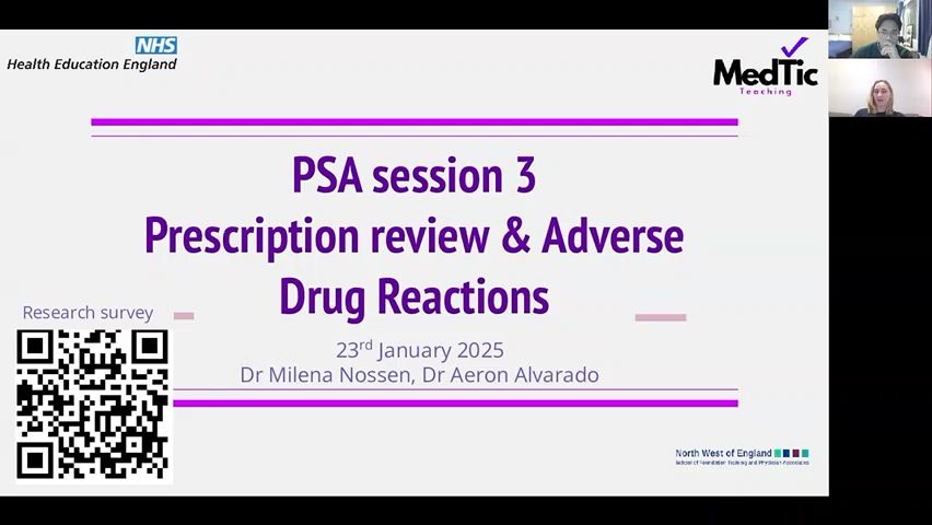 One that's doing that. Still doing ok. And are you able to let me see? Oh, I can. Oh, yeah, I can. If I click on it, that changes for you, doesn't it? Ok. Yeah. Yeah, it changes for me. Ok. Ok. I will keep an eye on, on the chat then and answer any questions that come up. Amazing. Thank you. Um, yeah, I think that sounds great. Let's just wait for people to join. Um, three months. Yeah, we've got some people already here. I can see. So we'll just give a few minutes and then hi, everyone who, who's already watching and we'll give you a few minutes to let people join and then we can start, um, if you could just let us know if you can hear us just so that we, you know, we're not doing, uh, we're not accidentally just talking to ourselves just like a, a yes or a thumbs up would be appreciated. Deathly silence. Ok. That is racially. Oh, wait on the chat. Yeah. Ok. Mhm. Oh, also those of you who, um, are here already if you feel like you have a spare minute, if you don't mind scanning the QR code, there's a little, um, survey that we're doing at the moment. Um If you could spare us a few minutes for that, that would be great while we wait for the rest of you guys to join and we're just gonna give one or two more minutes and then we can get started. Ok. All right. I think, let's get started here. And do you mind just waiting yourself for the moment because I think I can hear an echo mix. All right. So, hi, everyone. My name is Milly. I'm one of the F one doctors working in East London at the moment. And, um, yeah, I'm currently working in Psychiatry and I'll be doing your session today on A PSA and I've got Aeron with me, Aeron. You can say hello as well if you want to help yourself for that. Um, if you want to. Hi, good evening. All. My name is Erin. I'm one of the, uh, military F I ones currently working at, uh, in the northeast. I'm on vascular surgery. So, prescription review and Ad Rs. That's just something I do almost every day. I'll just be monitoring the chats and, uh, doing some polls and things for you guys to get some interaction. Thank you for joining. All right, let's get started. So, this is our third session of our PSA series that we're doing at the moment. So we're gonna be focusing on prescription review and adverse drug reactions two of the sections are covered in the PSA. Um, so with prescription review, we want to really ensure that you can systematically review them. As Aaron said, it's something that you'll do on a day to day basis as a doctor as well. Um, things to look out for would be things like dosing errors, contraindications, withholding medications, um, and nephrotoxic medications and adverse drug reactions. Again, being aware of some kind of drug reactions that are fairly common. Being aware of interactions with, with drugs itself, the side effects toxicities, um and how to treat adverse drug reactions as well. So we're gonna start by talking about prescription review. Prescription review is after prescription section, your second biggest review, you have usually eight items and it comprises 32 of a total of 200 marks. Um, in terms of how that would break down in terms of the time you should spend in a minute would be 2.5 minutes per question in the exam. You might find that you will need a little bit more time or less time depending on how fast you are. But suggested would be around spending around that much time per question. So, yeah, this is on the top, you can see a picture of what your prescription review would look like. So there you'll have a relatively brief case stem. Um, usually what medications they're on. Um, any examination findings, any negations, often it's compromised of two different parts. So you can see question A and question B. So for example, in question A, which drugs are most likely causing the hematosis? And in um question B, which drugs are most likely contributing to the impaired renal function? Um So you'll have to think about the same amount of drugs twice if that makes sense. Um And then you just click them, always make sure that you look at how many prescription they want you to review. So they could ask you to look at one or two or three different ones. So make sure you read that very carefully. Um And yeah, that's pretty much all on the format of prescription review. We're gonna do some questions now. So we're gonna spend time put um doing five questions on prescription review. So question one, I'm going to read it out. It's quite short. So it's a 3033 year old woman. Um She comes to the GP with palpitations. She as part of her workup for a palpitation. She ha she has an ECG um in terms of her past medical history, she's got recurrent thrush, she's got hyperthyroidism and she's got depression and anxiety. Her drugs are listed below. Um There's no known drug allergies and her EC G I've just summarized for you guys. So it is sinus rhythm and rate is 68 BPM. Pr interval was 0.12 seconds. The C is normal. So less than 120 the Q TC is 0.52. So my question for you guys now would be which drug is most likely responsible for these ECG findings. I'm going to give yourself around two minutes and let me, yeah, try and use the poll if you can. So you can click away on the pole and then click back to Advir Chat as well. OK. Keep answering. I can see six responses already. Sure. Don't. I think I saw that. I'll just keep it going for a second again. One thing I should have probably mentioned, feel free to use the BNF for this. You can use the BNF in the exam. Yeah, for, for these kind of questions. Um I was just saying to Millie at the start that uh my control F key just started to kind of light up. Um Yeah, but um if you're familiar with, with the kind of common side effects, then it'll just speed you up. But if in doubt, yeah, you, you should have the B NF up on one side and then the question on the other in the real exam. Um Yeah, we can talk a bit more about the practicality and how you would do that. There's different options on how to do t